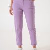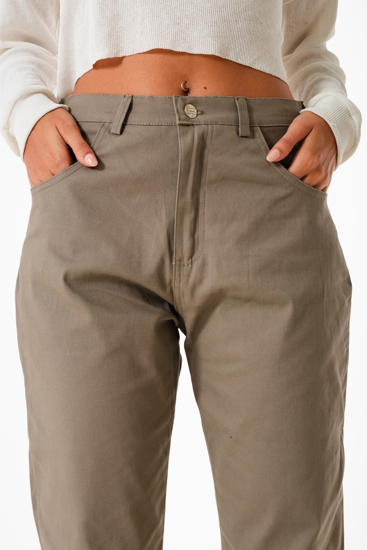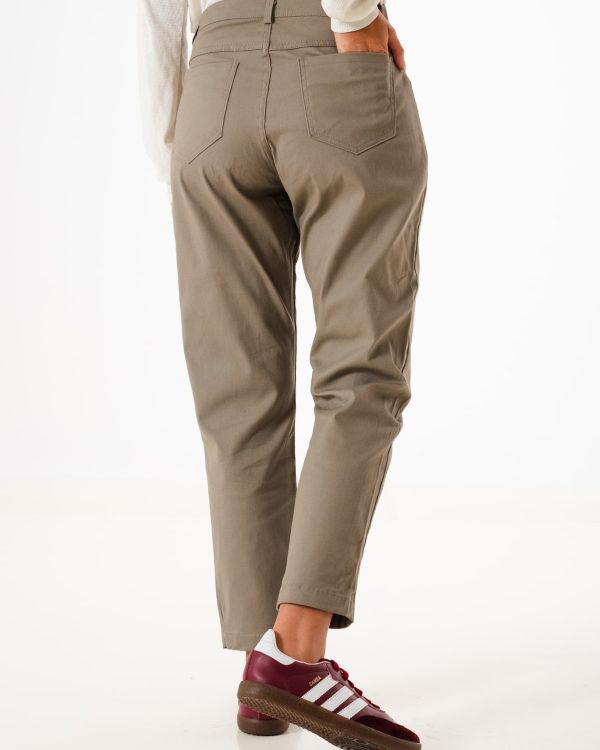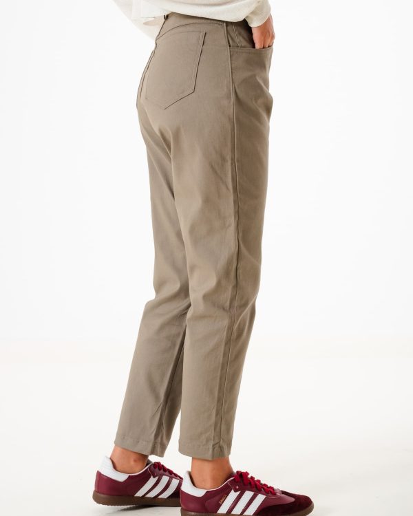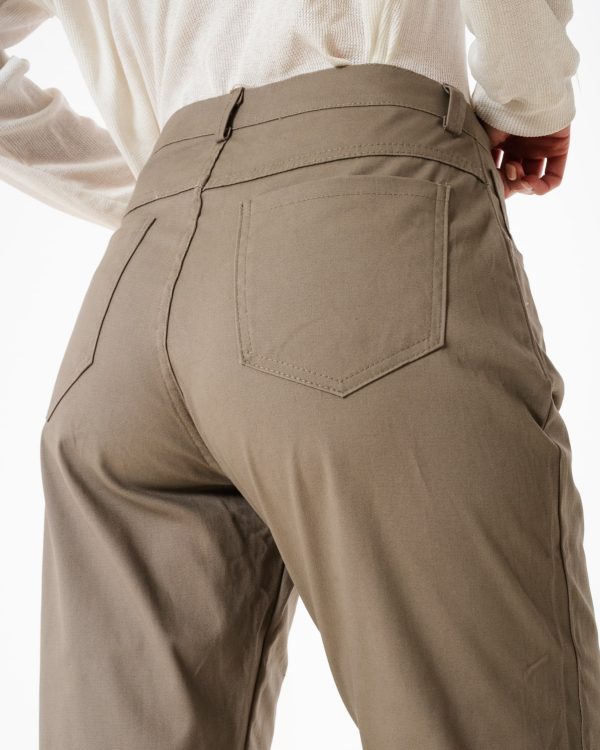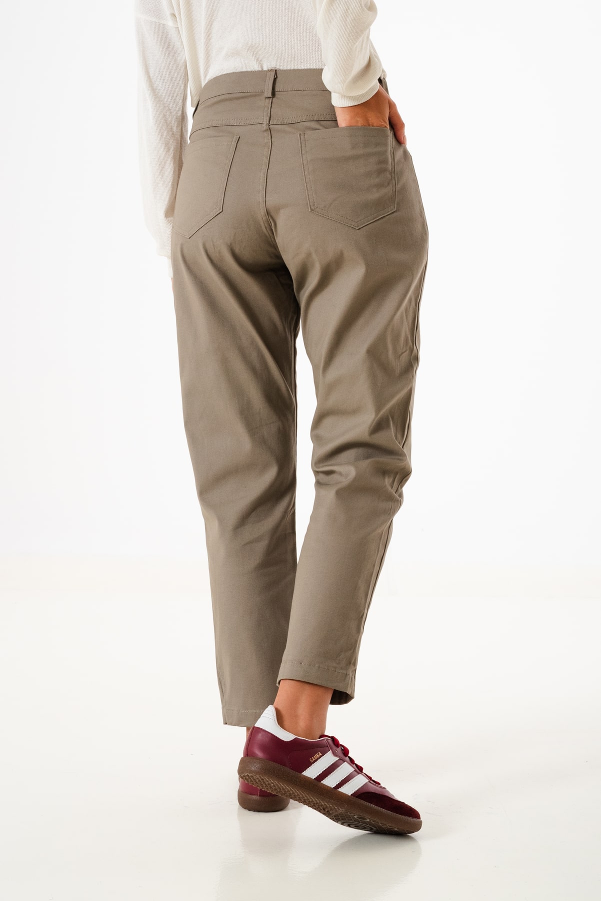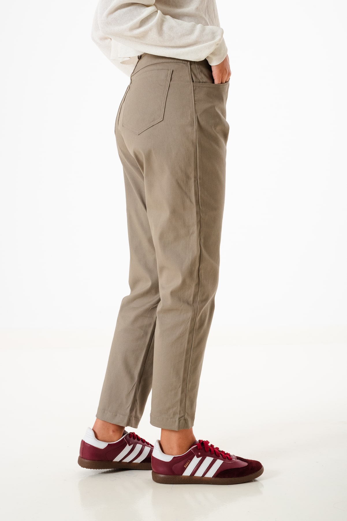 Pantalon estilo mom fit confeccionado en tela de gabardina con detalle de bolsillos, pasacinto, cierre y boton.