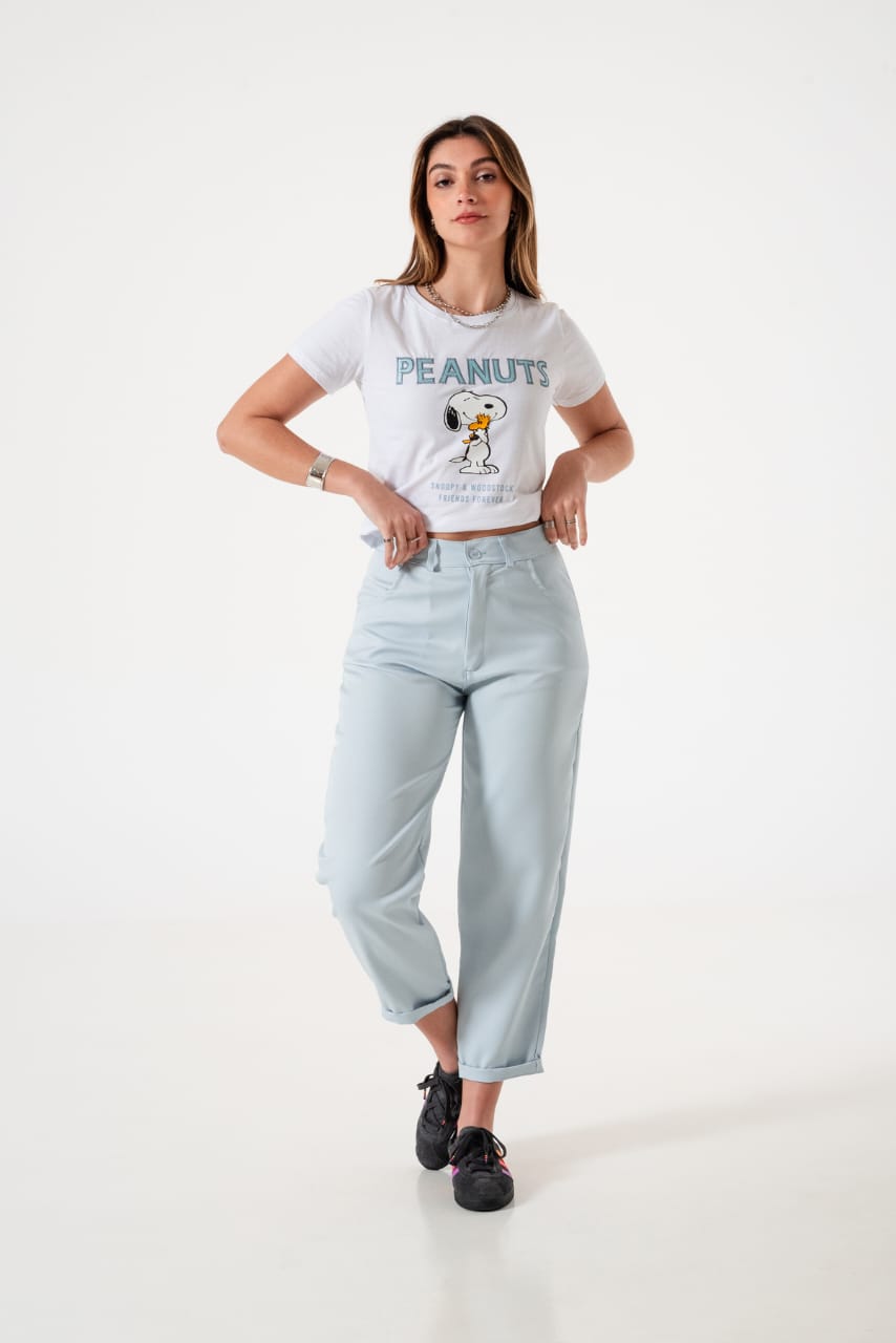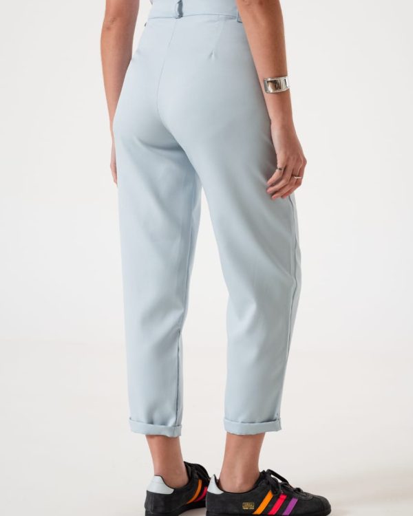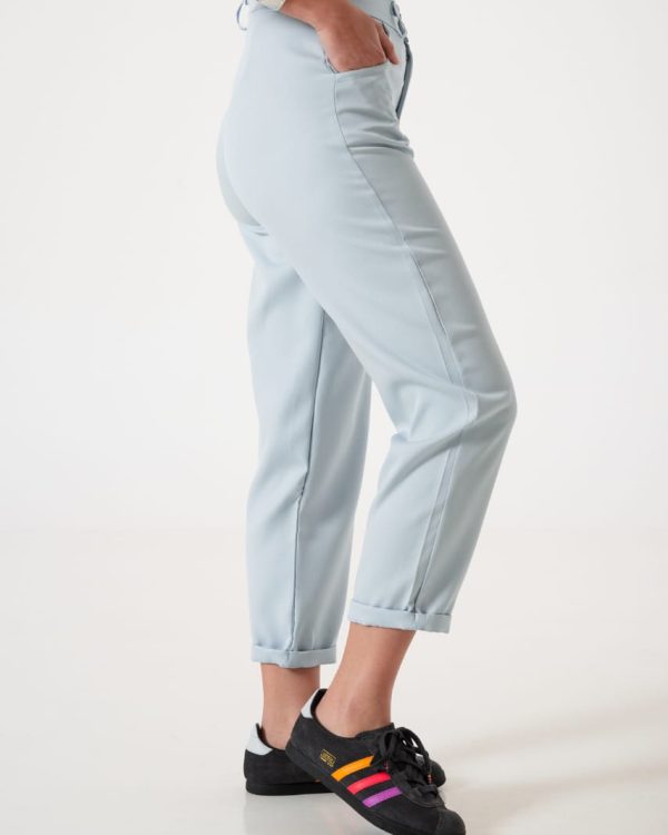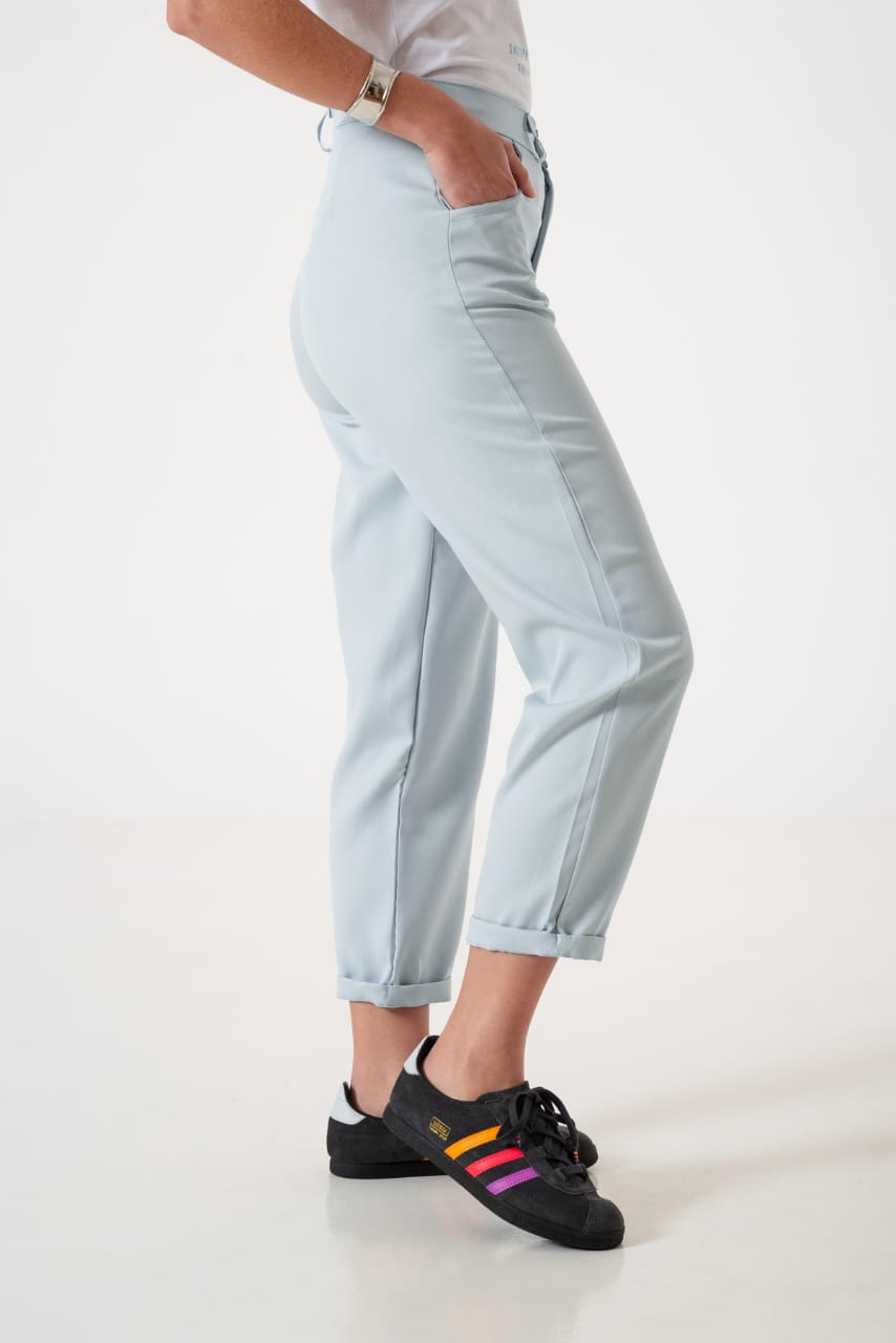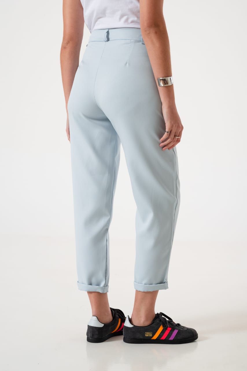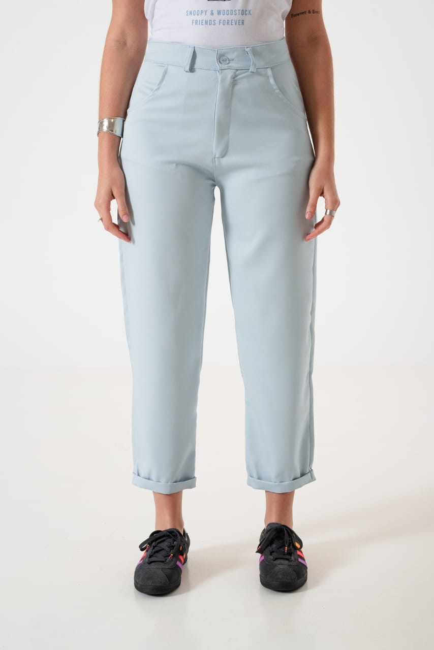 Pantalon estilo mom fit confeccionado en tela de sastreria con detalle de bolsillos, pasacinto, cierre y boton.