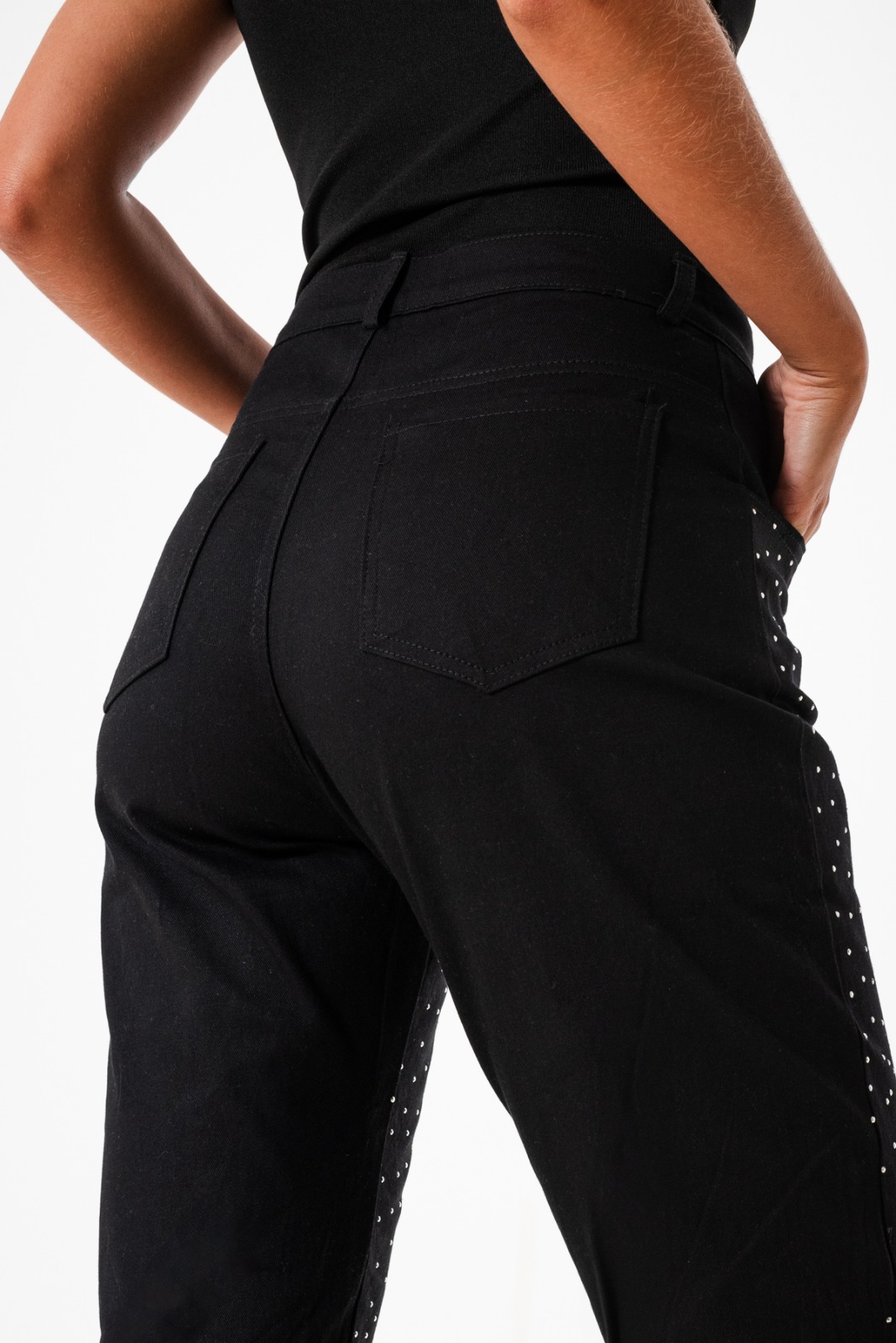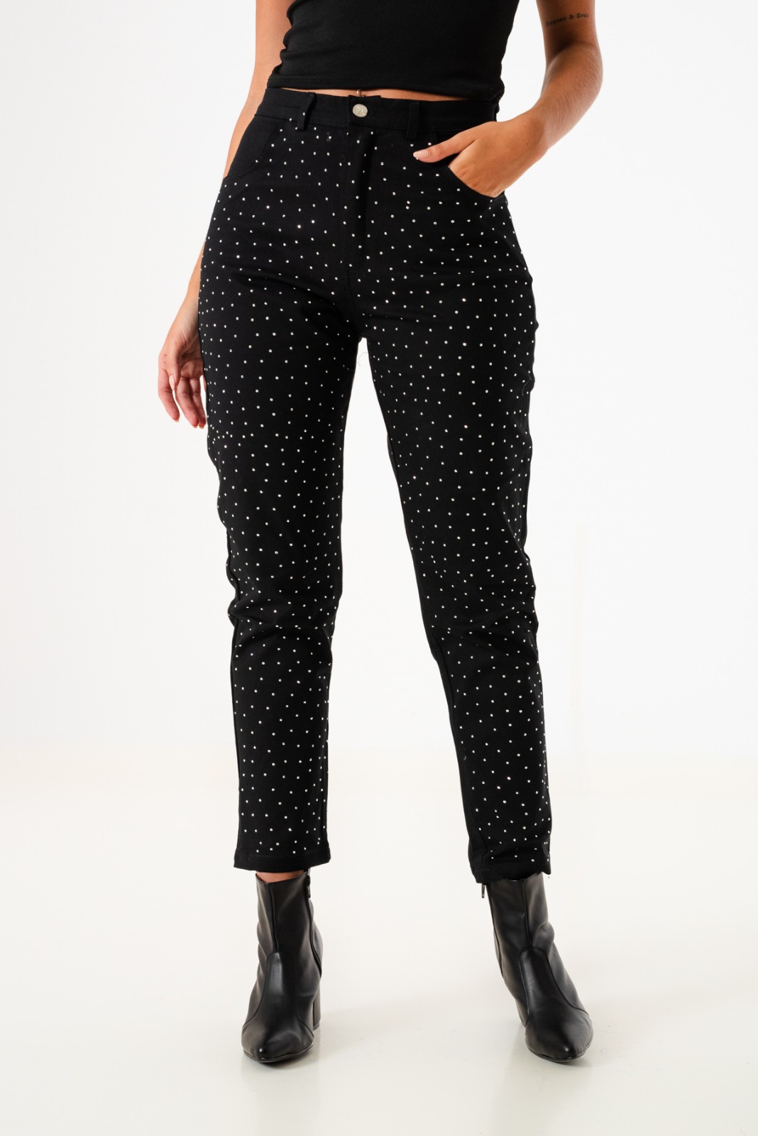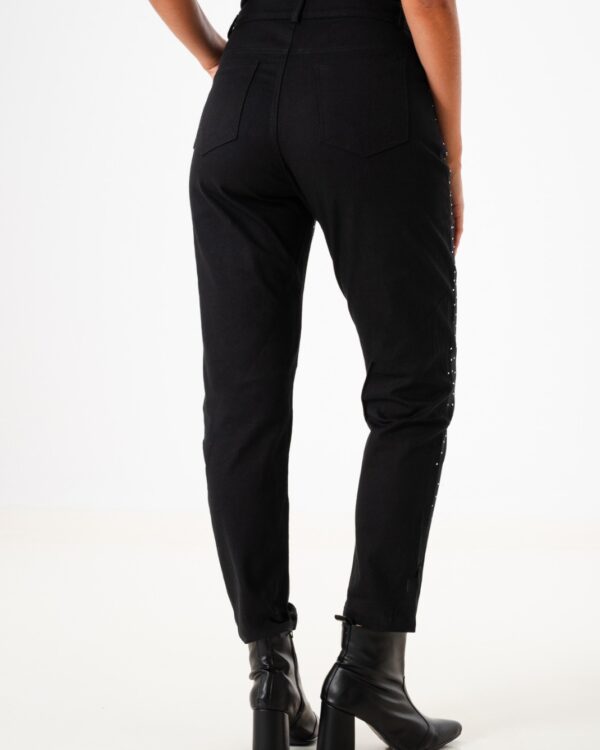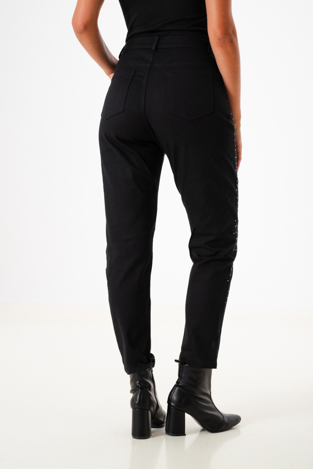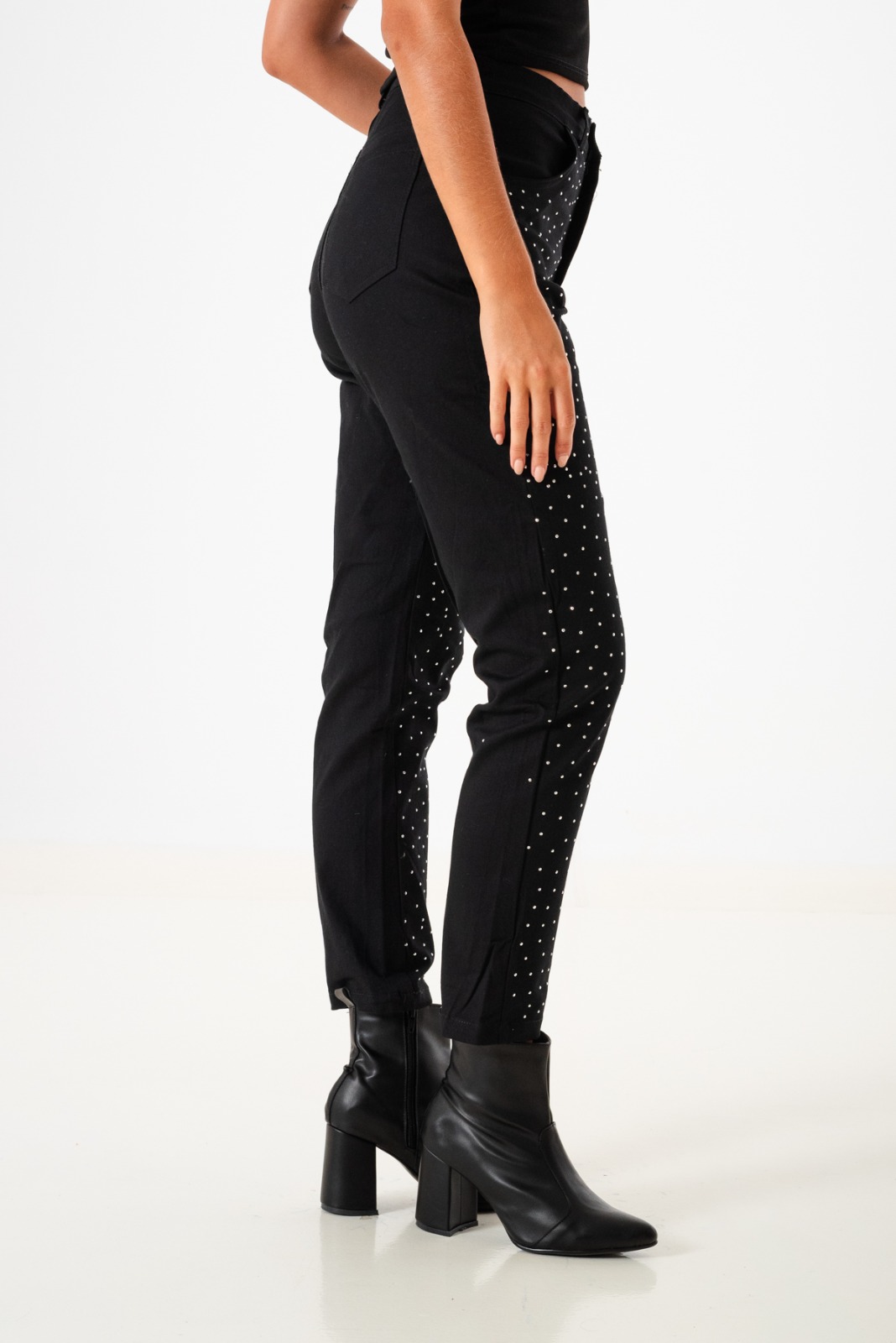 Pantalon estilo mom confeccionado en tela de gabardina con detalle de strass adelante, bolsillos, pasacinto, cierre y boton