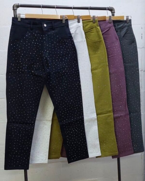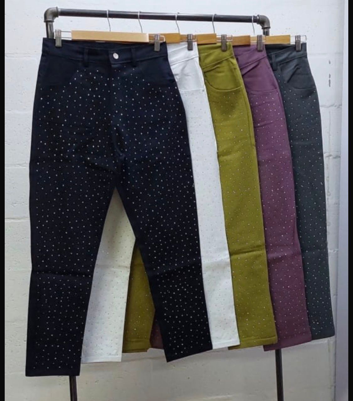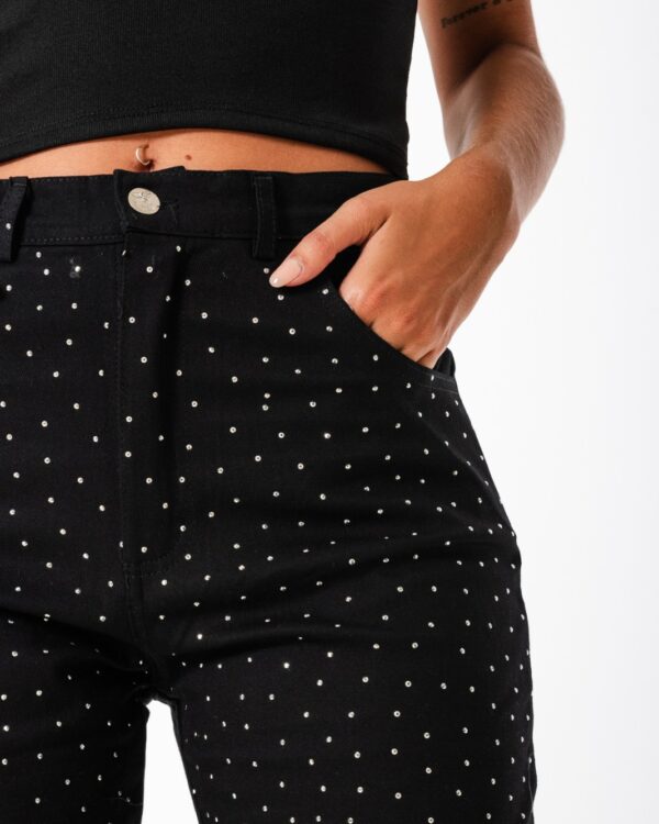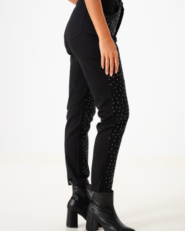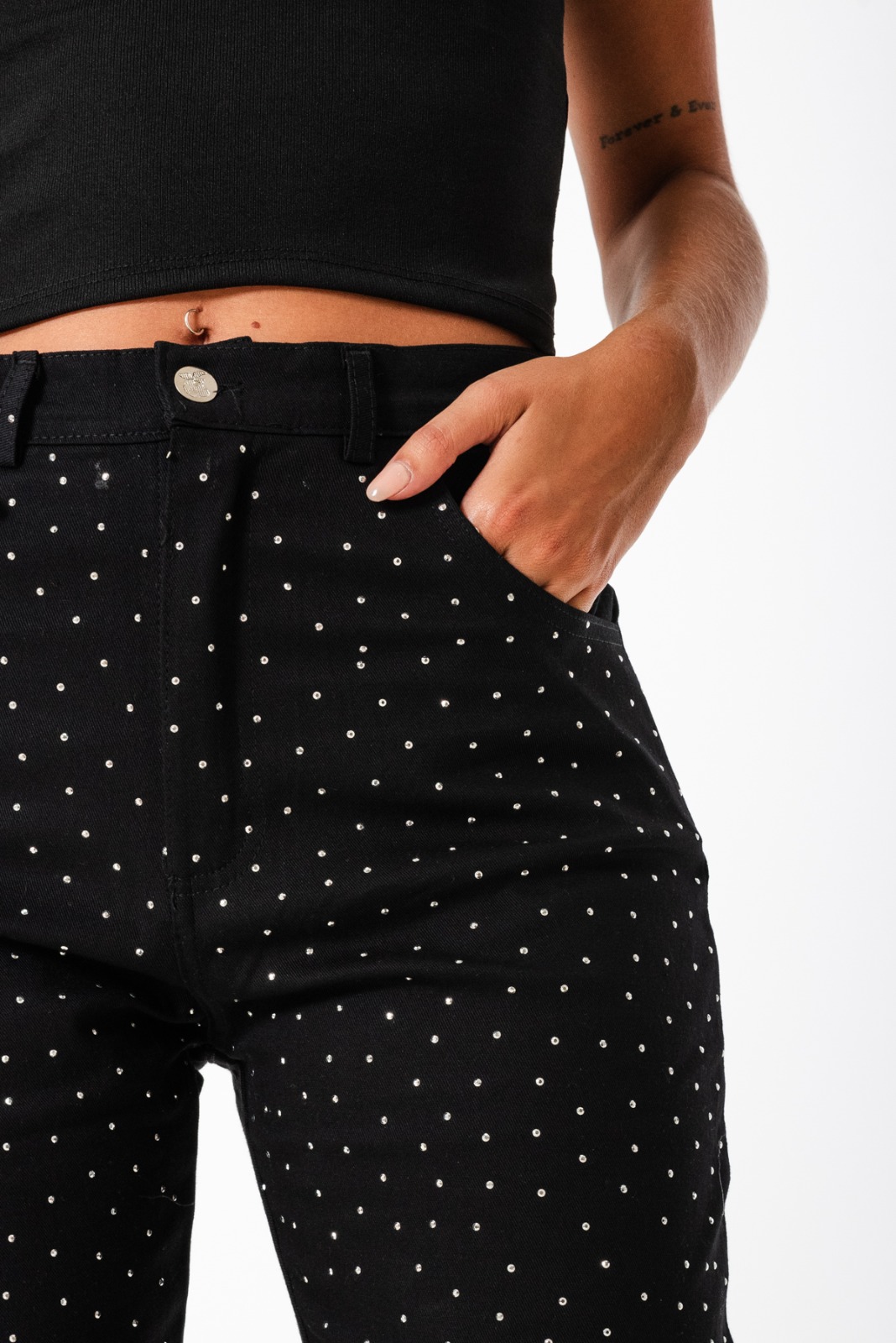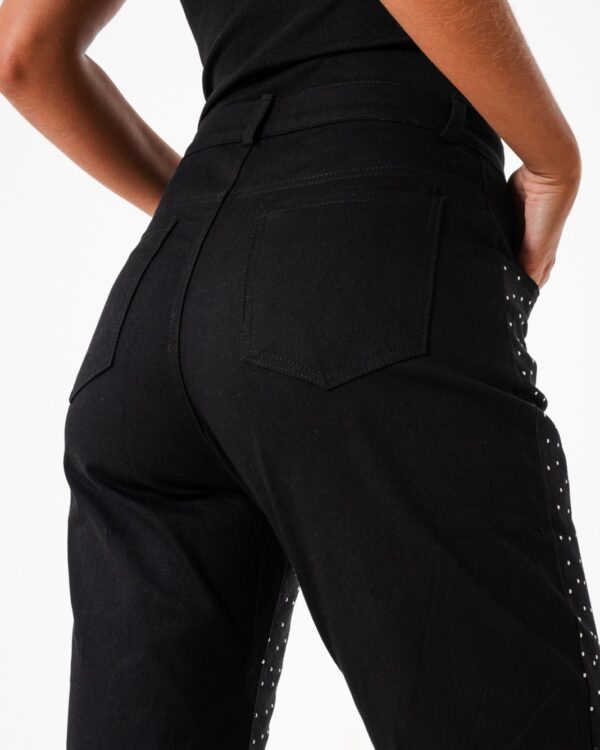 Pantalon estilo mom confeccionado en tela de gabardina con detalle de strass adelante, bolsillos, pasacinto, cierre y boton