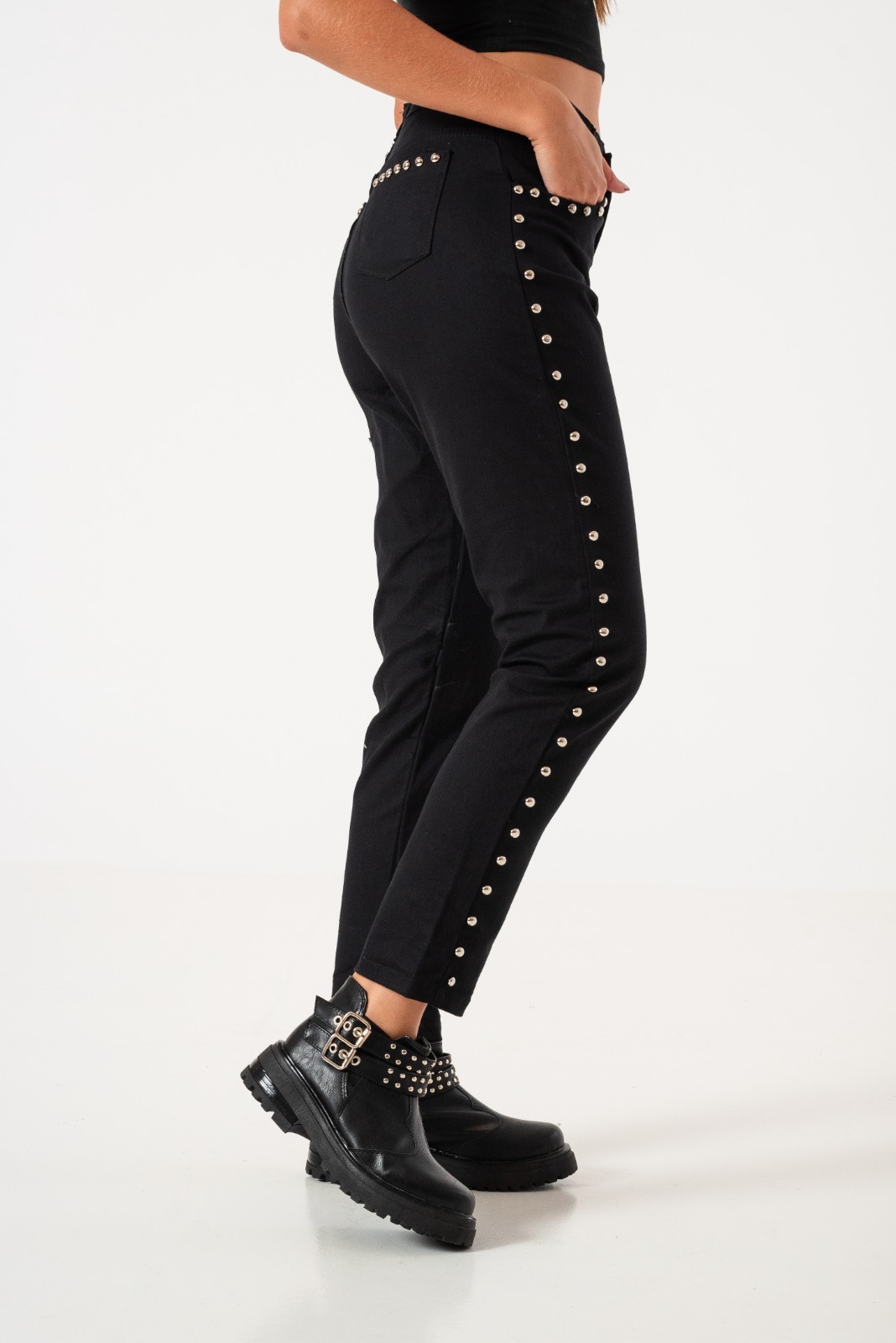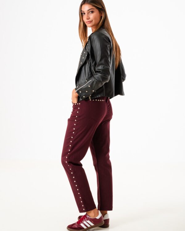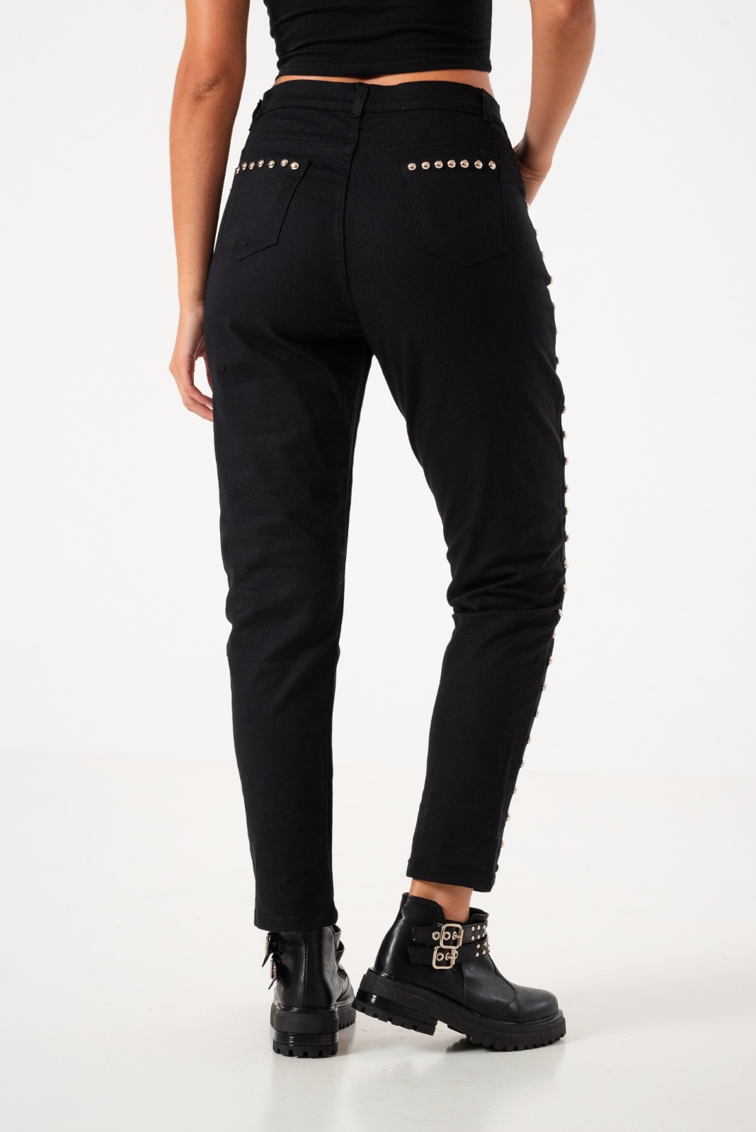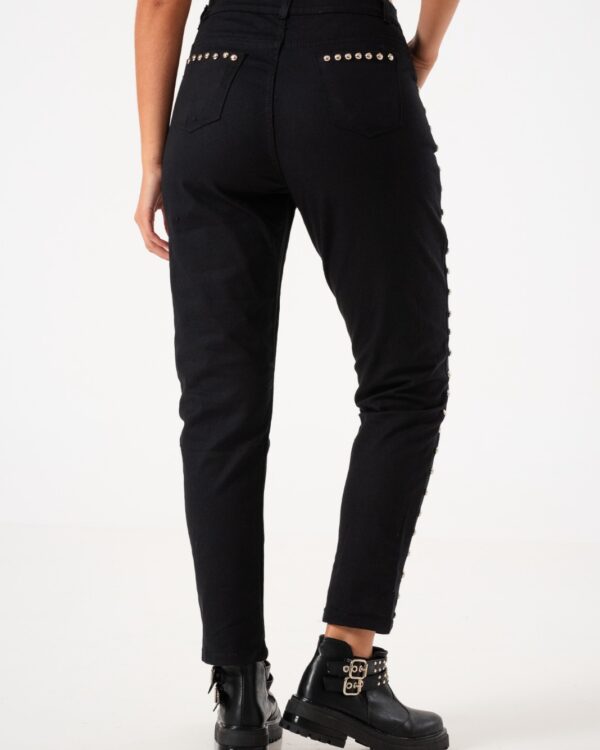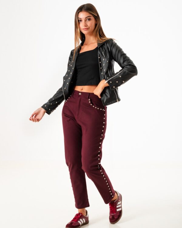 Pantalon estilo mom confeccionado en tela de gabardina con detalle de tachas, bolsillos, pasacinto, cierre y boton