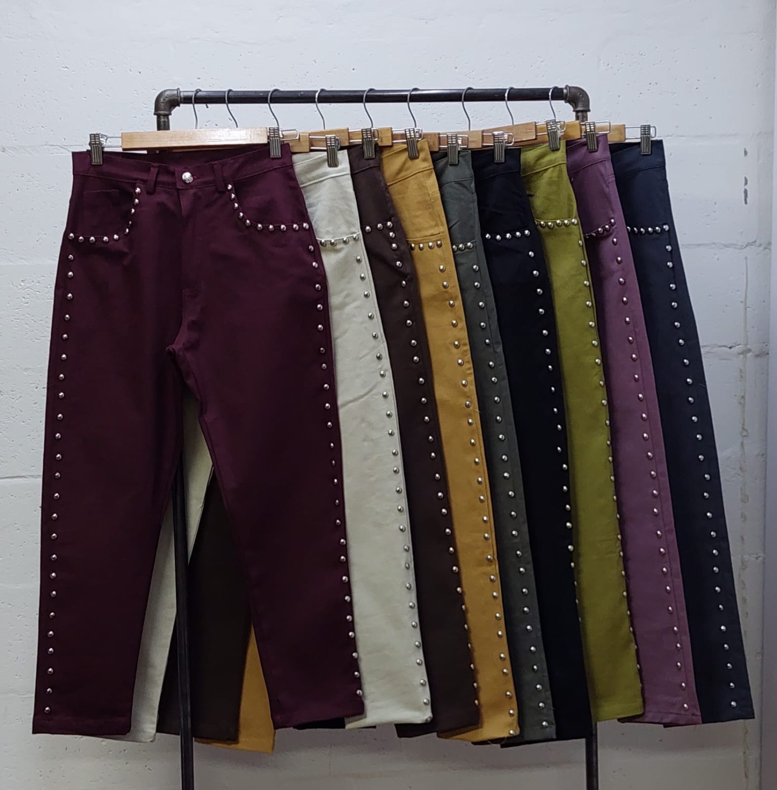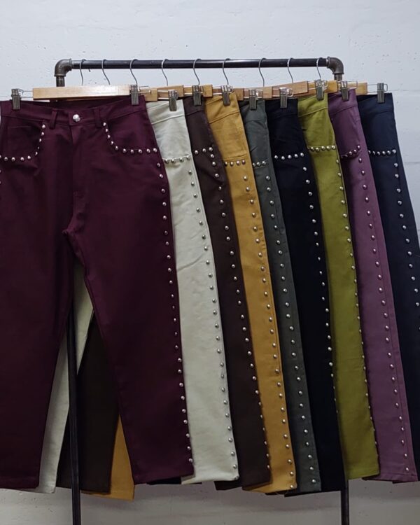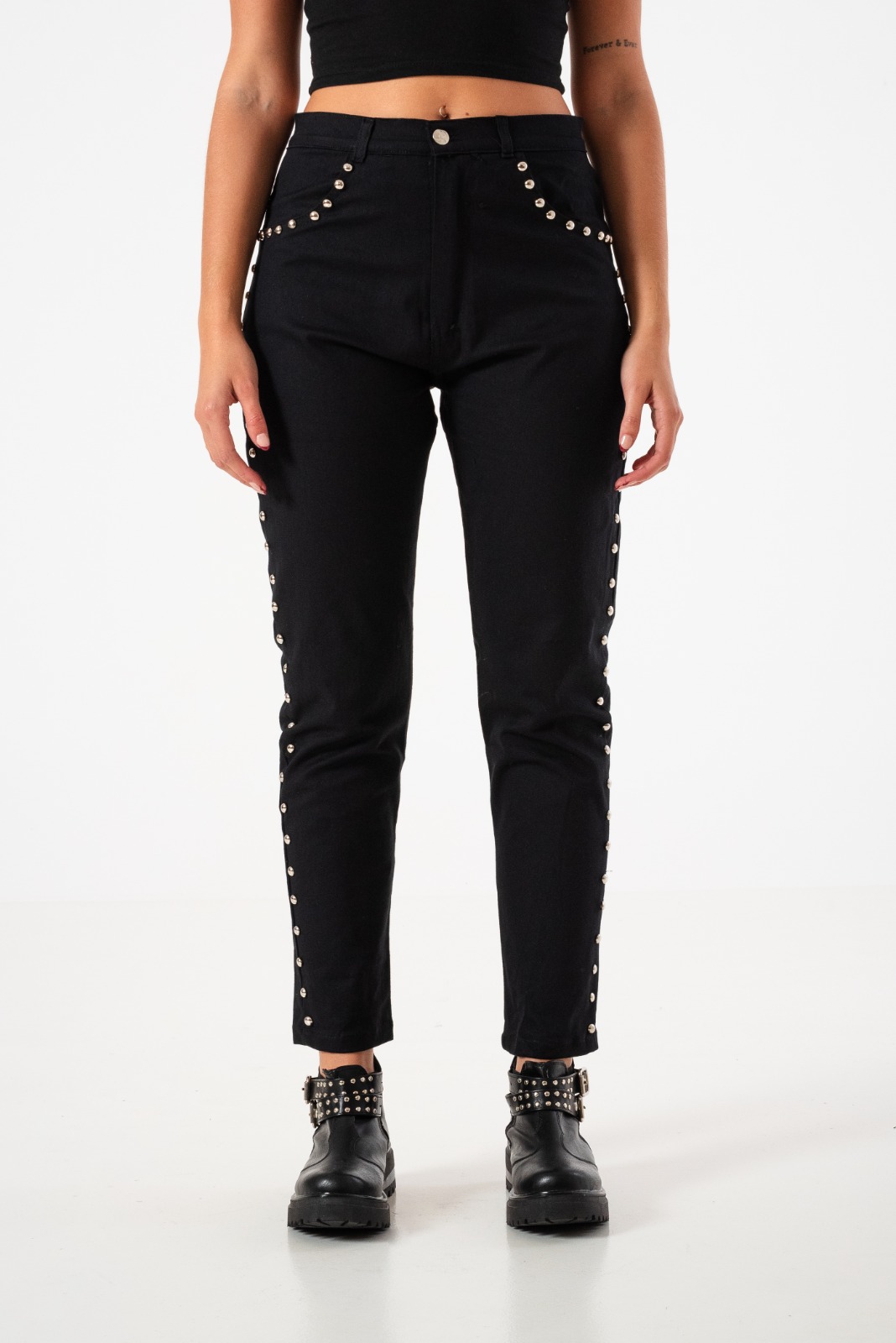 Pantalon estilo mom confeccionado en tela de gabardina con detalle de tachas, bolsillos, pasacinto, cierre y boton