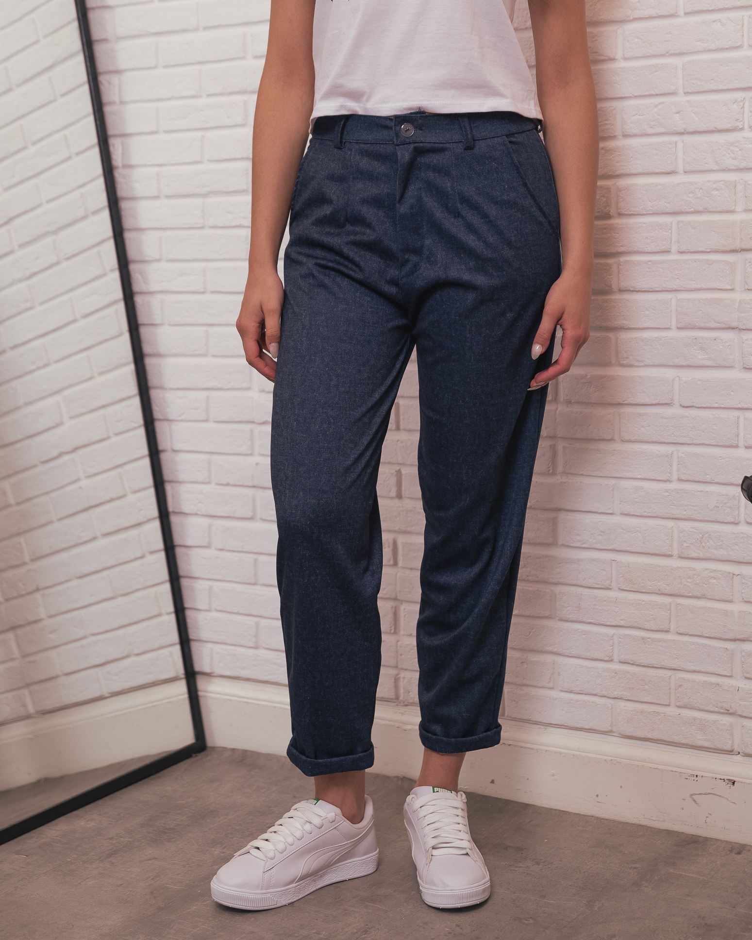 Pantalon estilo mom confeccionado en tela de punto roma simil jean con detalle de bolsillos, pasacinto, cierre y boton.