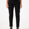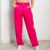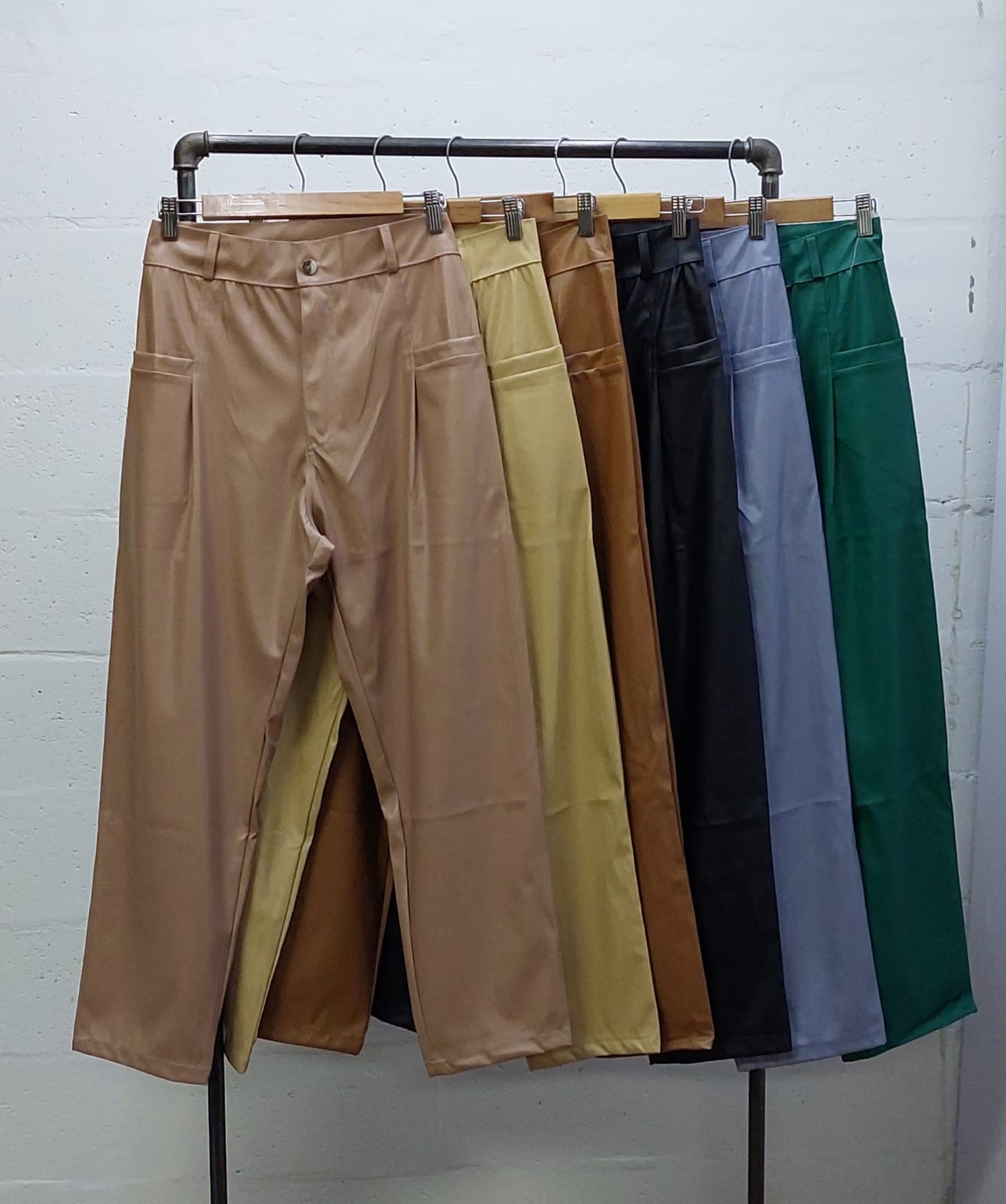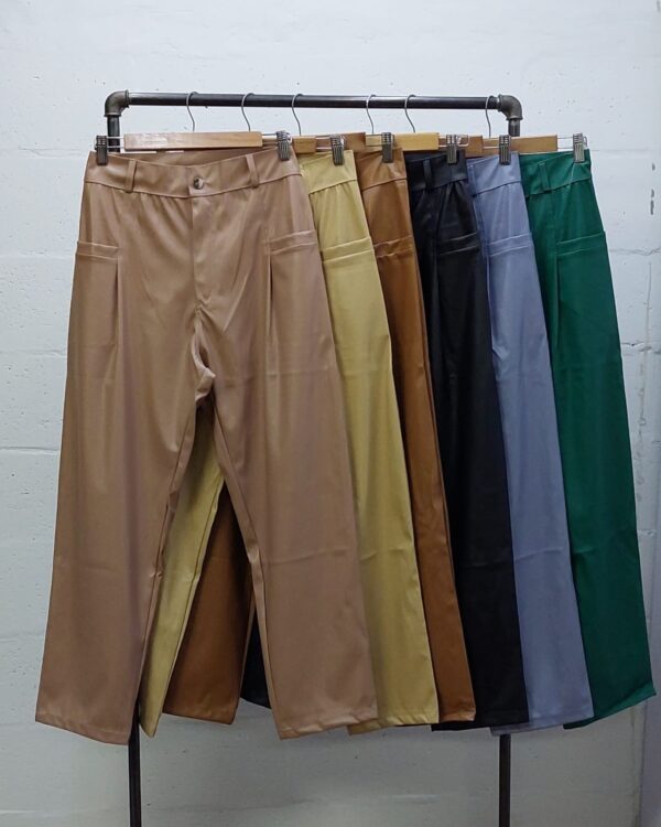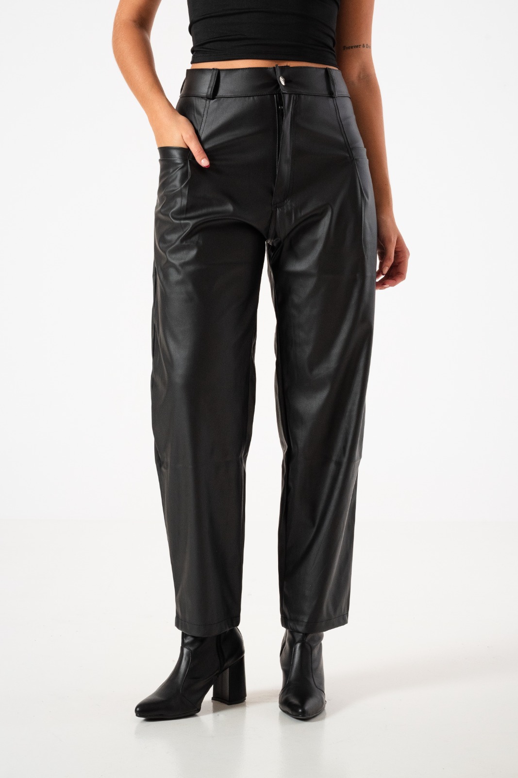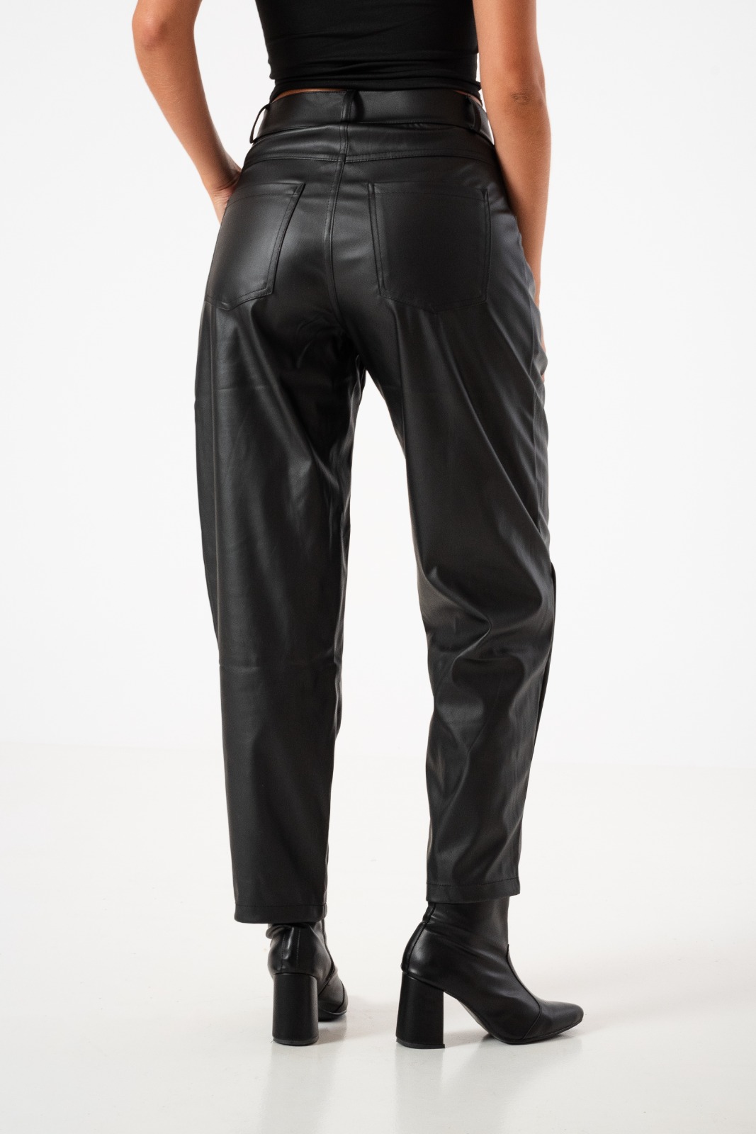Pantalon estilo mom confeccionado en tela de ecocuero con detalle de bolsillos delanteros, pasacinto, cierre y boton