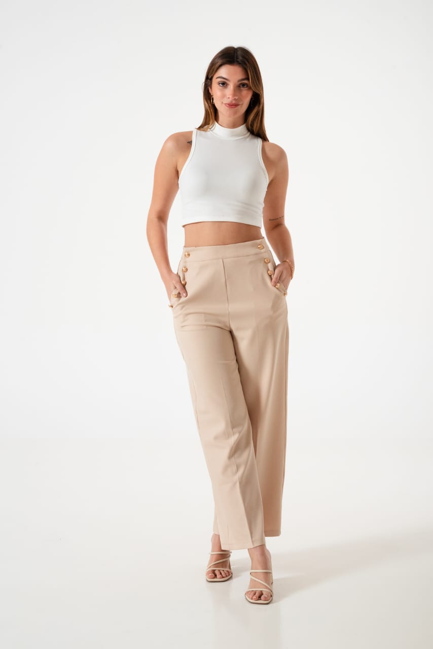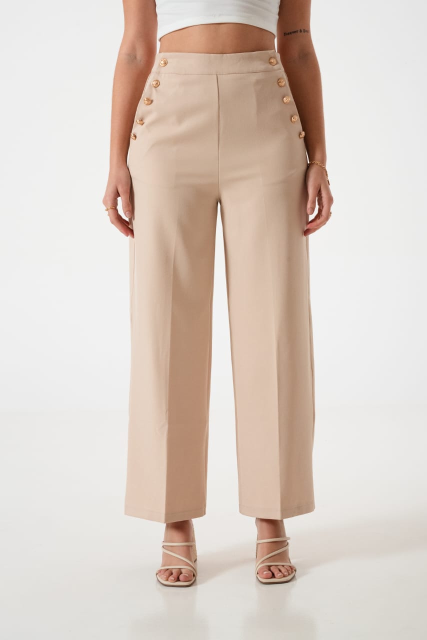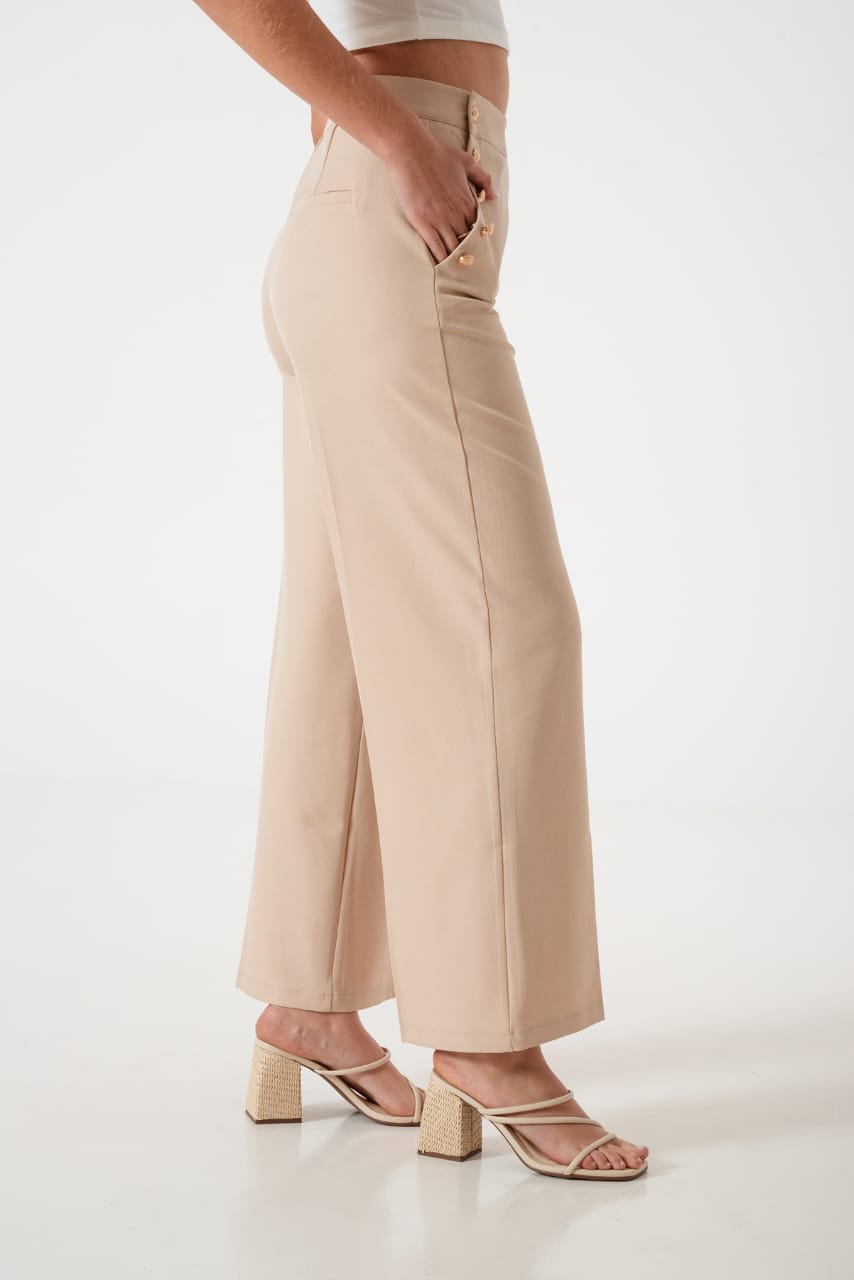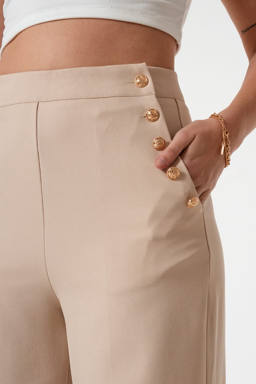 Pantalon estilo palazo confeccionado en tela de sastreria con detalle de botones en sus bolsillos