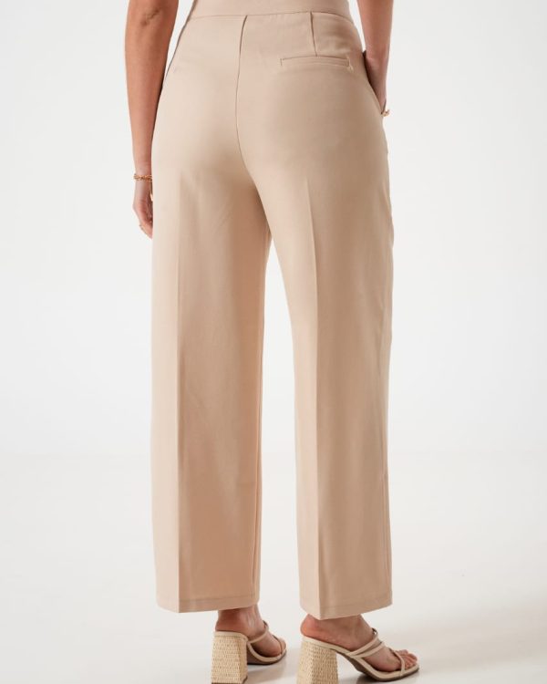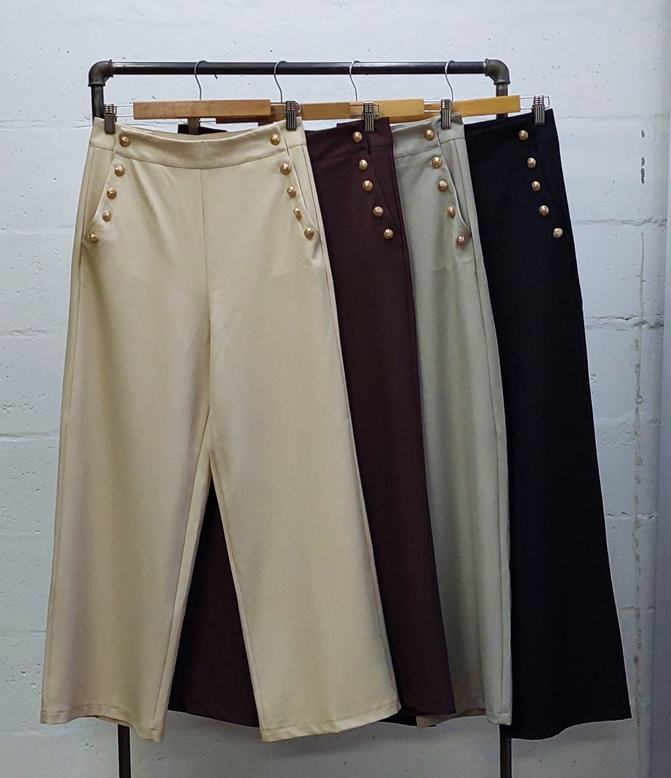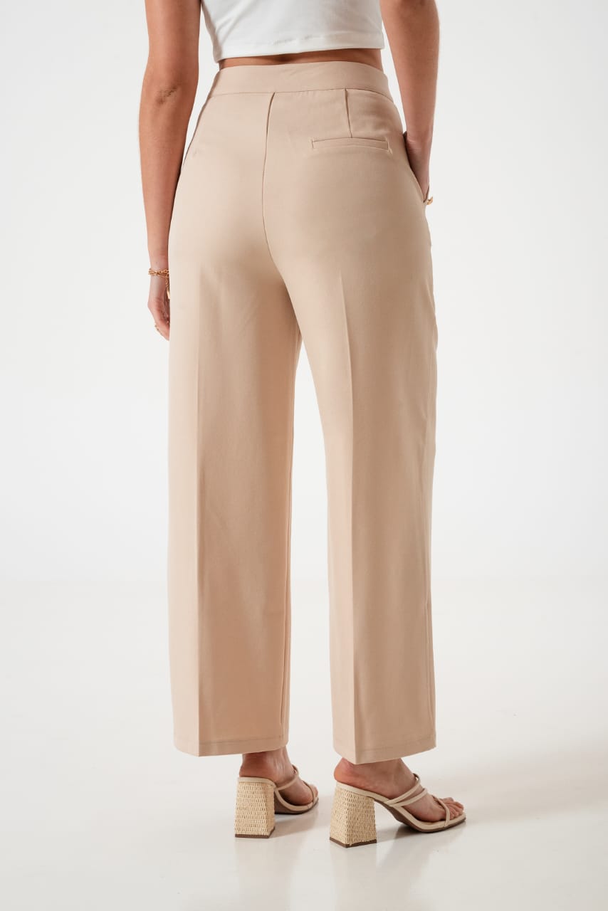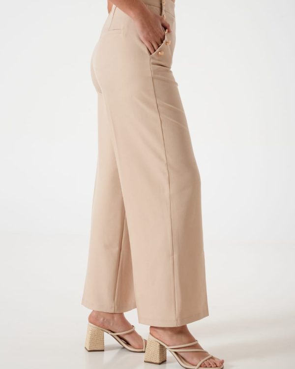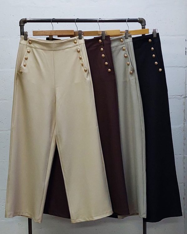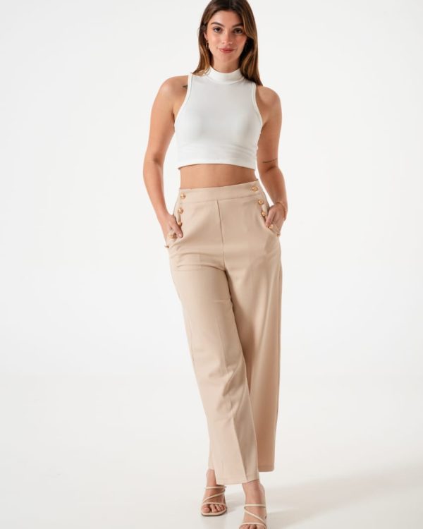 Pantalon estilo palazo confeccionado en tela de sastreria con detalle de botones en sus bolsillos