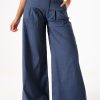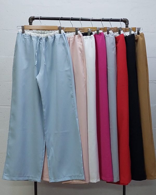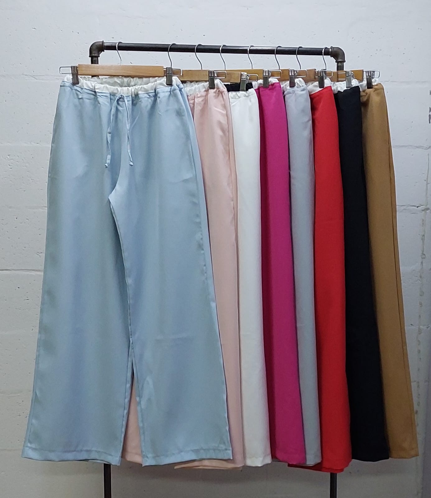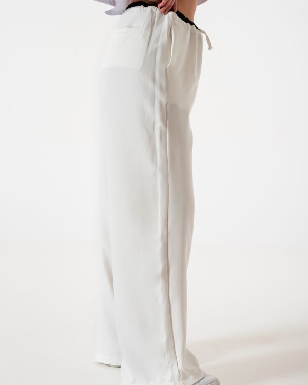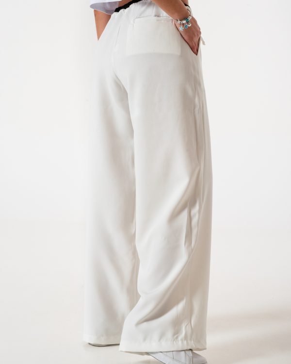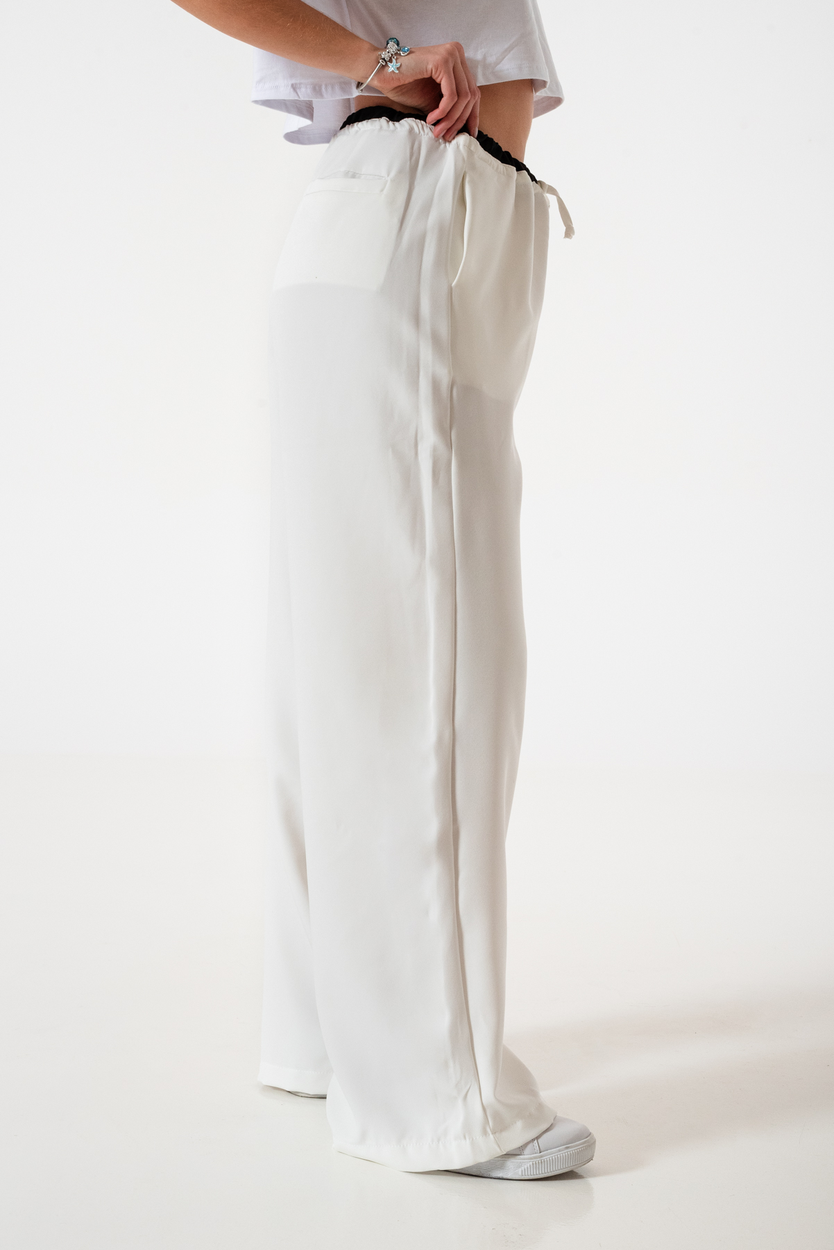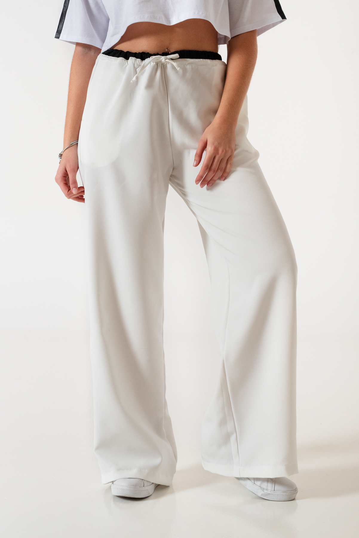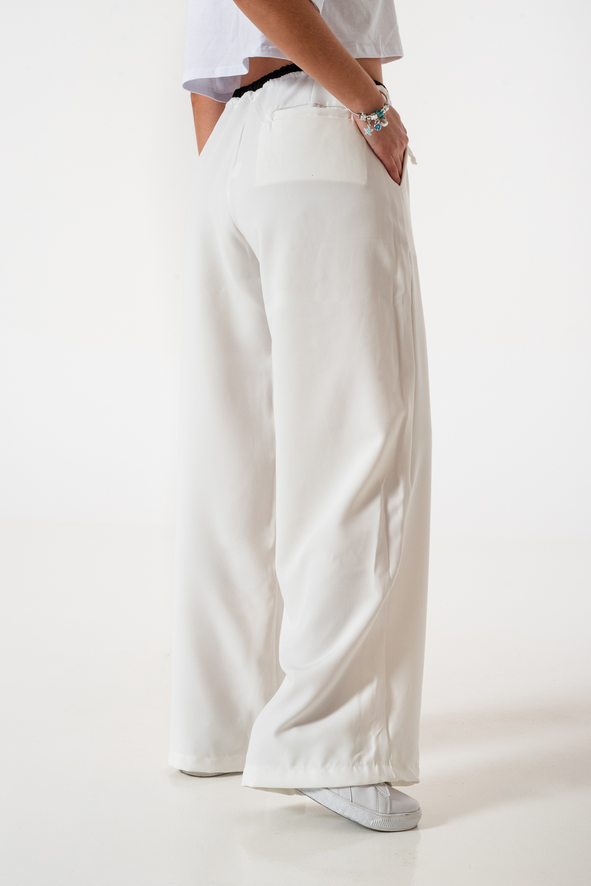 Pantalon estilo palazo confeccionado en tela de sastrero con detalle de cintura avispa, bolsillos y tiras