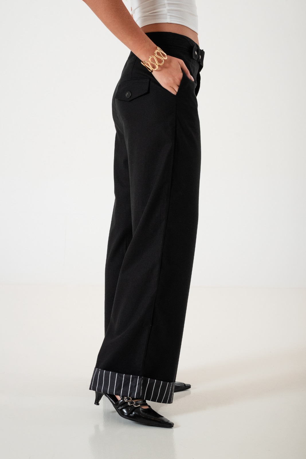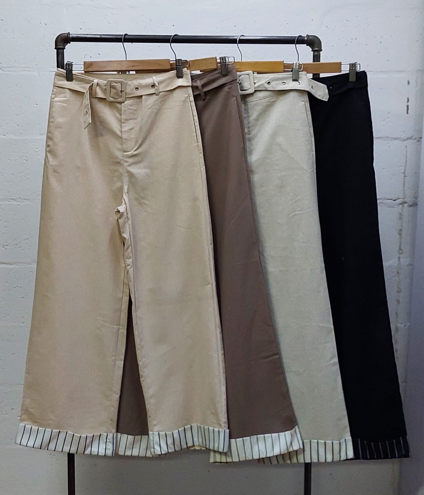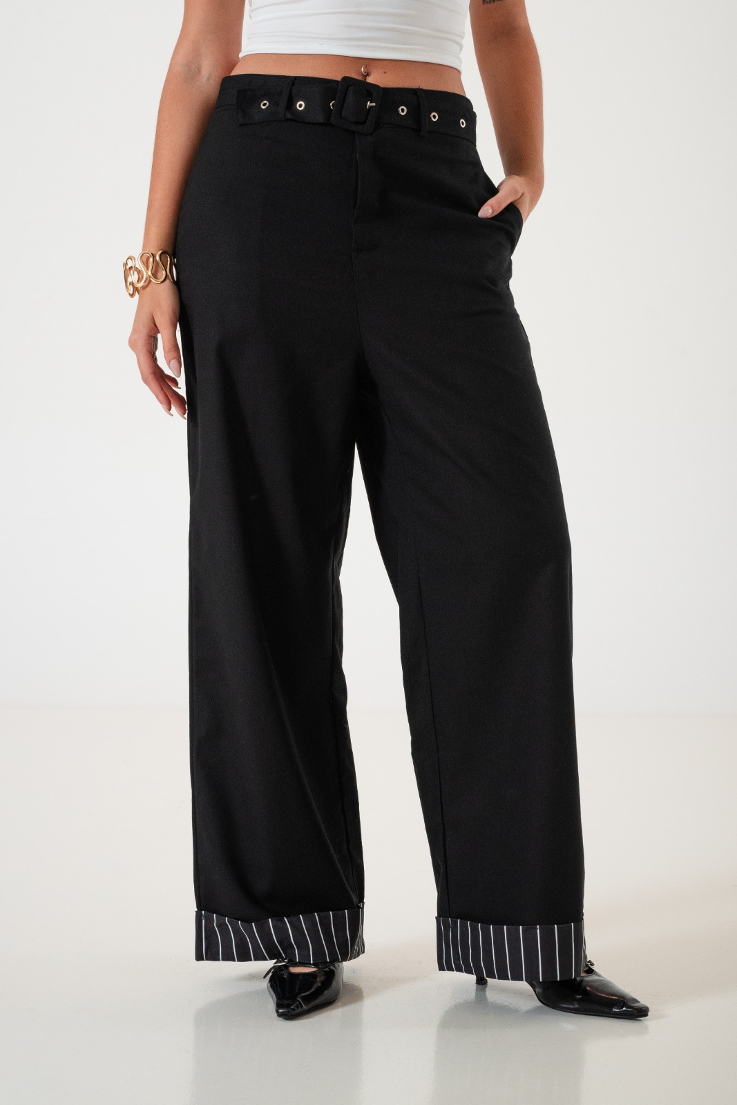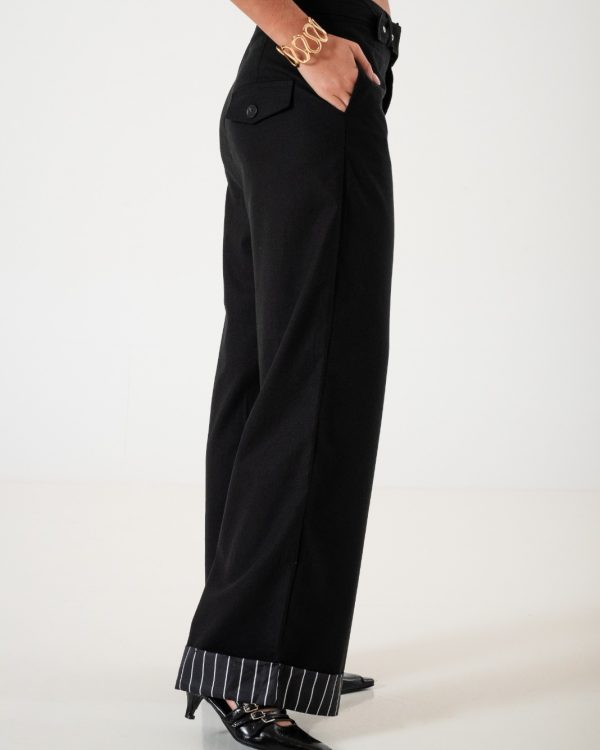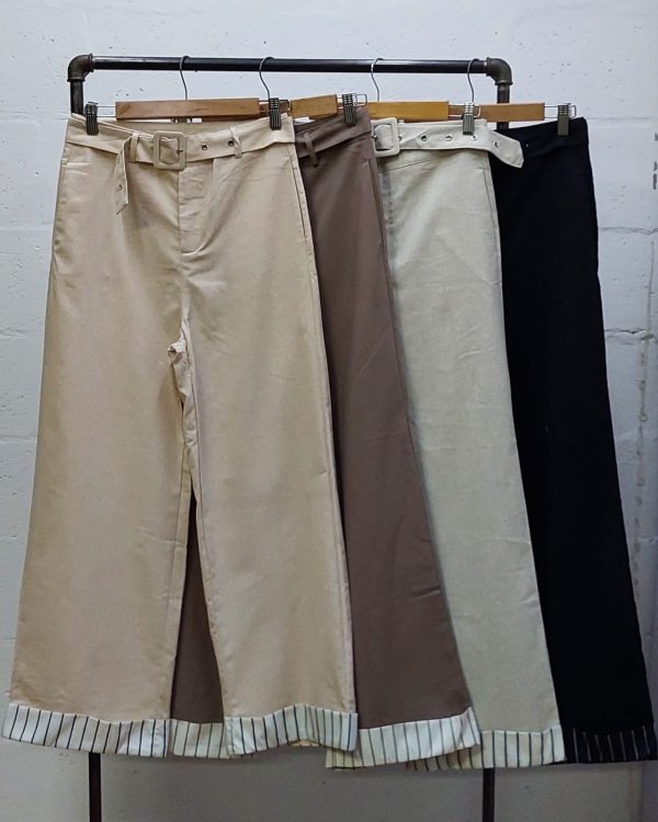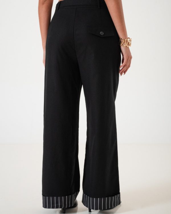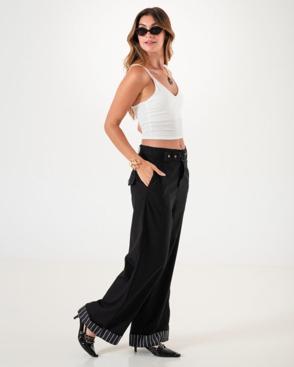 Pantalon estilo palazo confeccionado en tela de lino con detalle de cinto, botamanga rayada, bolsillos, cierre y boton.