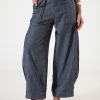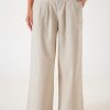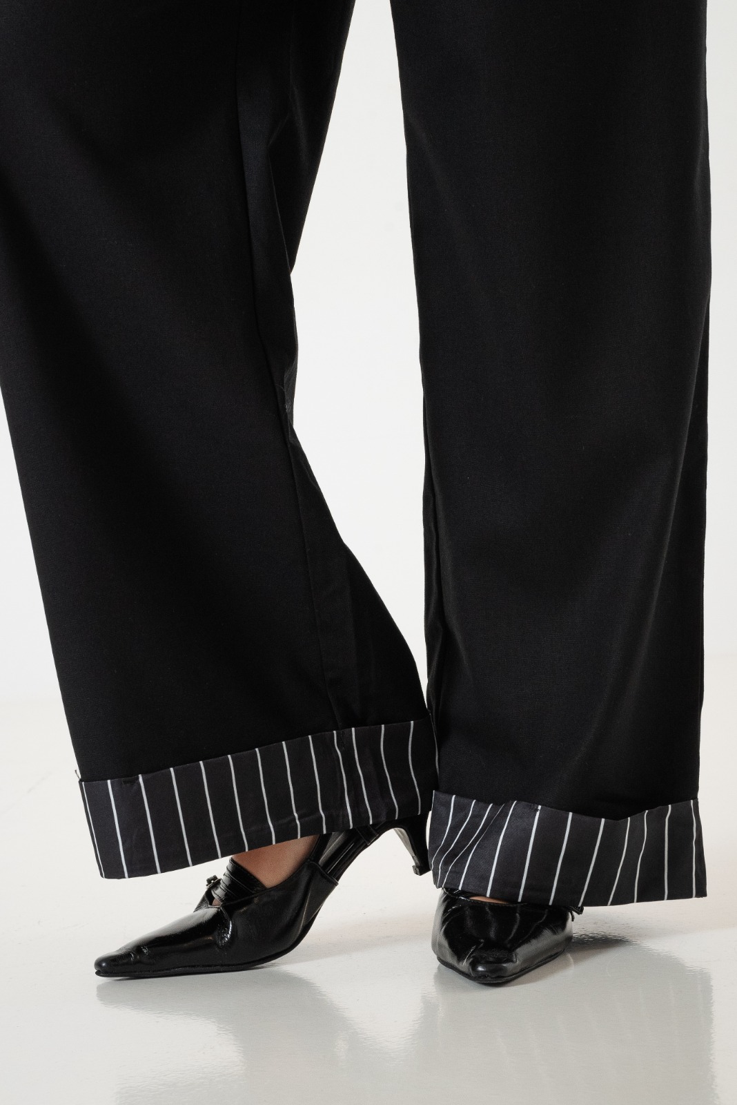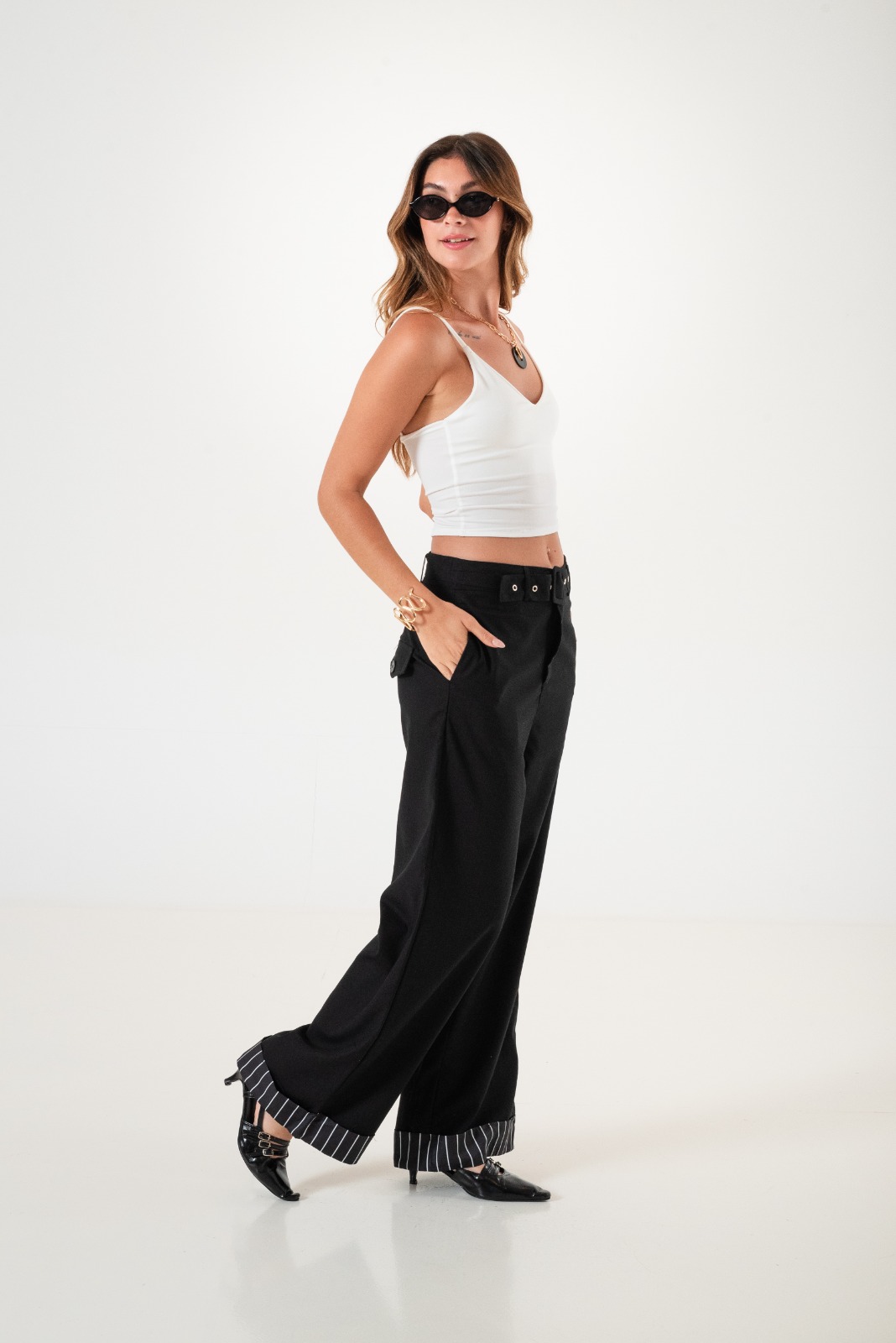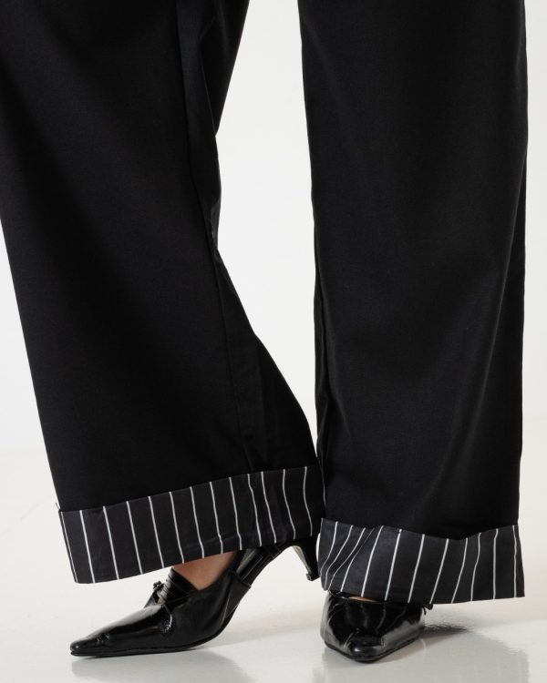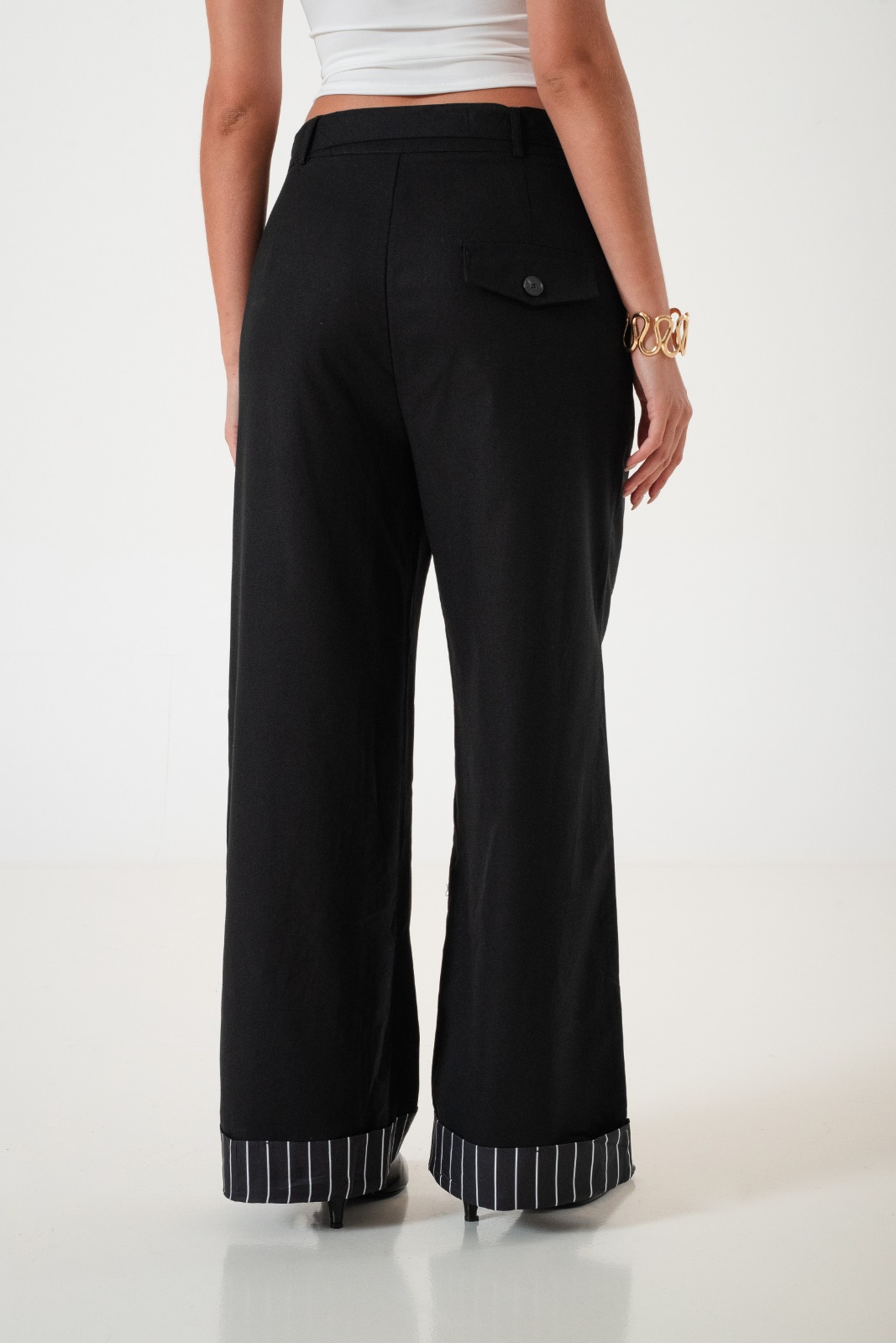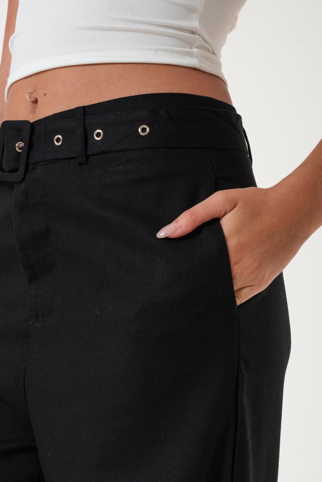 Pantalon estilo palazo confeccionado en tela de lino con detalle de cinto, botamanga rayada, bolsillos, cierre y boton.