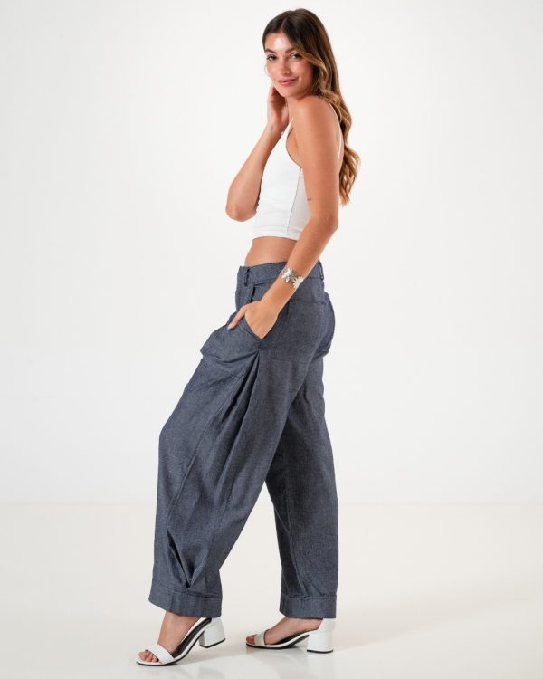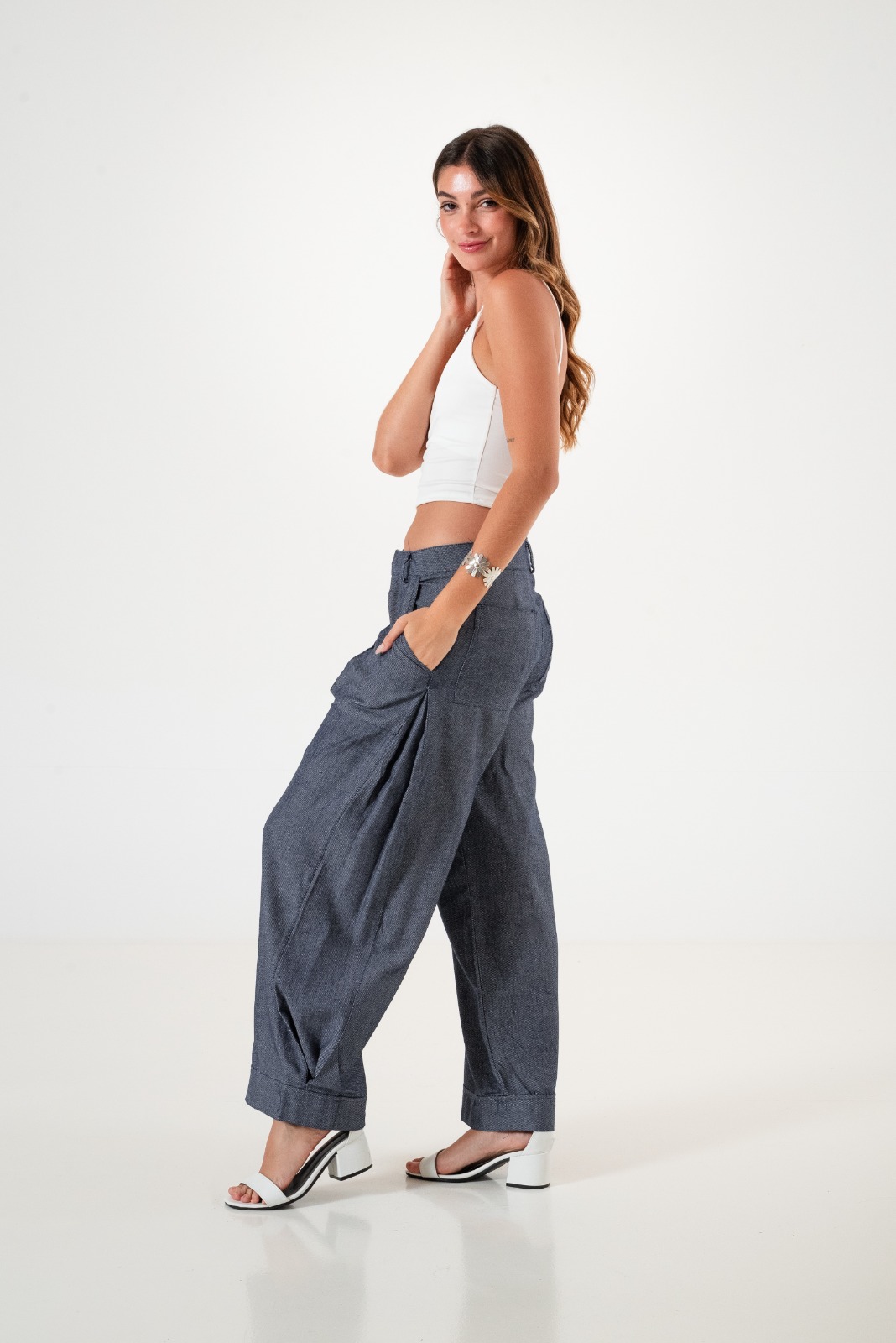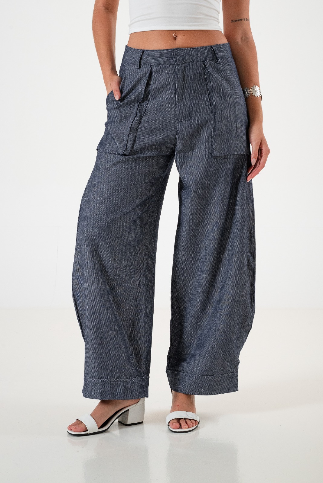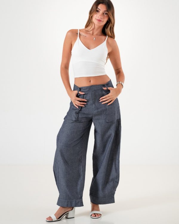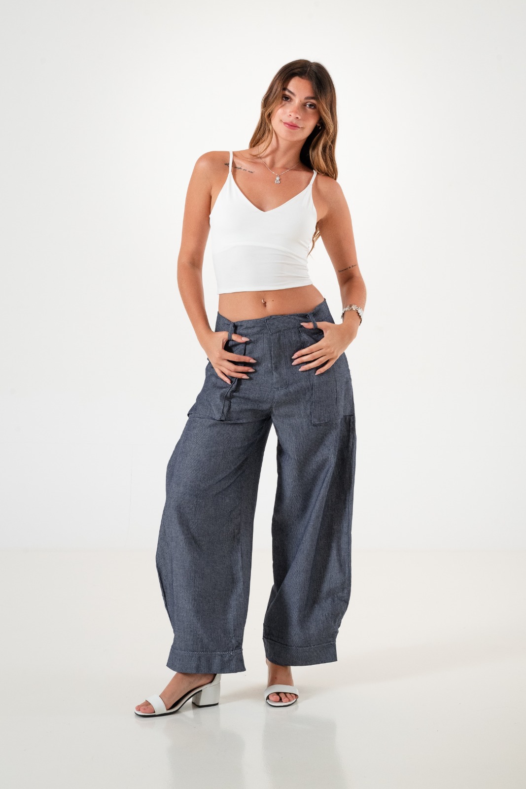 Pantalon estilo palazo confeccionado en tela de lino jean con detall de bolsillos, pasacinto, cierre y boton.