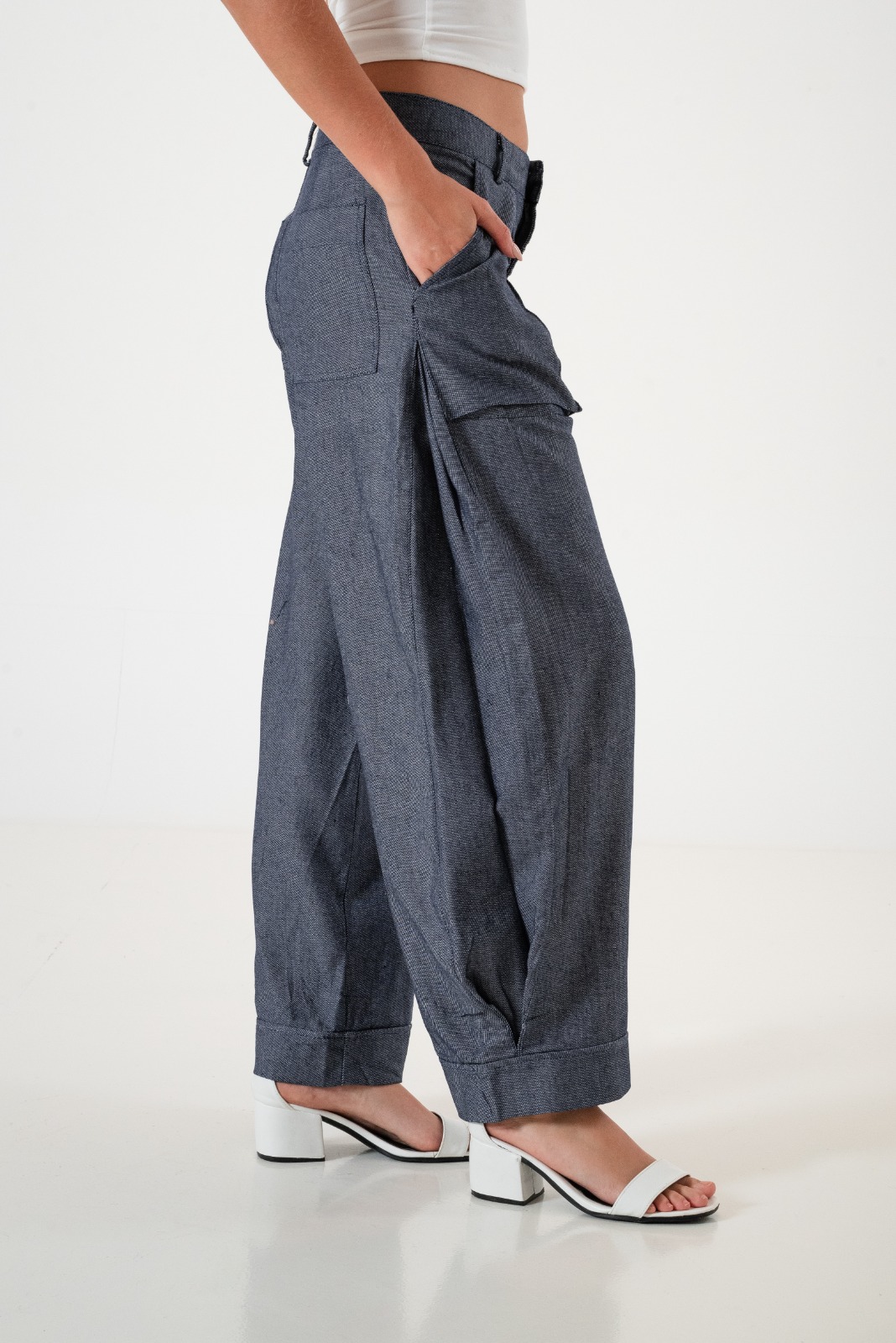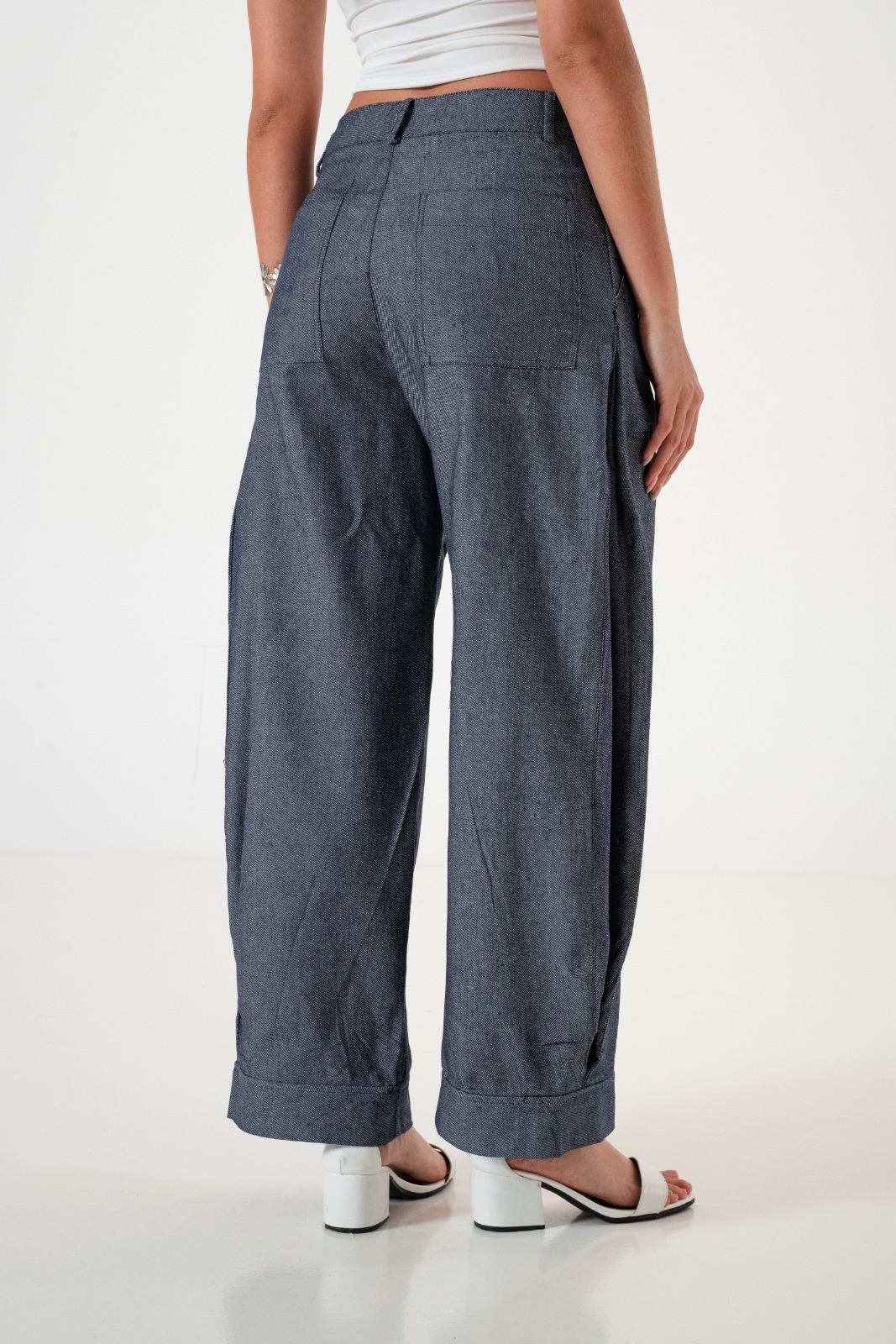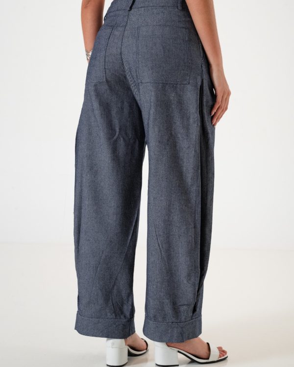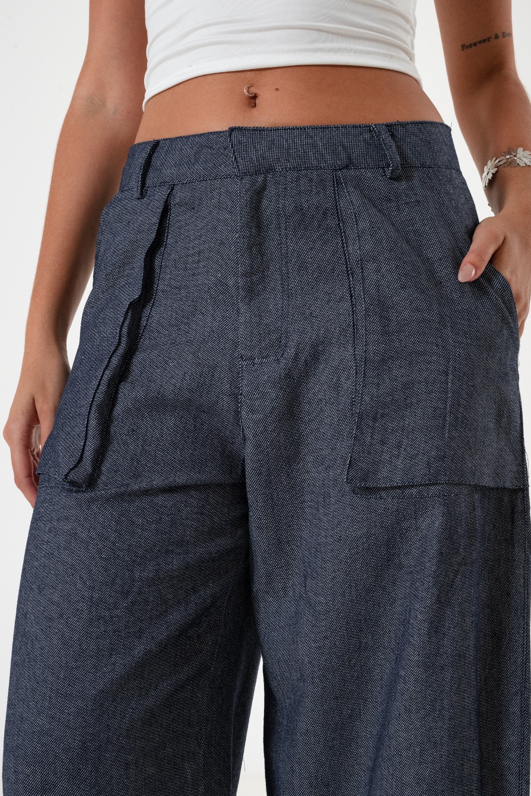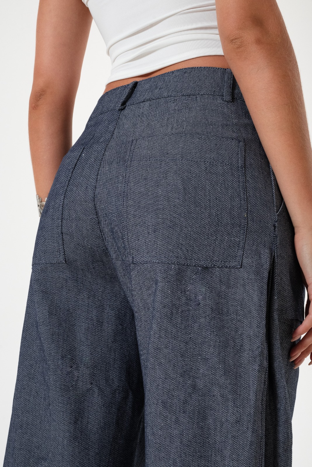 Pantalon estilo palazo confeccionado en tela de lino jean con detall de bolsillos, pasacinto, cierre y boton.