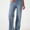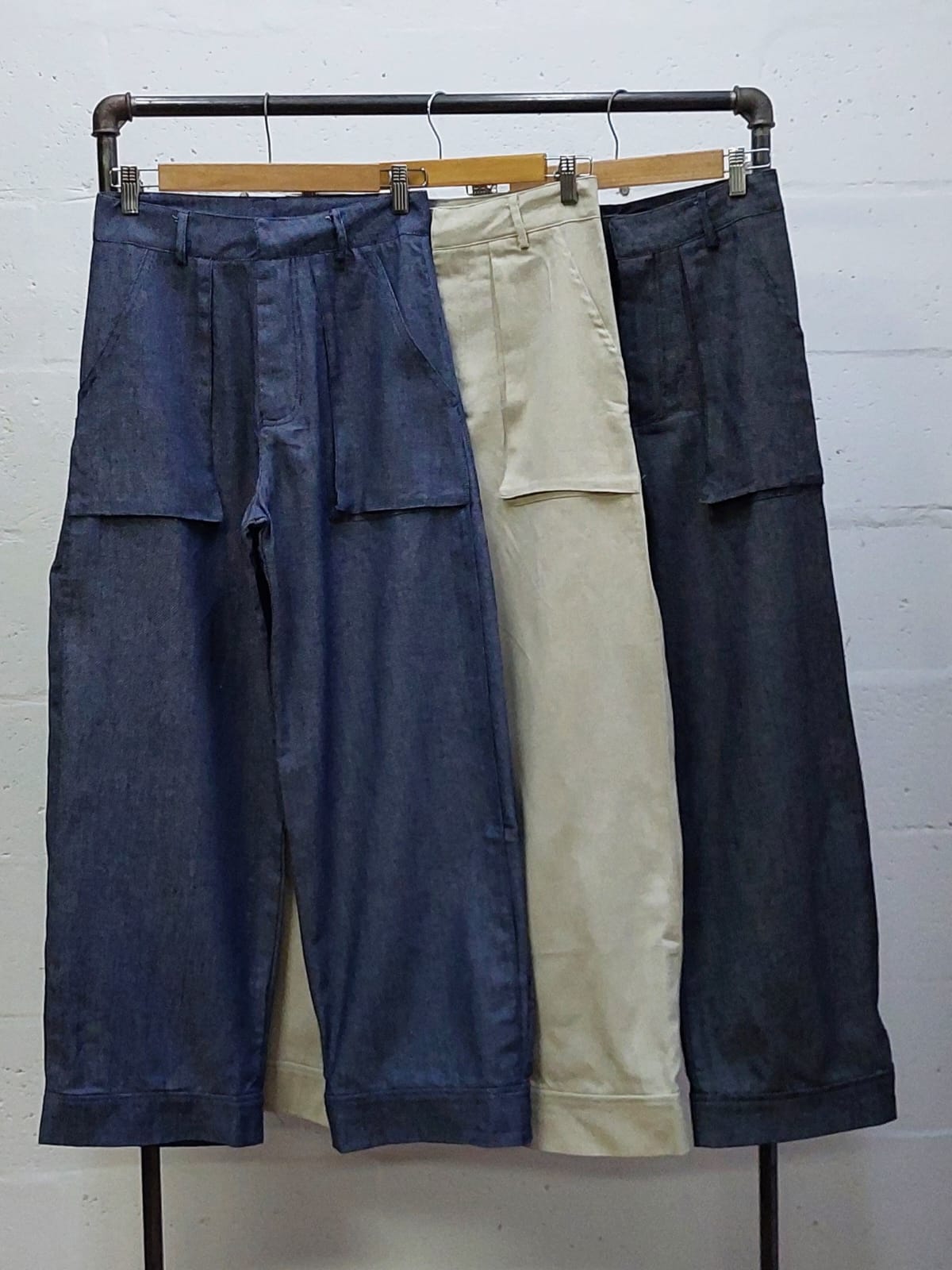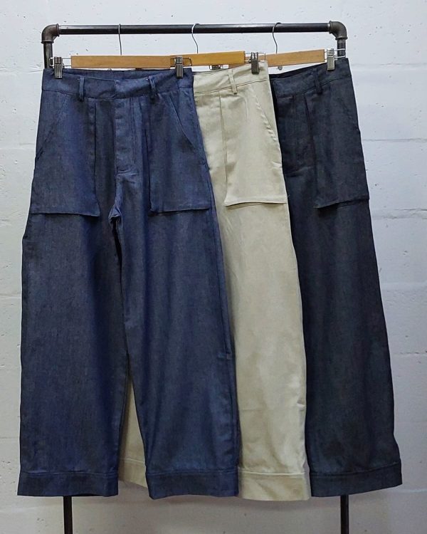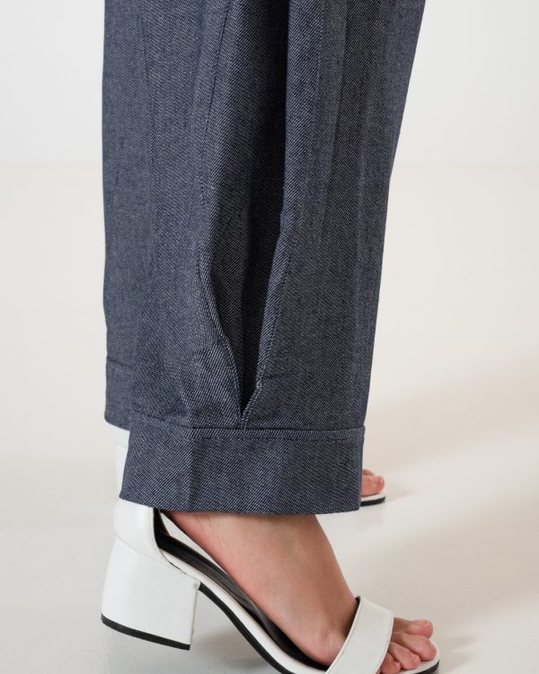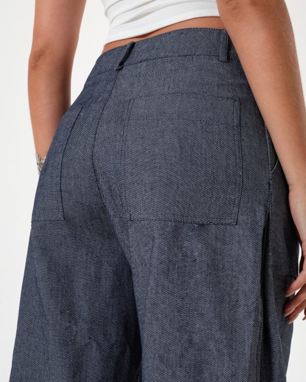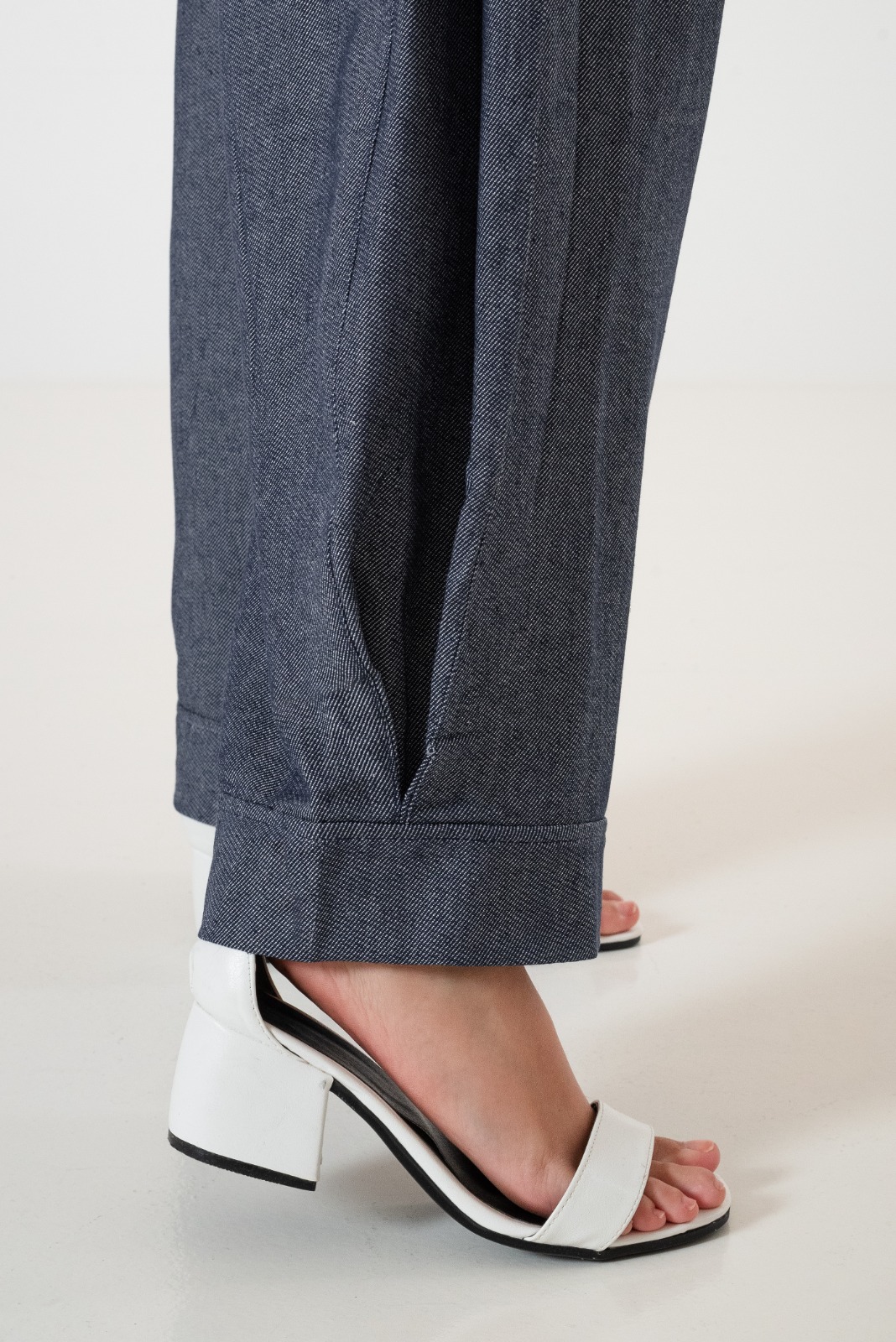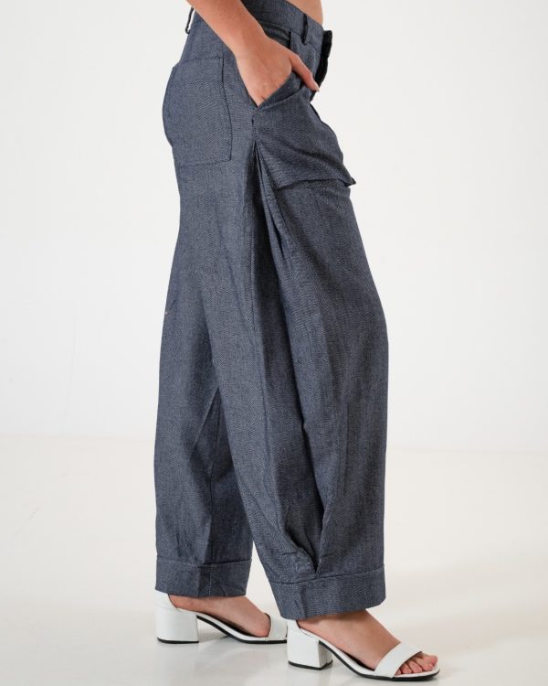 Pantalon estilo palazo confeccionado en tela de lino jean con detall de bolsillos, pasacinto, cierre y boton.