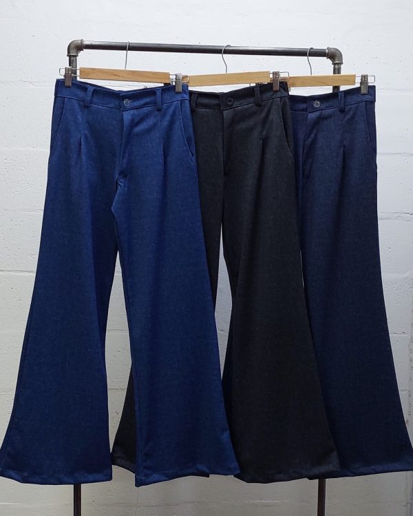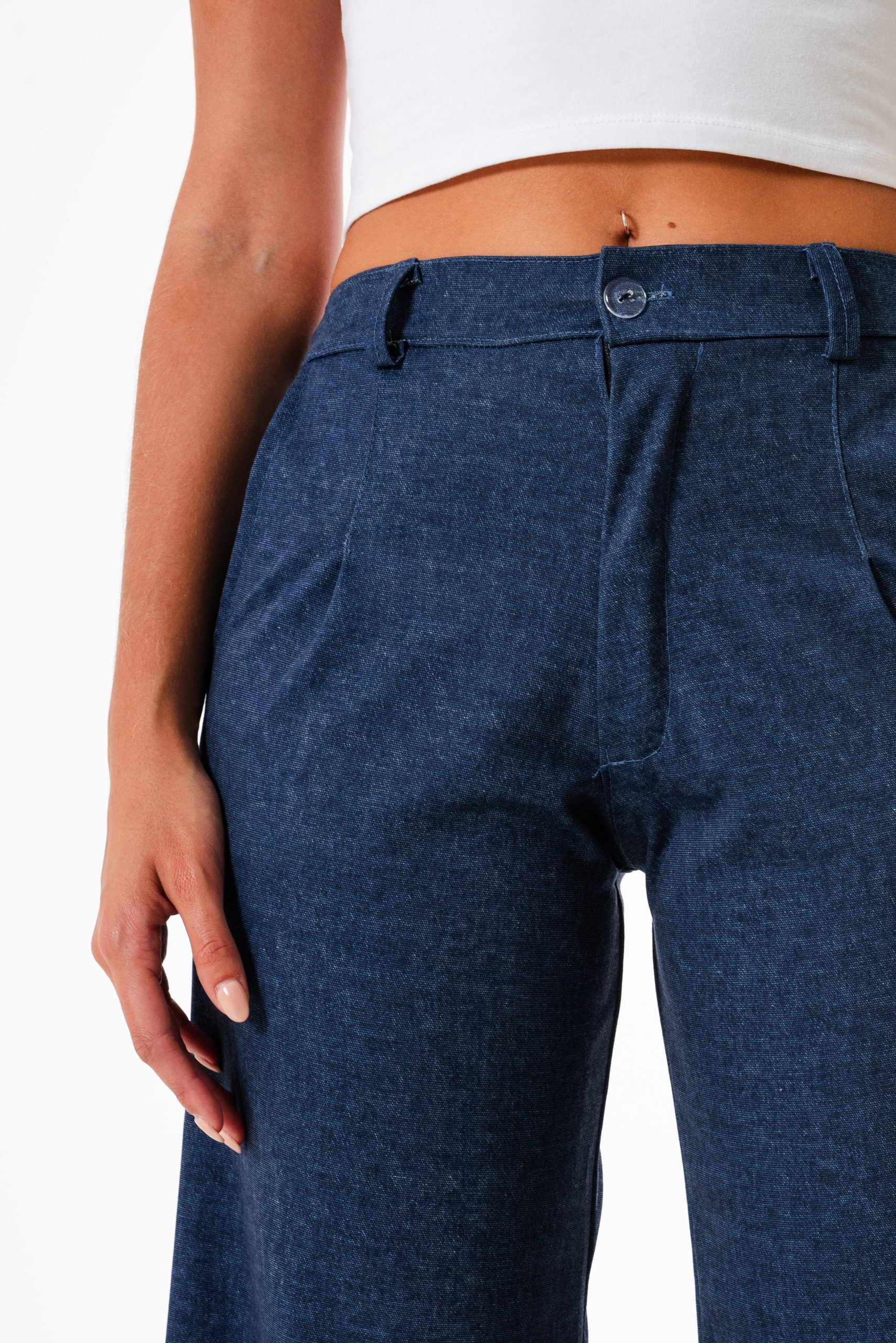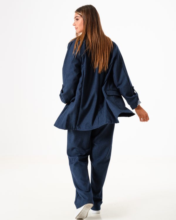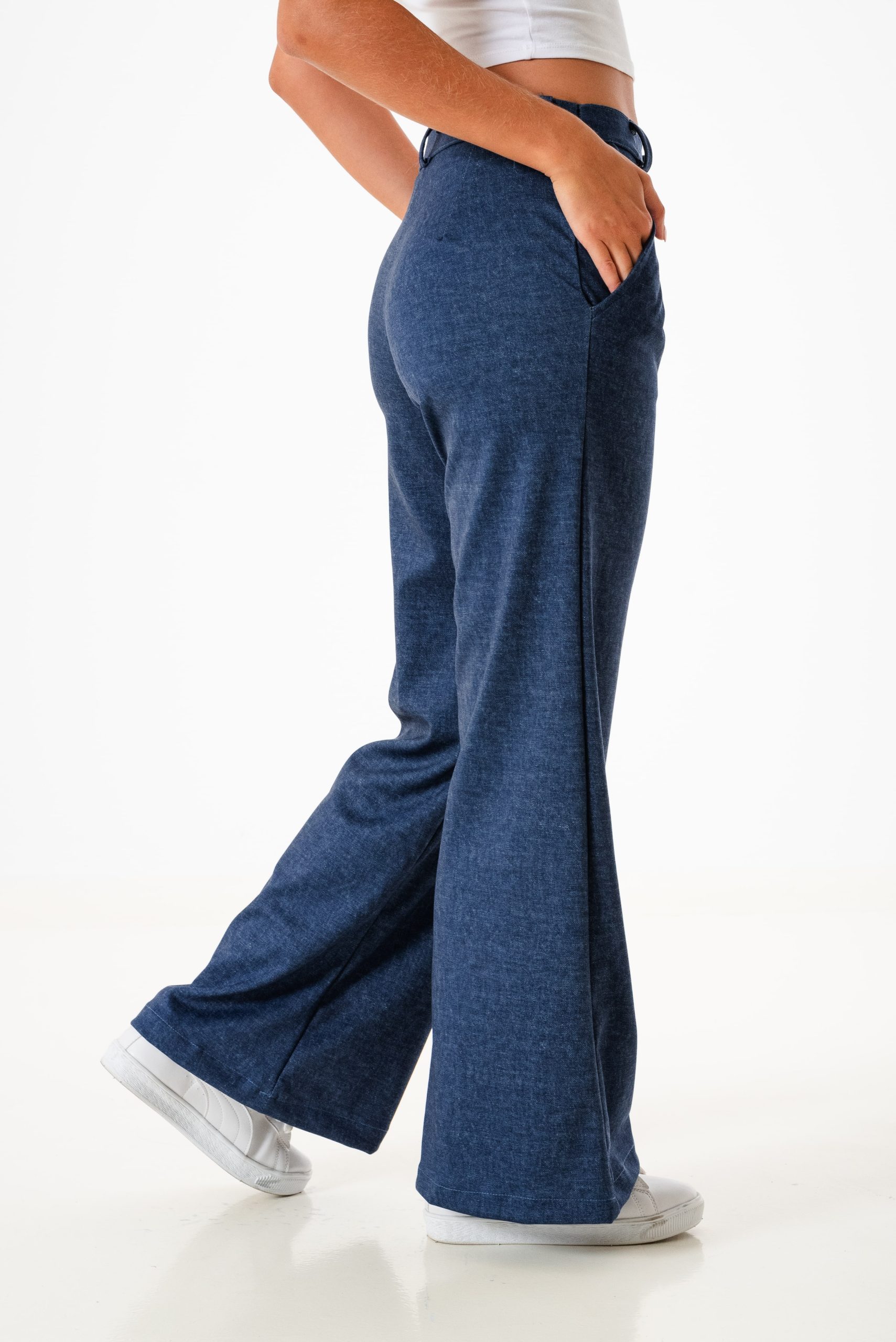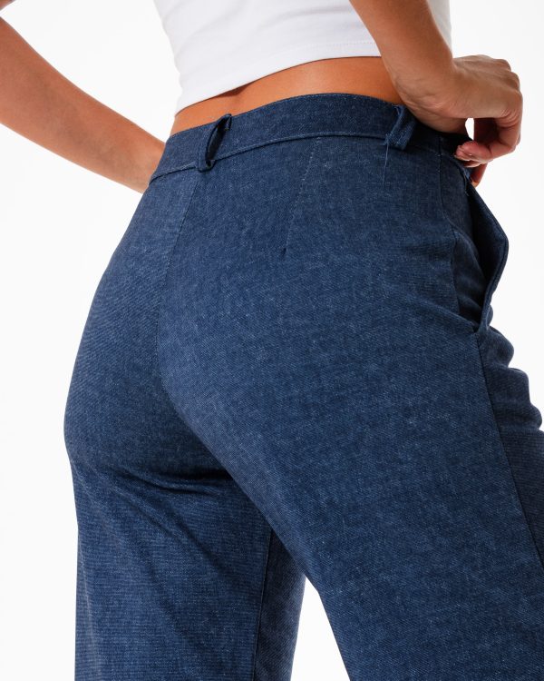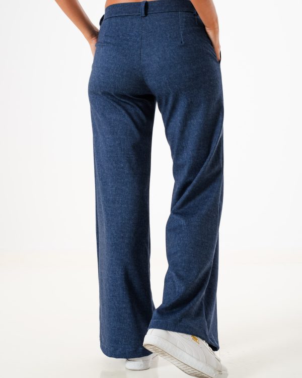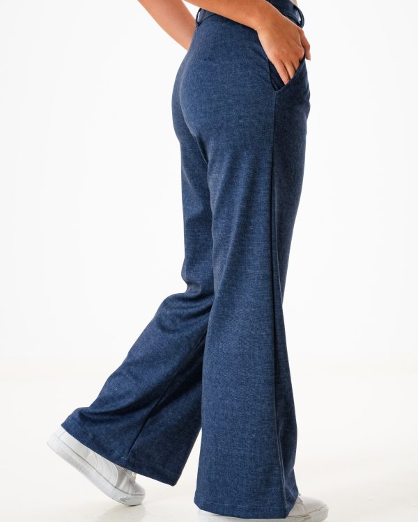 Pantalon estilo palazo confeccionado en tela de punto roma simil jean con detalle de pinzas delanteras, bolsillos, pasacinto, cierre y boton.
