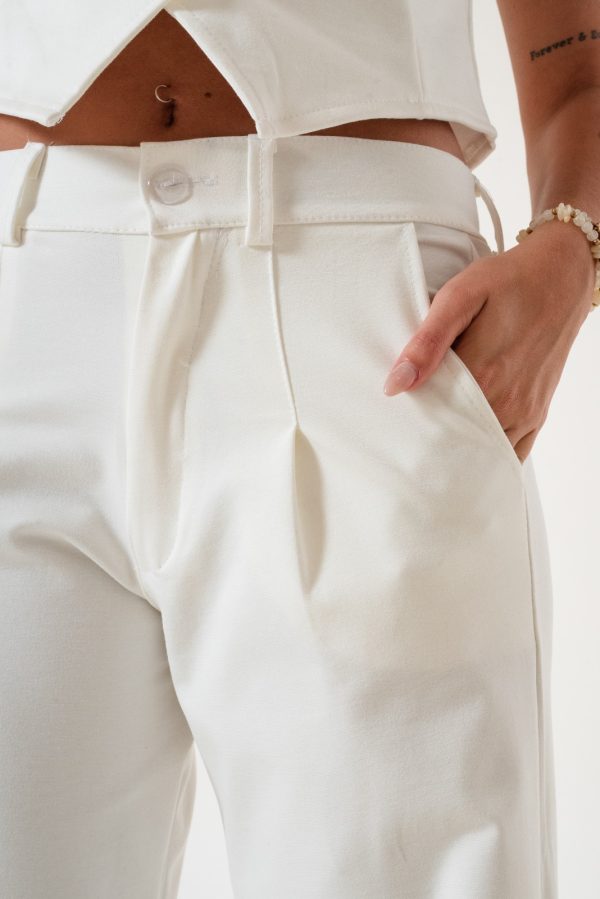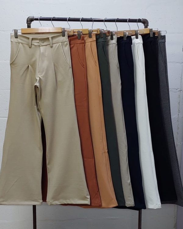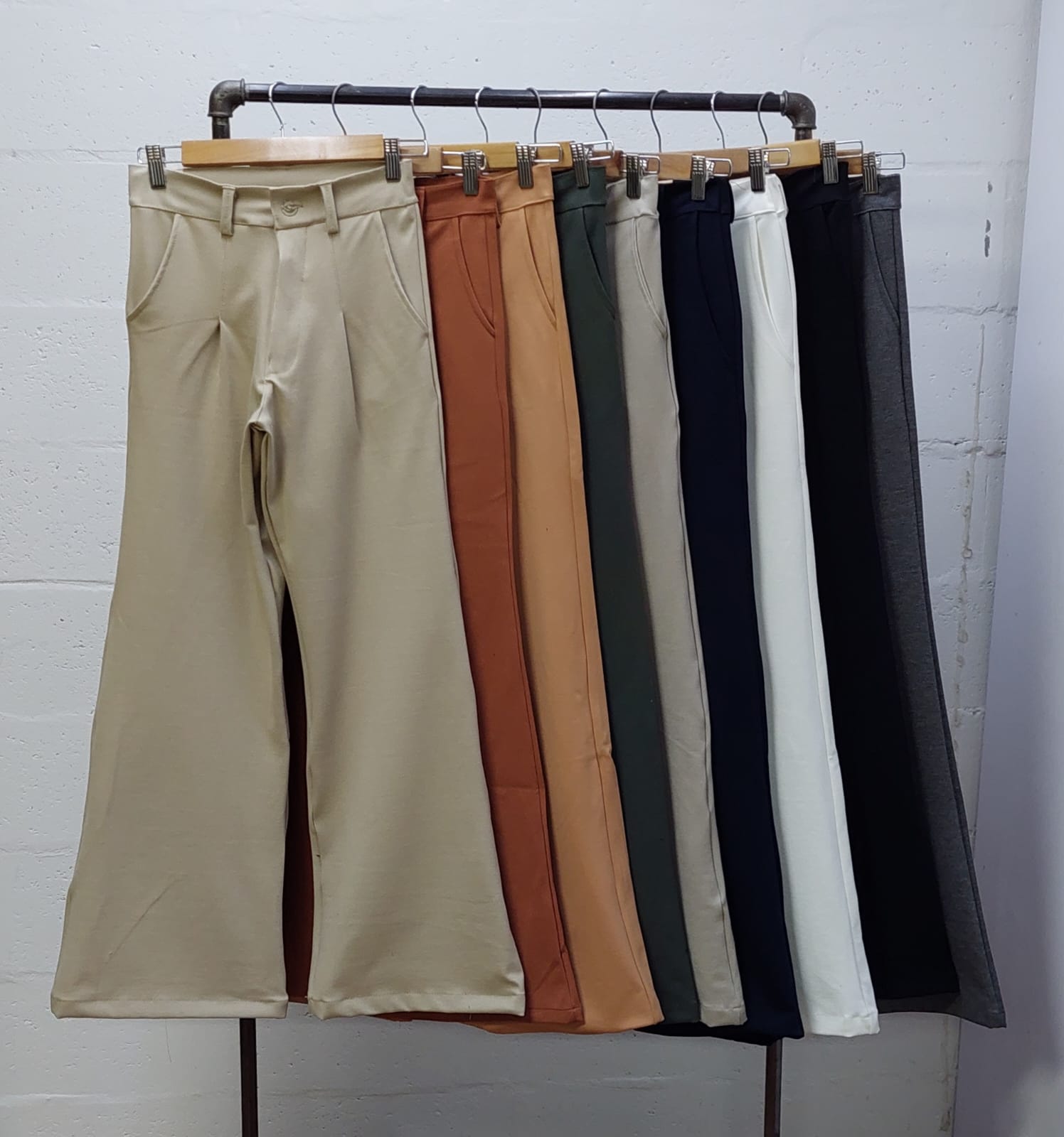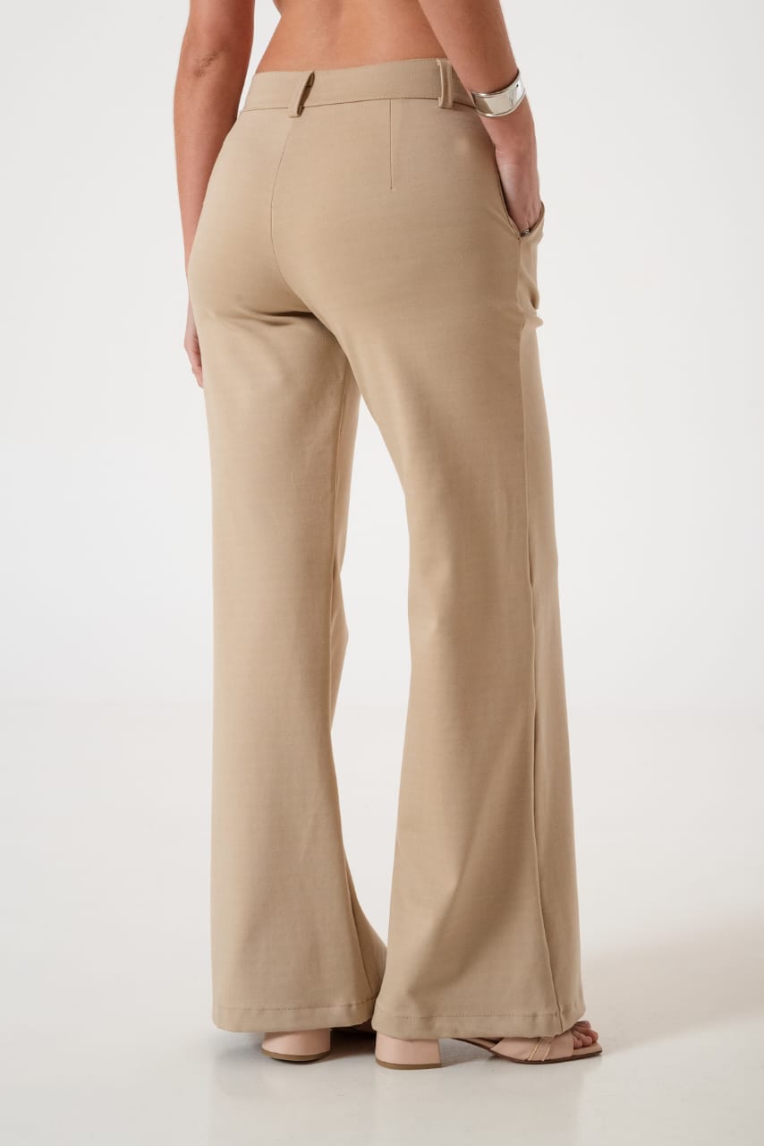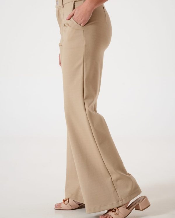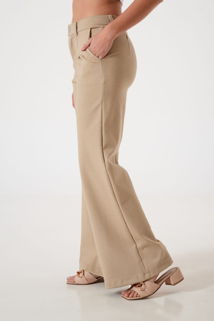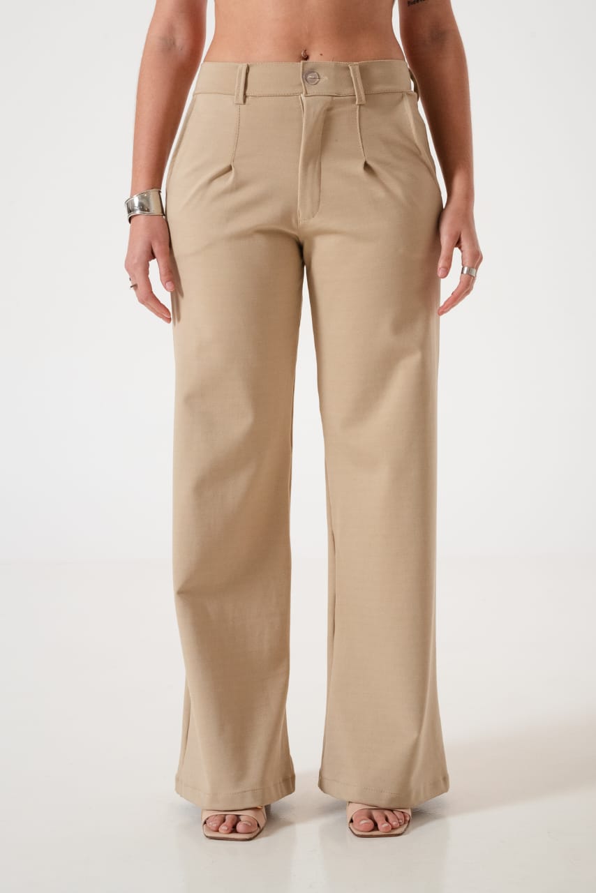 Pantalon estilo palazo confeccionado en tela de punto roma con detalle de pinzas delanteras, bolsillos, pasacinto, cierre y boton.