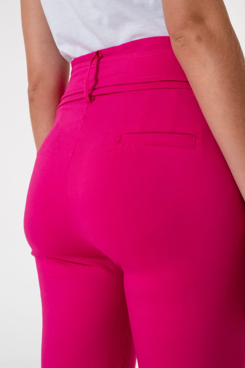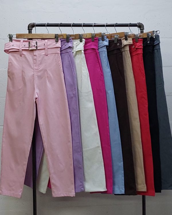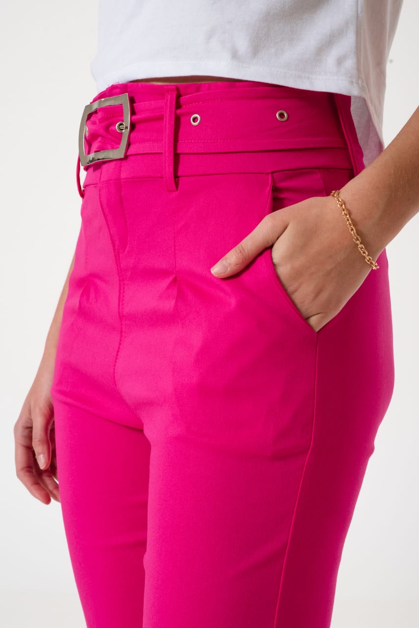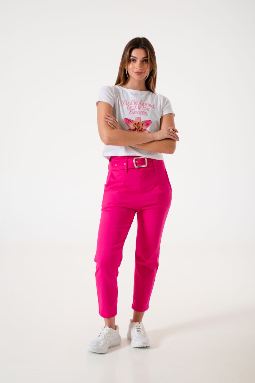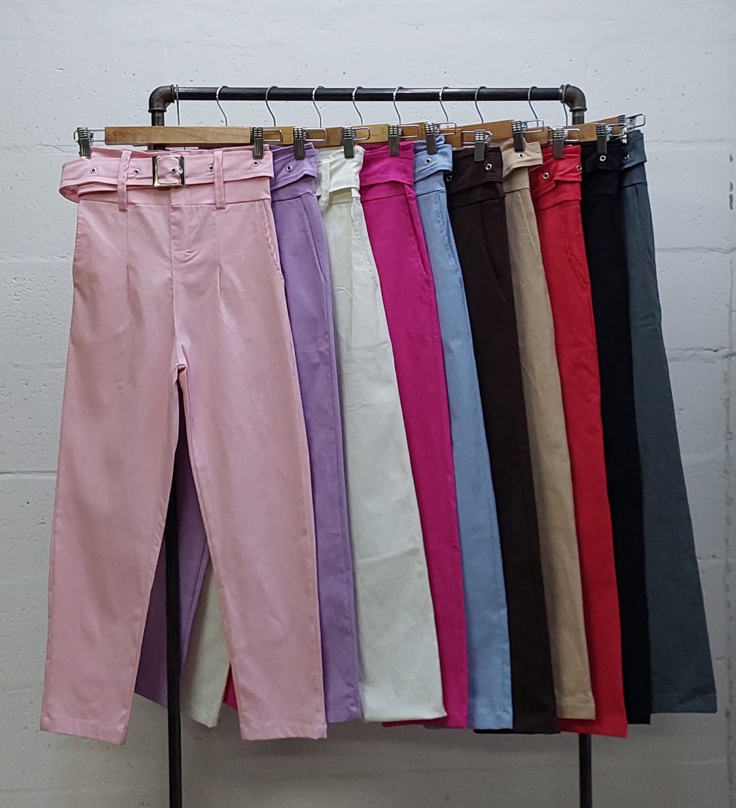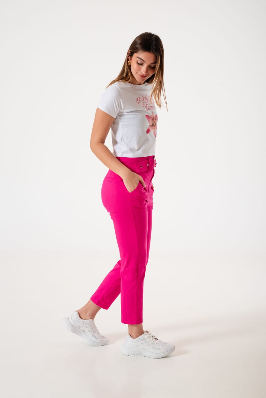 Pantalon estilo mom confeccionado en tela de bengalina con detalle de pinzas delanteras, cinturon, bolsillos, pasacinto, cierre y boton.