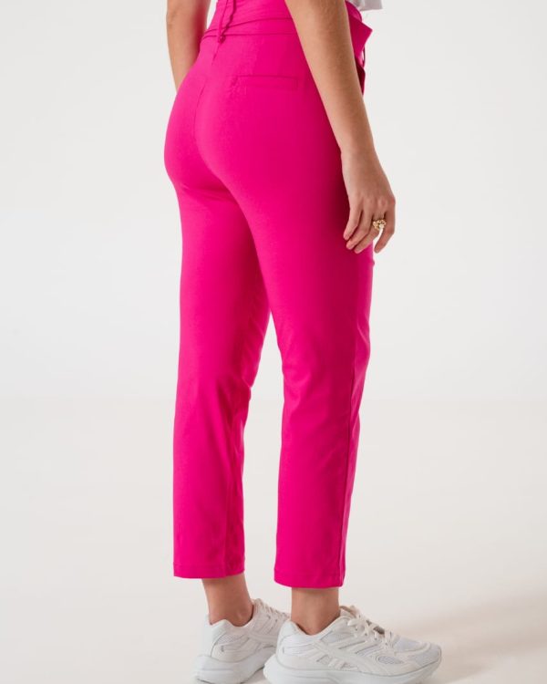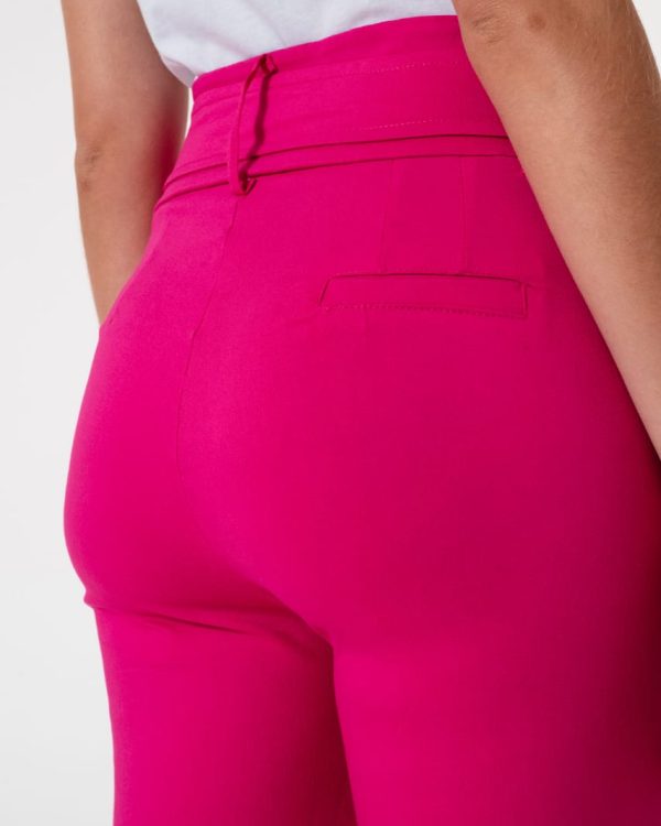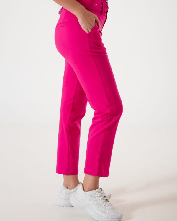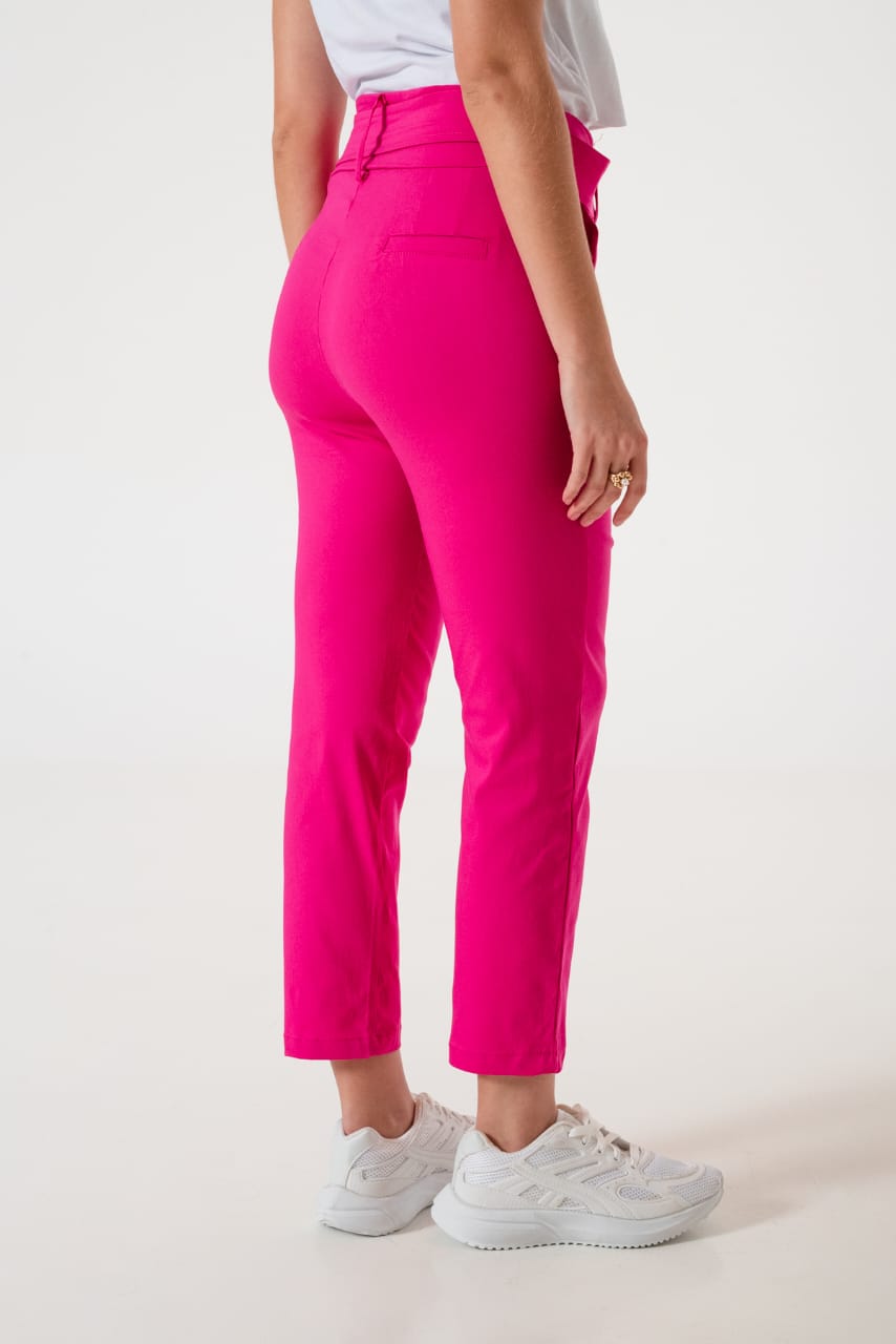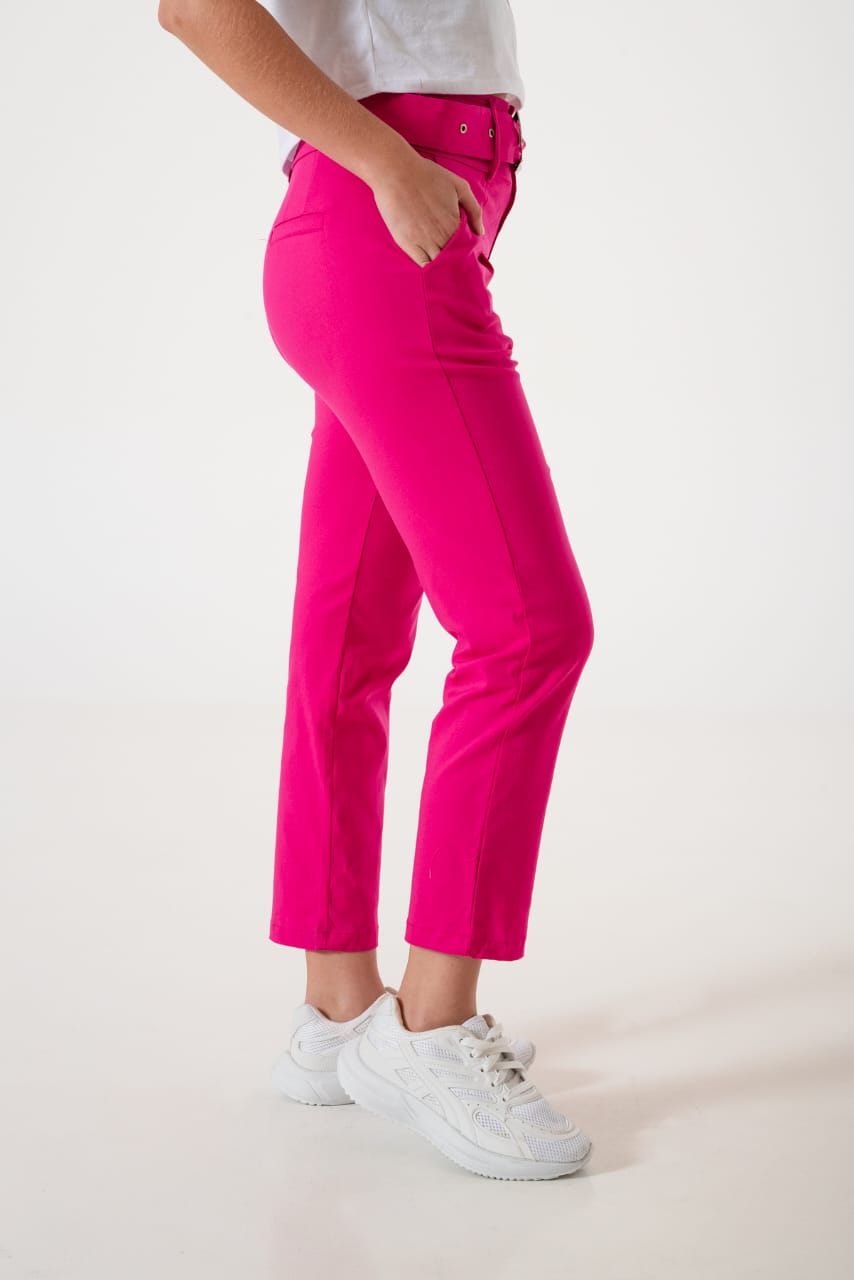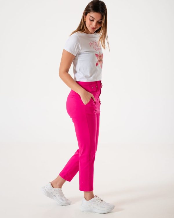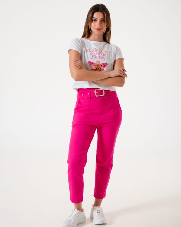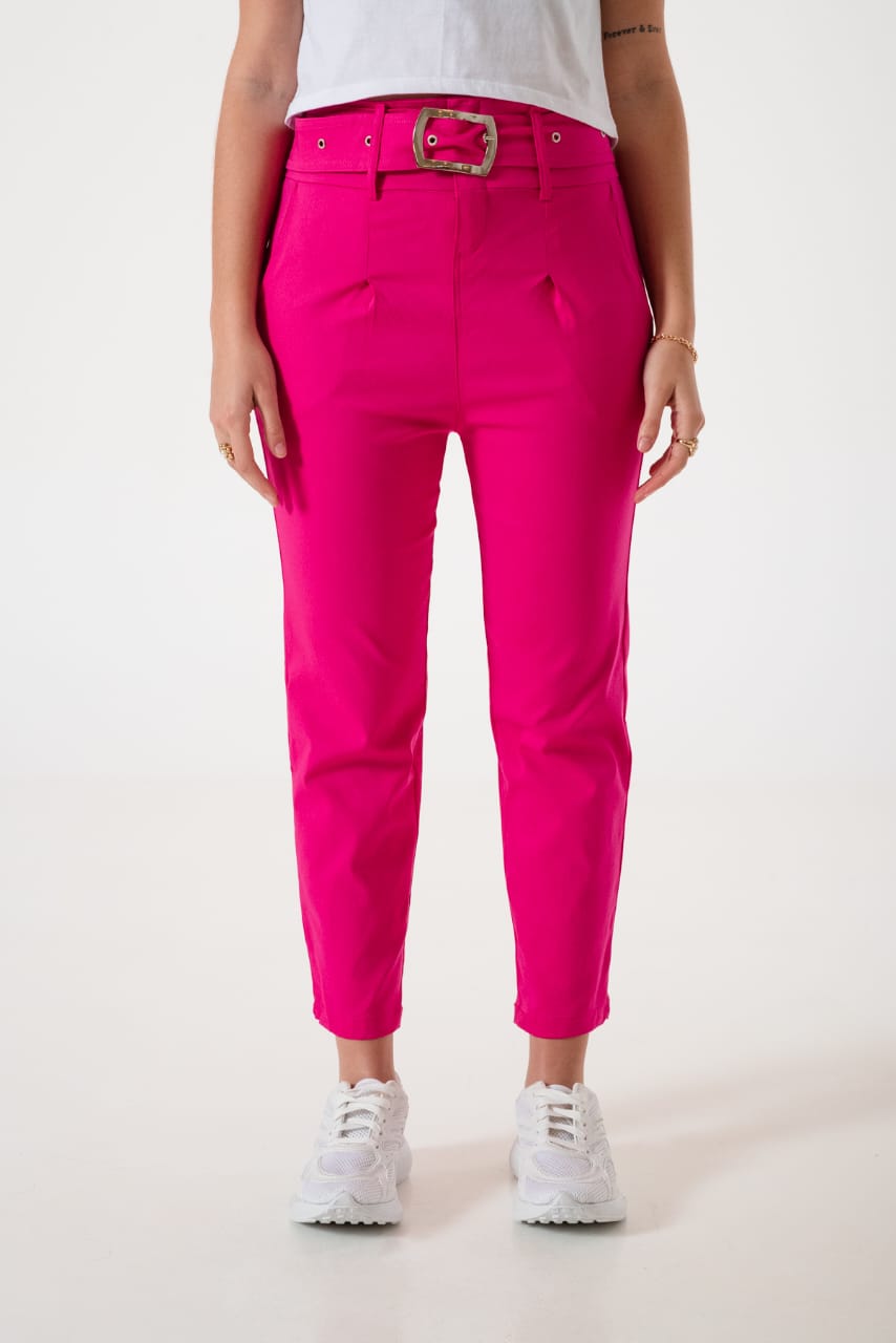 Pantalon estilo mom confeccionado en tela de bengalina con detalle de pinzas delanteras, cinturon, bolsillos, pasacinto, cierre y boton.