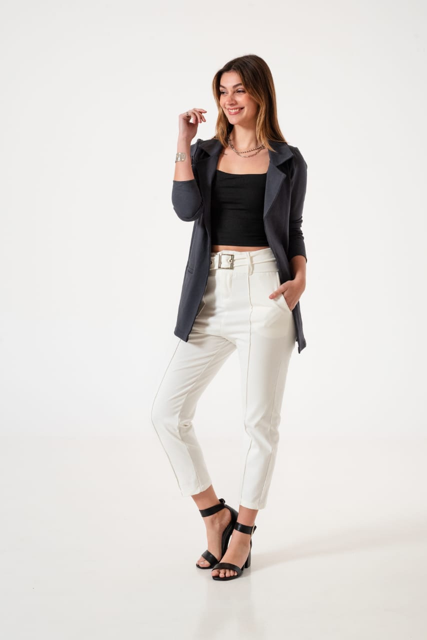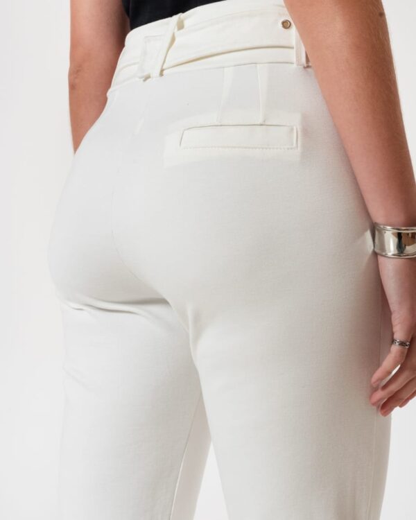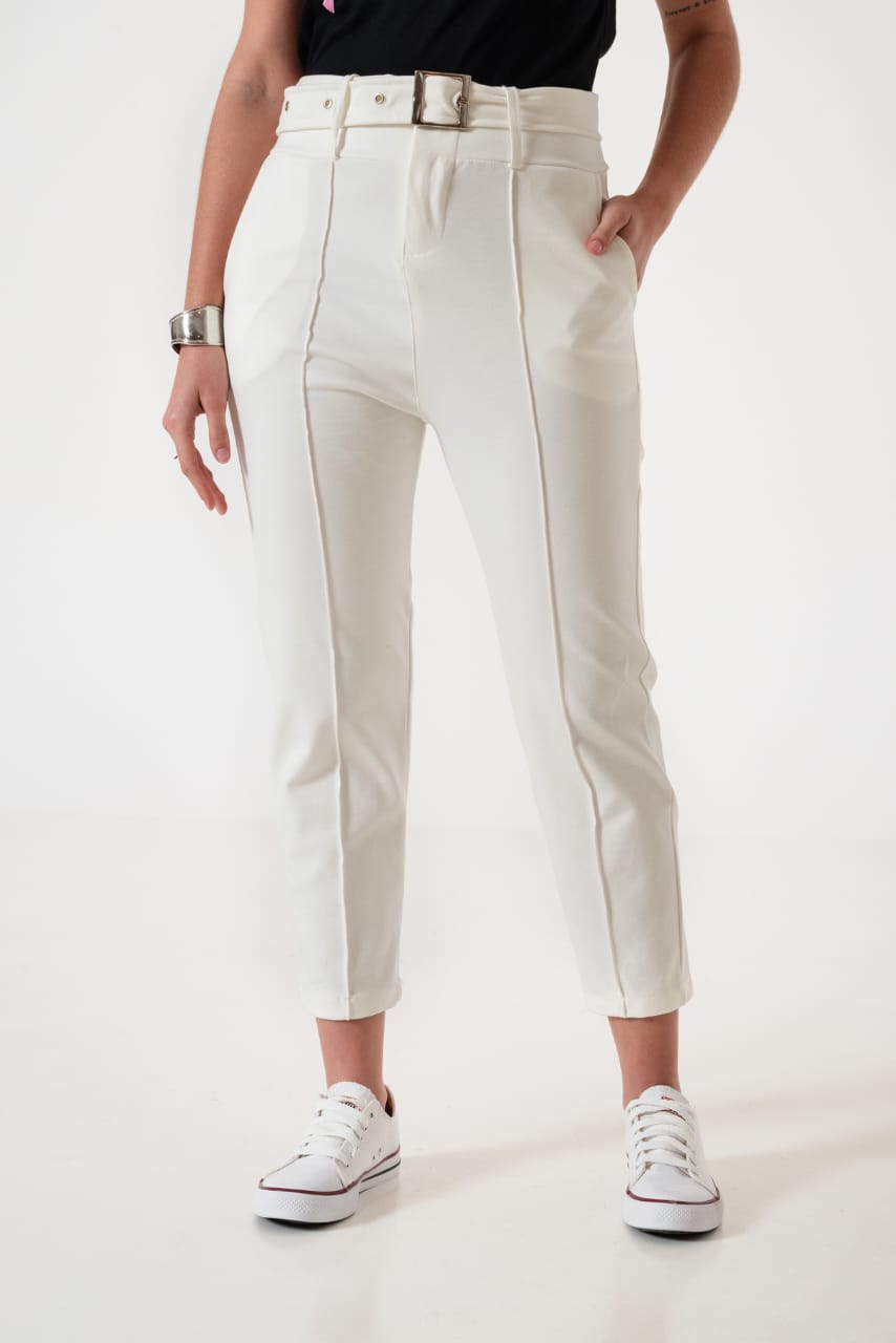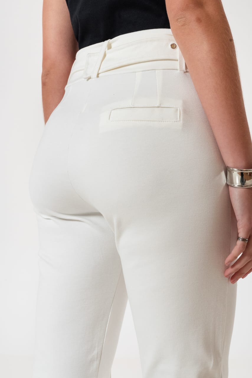 Pantalon estilo mom confeccionado en tela de punto roma con detalle de cinto, bolsillos, cierre y boton.