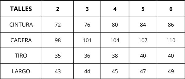 | Talles | 2, 3, 4, 5, 6 |