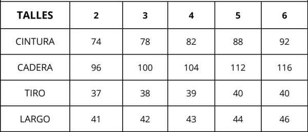 | Talles | 2, 3, 4, 5, 6 |