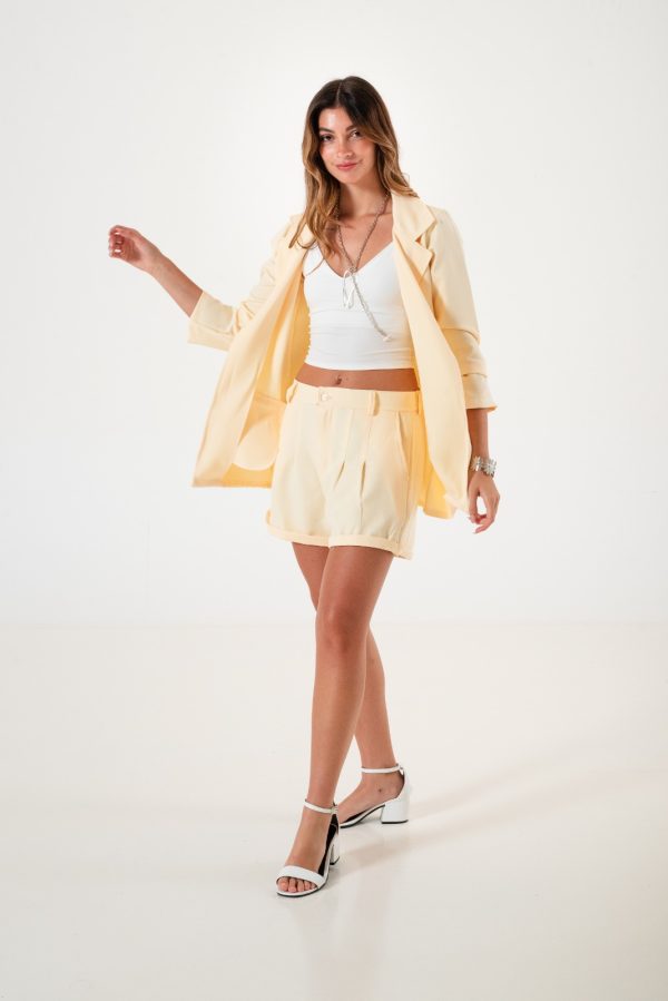 Short confeccionado en tela de sastreria con detalle de doble pinzas delanteras, bolsillos, pasacinto, cierre y boton.