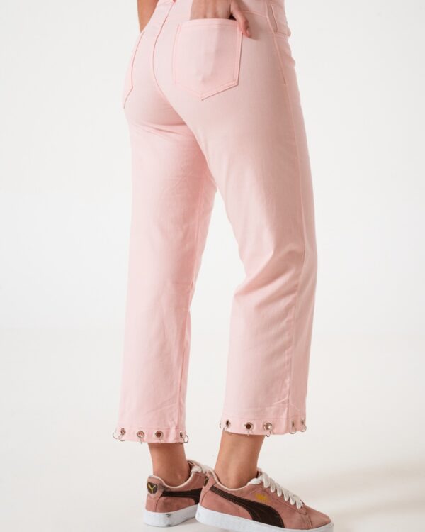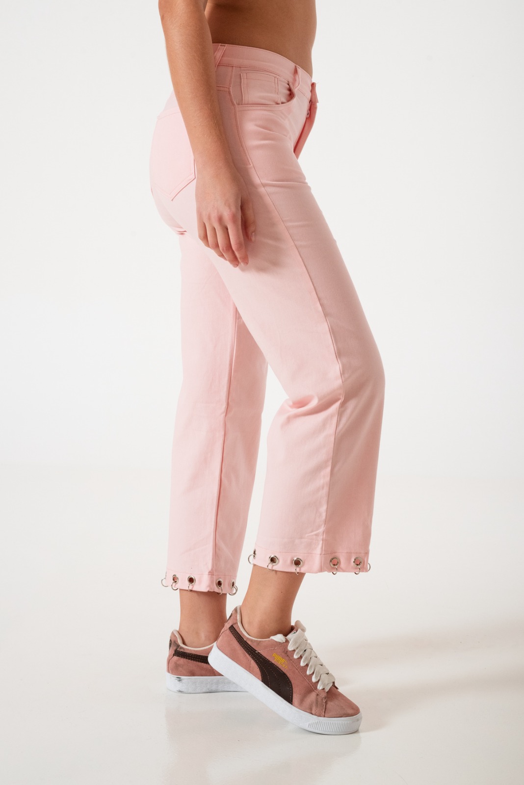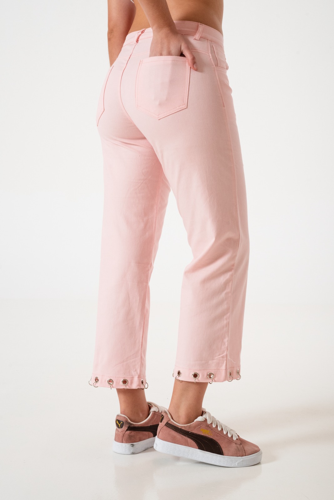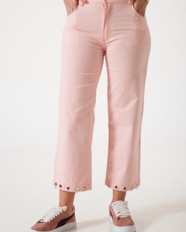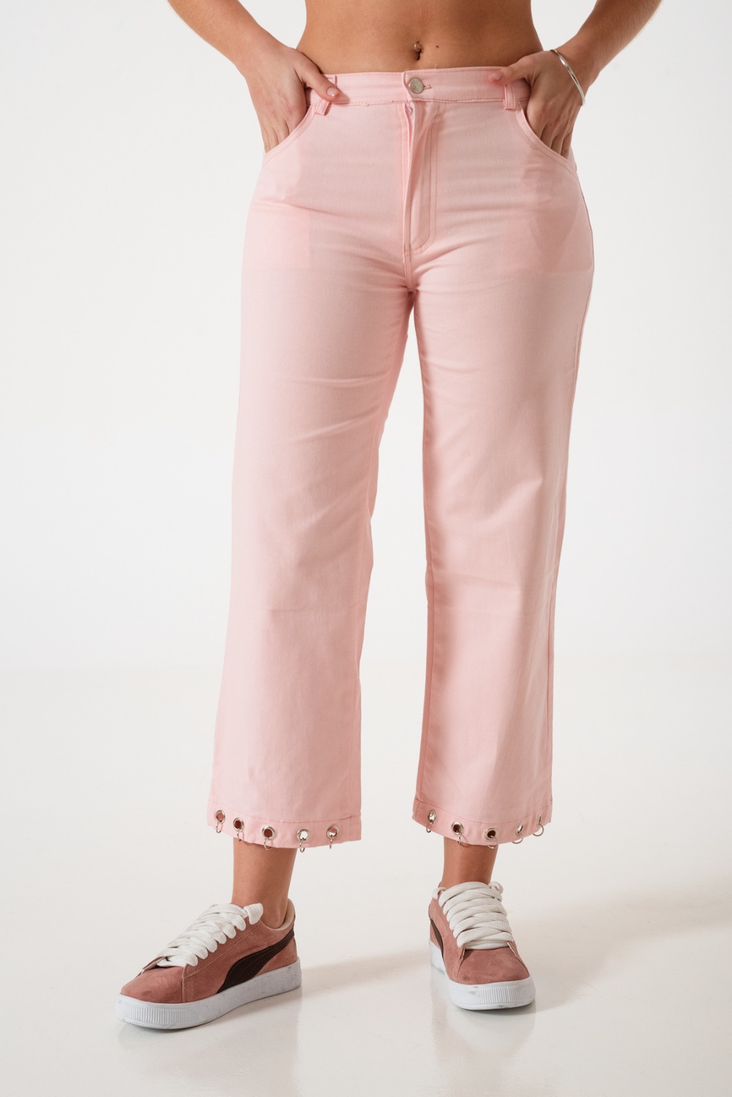 Pantalon estilo wid leg confeccionado en tela de gabardina con detalle de arandelas abajo, bolsillos, pasacinto, cierre y boton