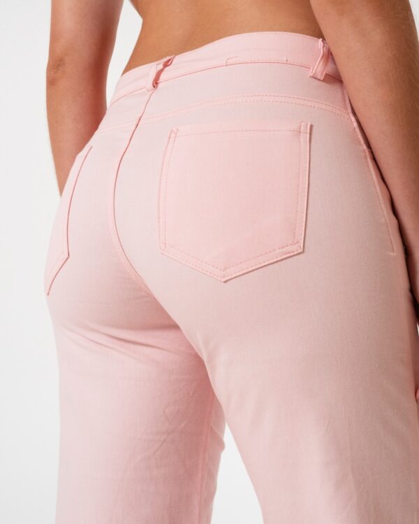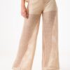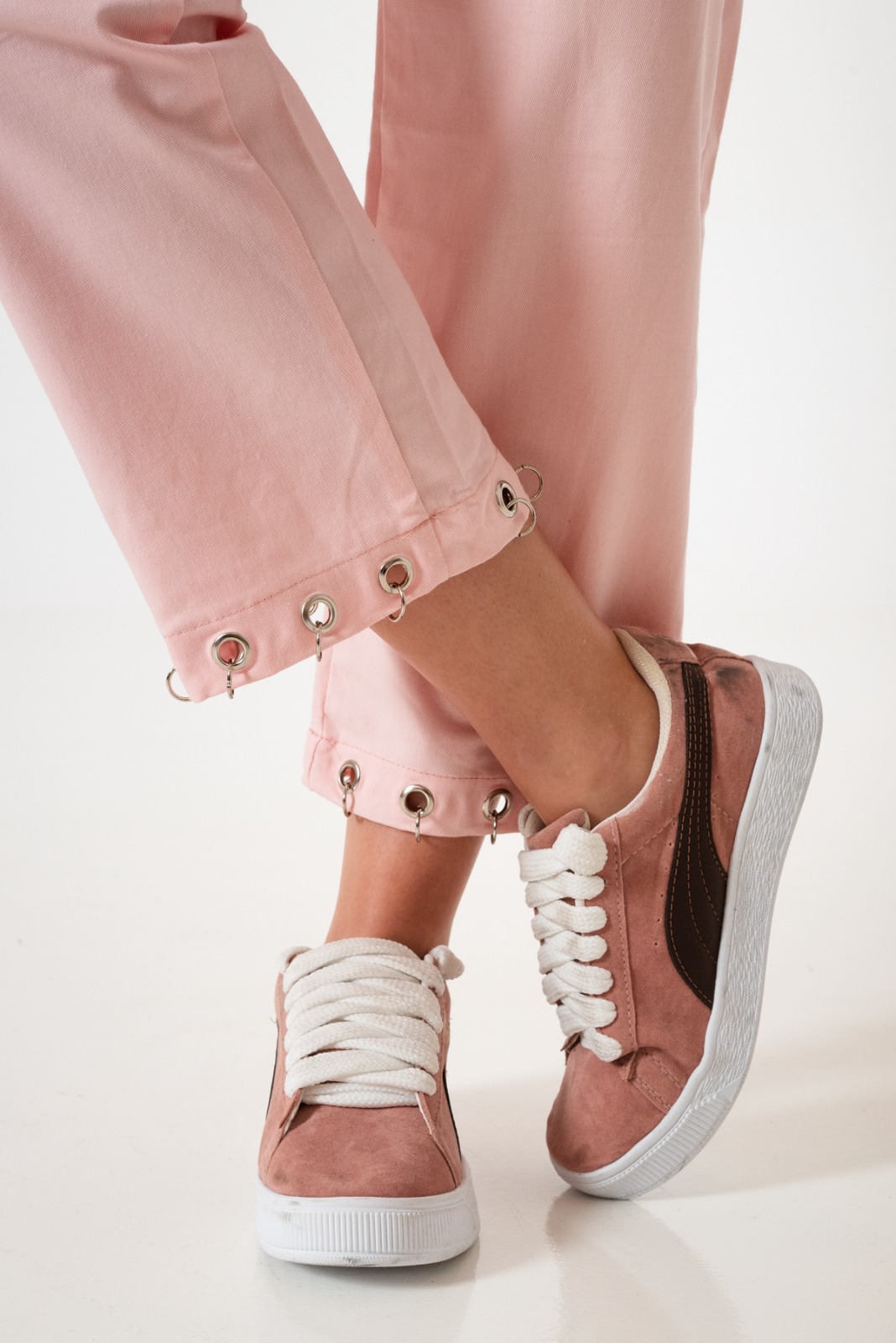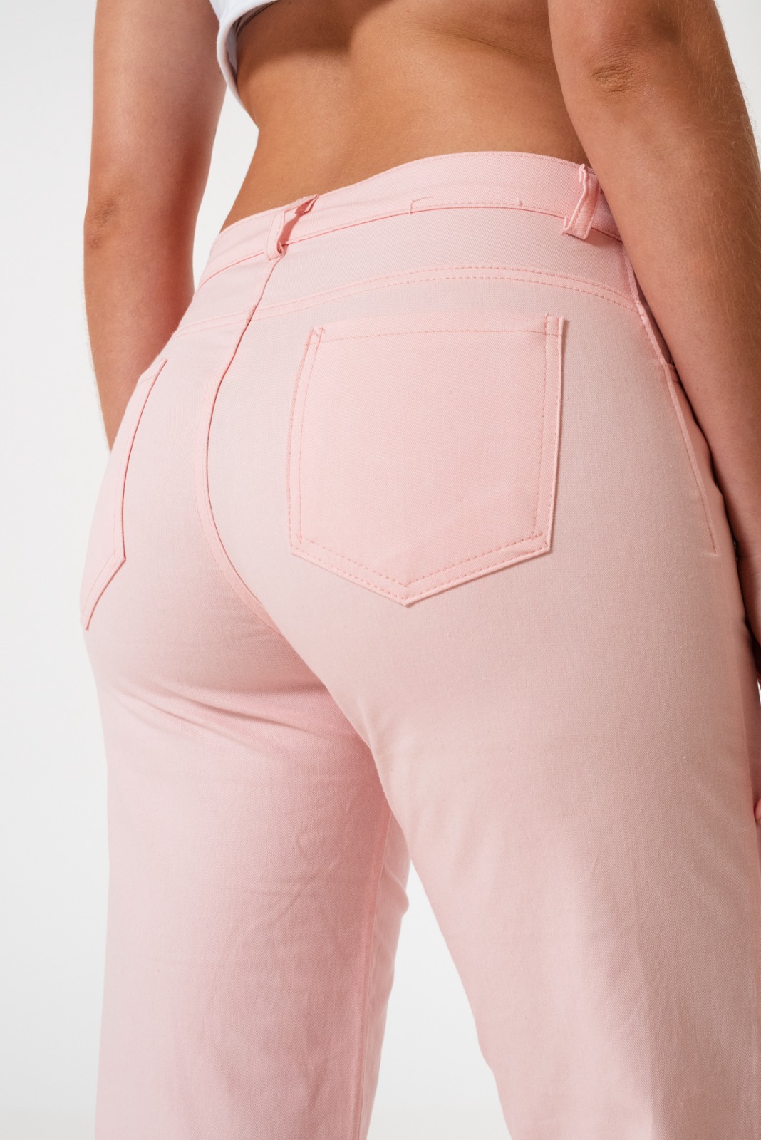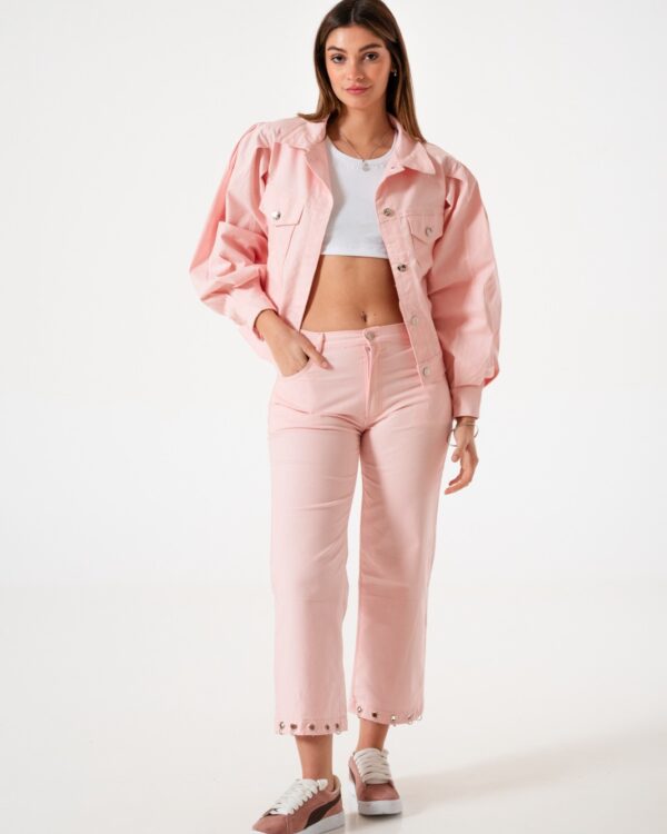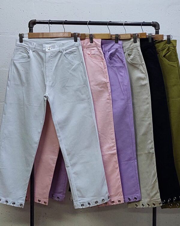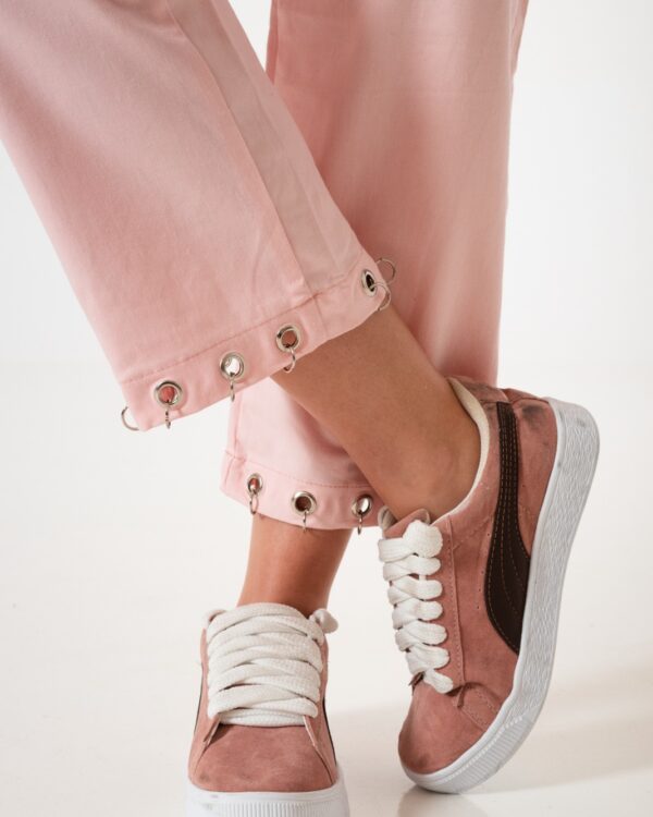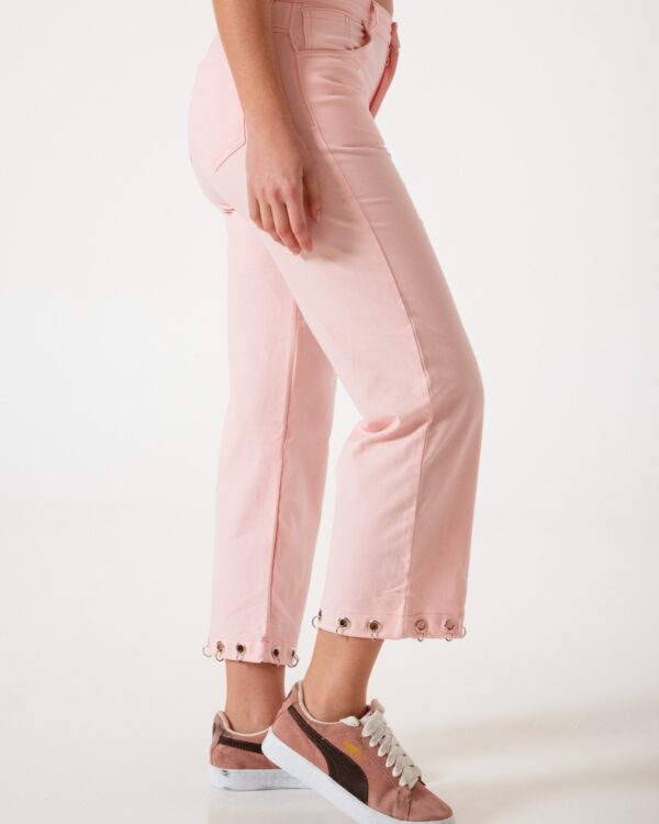 Pantalon estilo wid leg confeccionado en tela de gabardina con detalle de arandelas abajo, bolsillos, pasacinto, cierre y boton