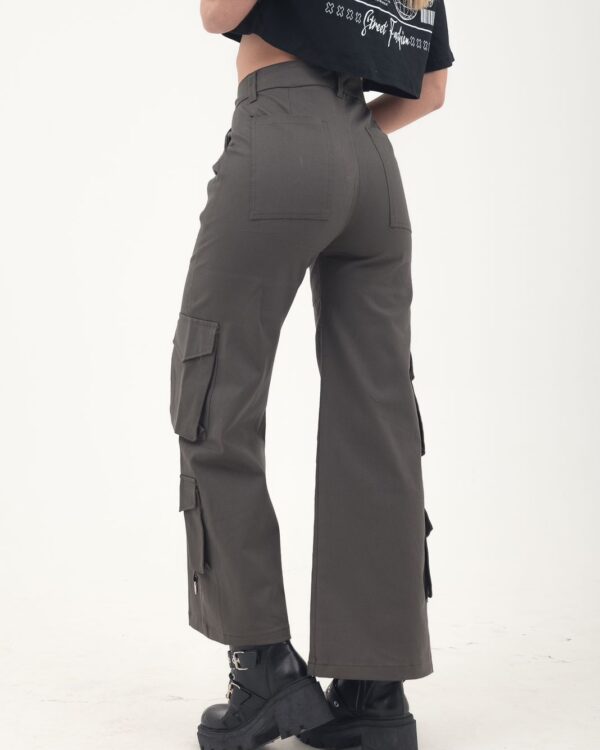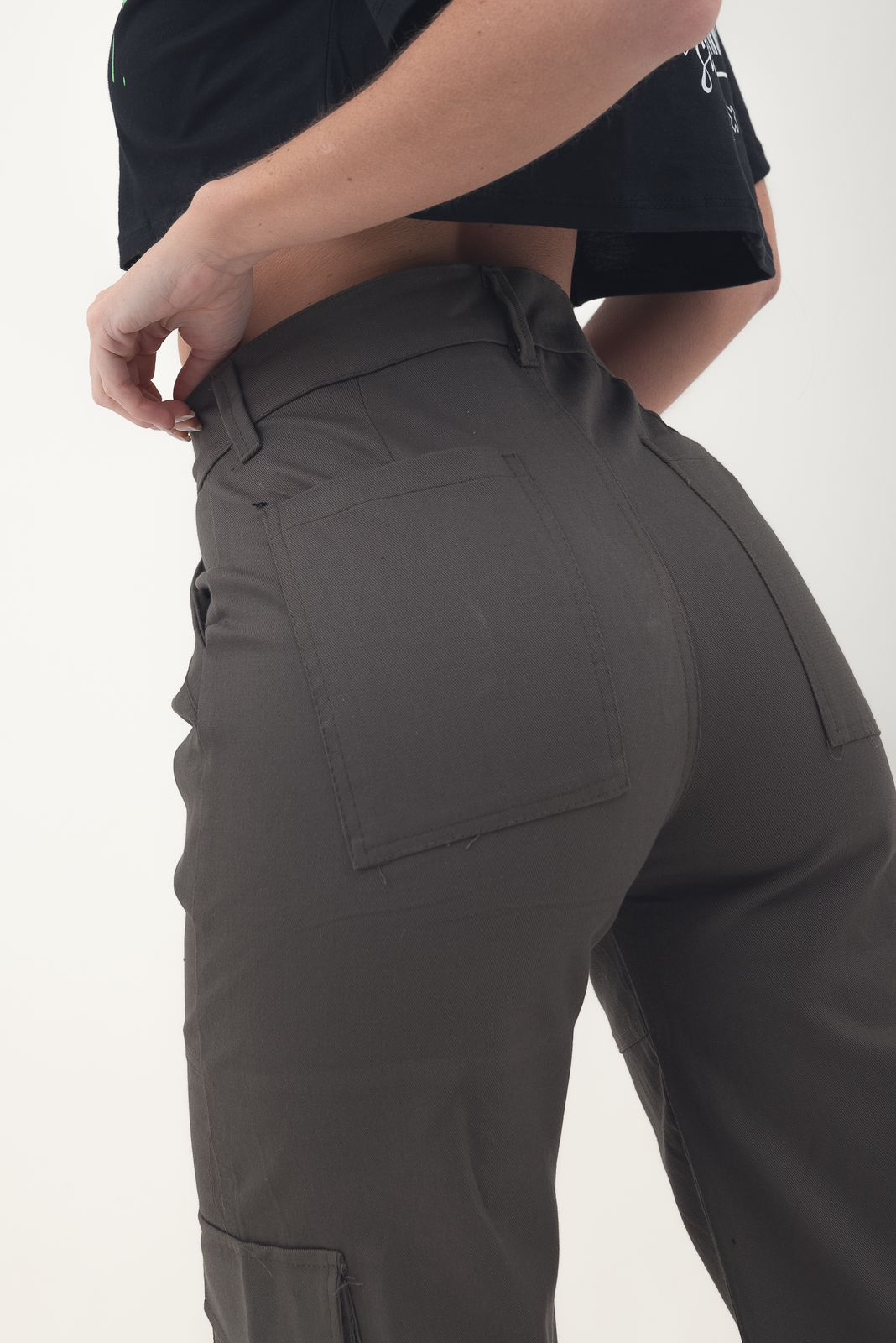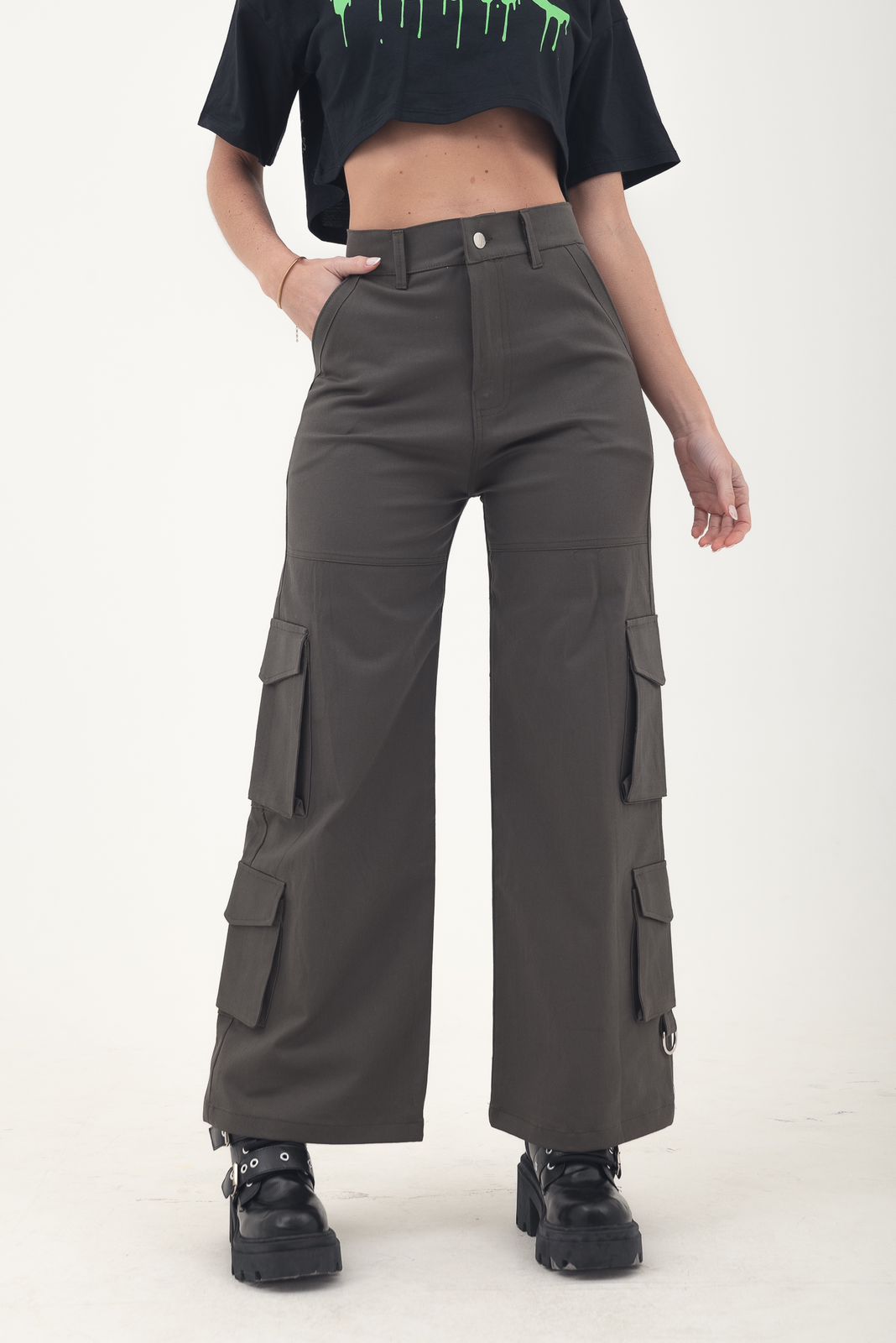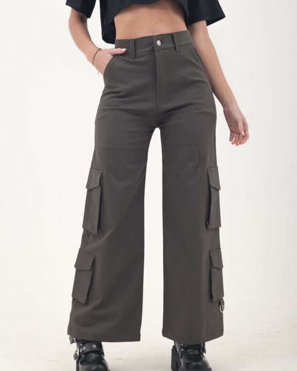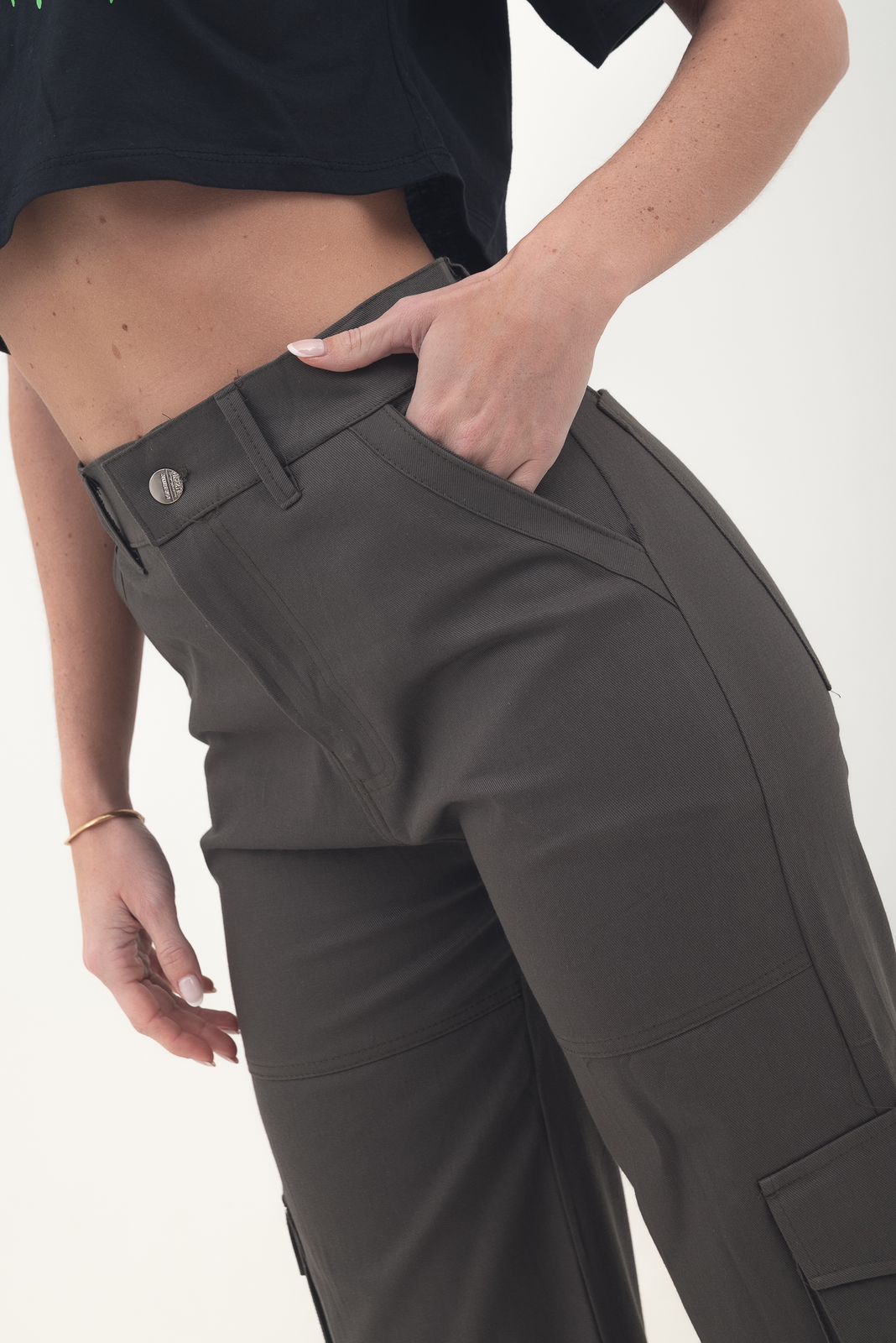 Pantalon estilo wid leg confeccionado en tela de gabardina con detalle de doble bolsillos cargo, pasacinto, cierre y boton