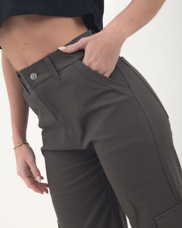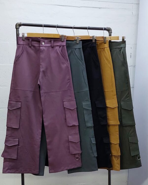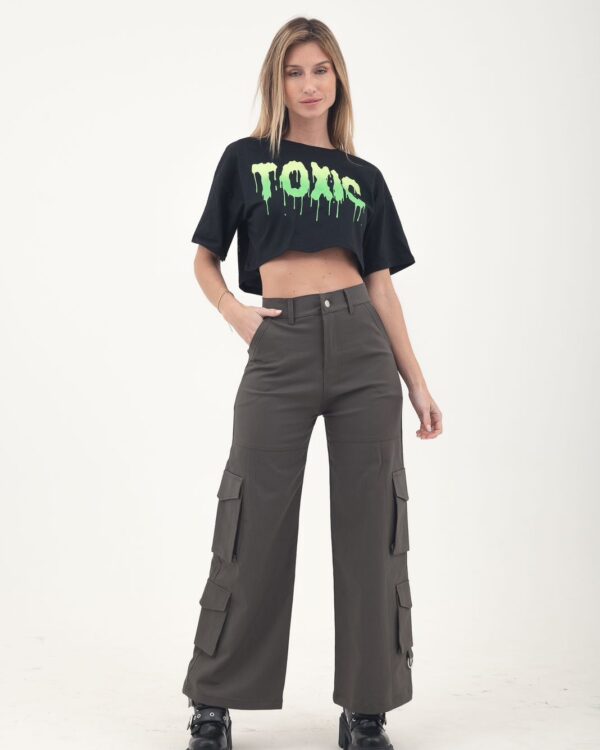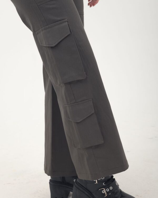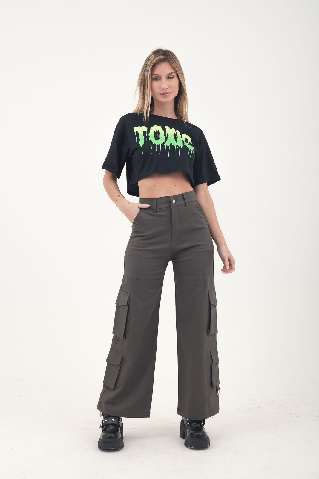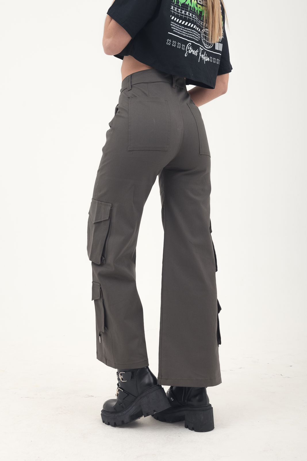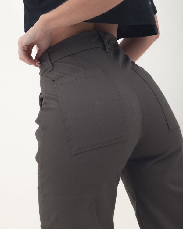 Pantalon estilo wid leg confeccionado en tela de gabardina con detalle de doble bolsillos cargo, pasacinto, cierre y boton