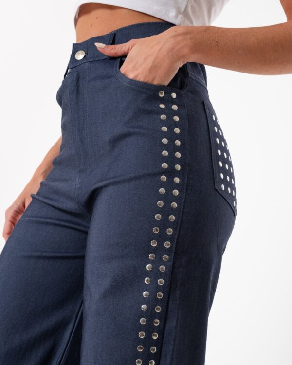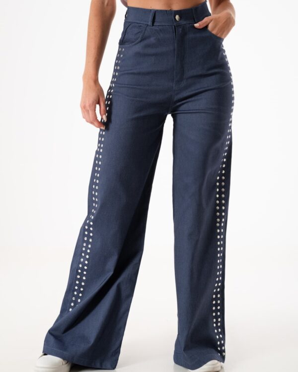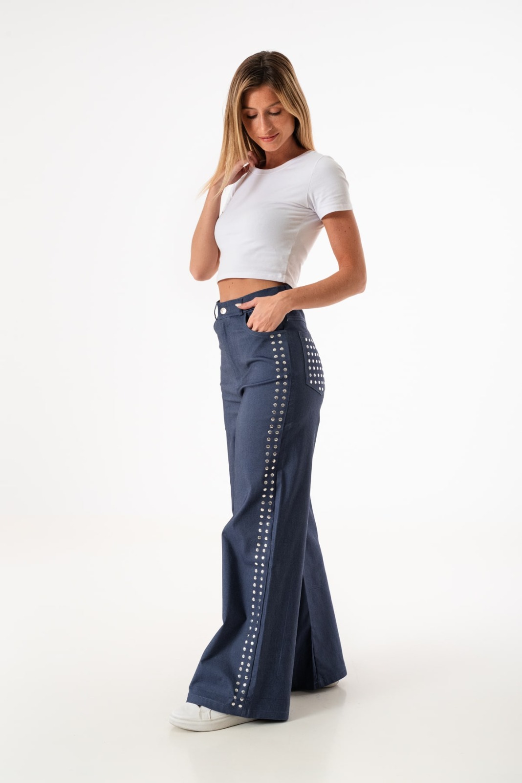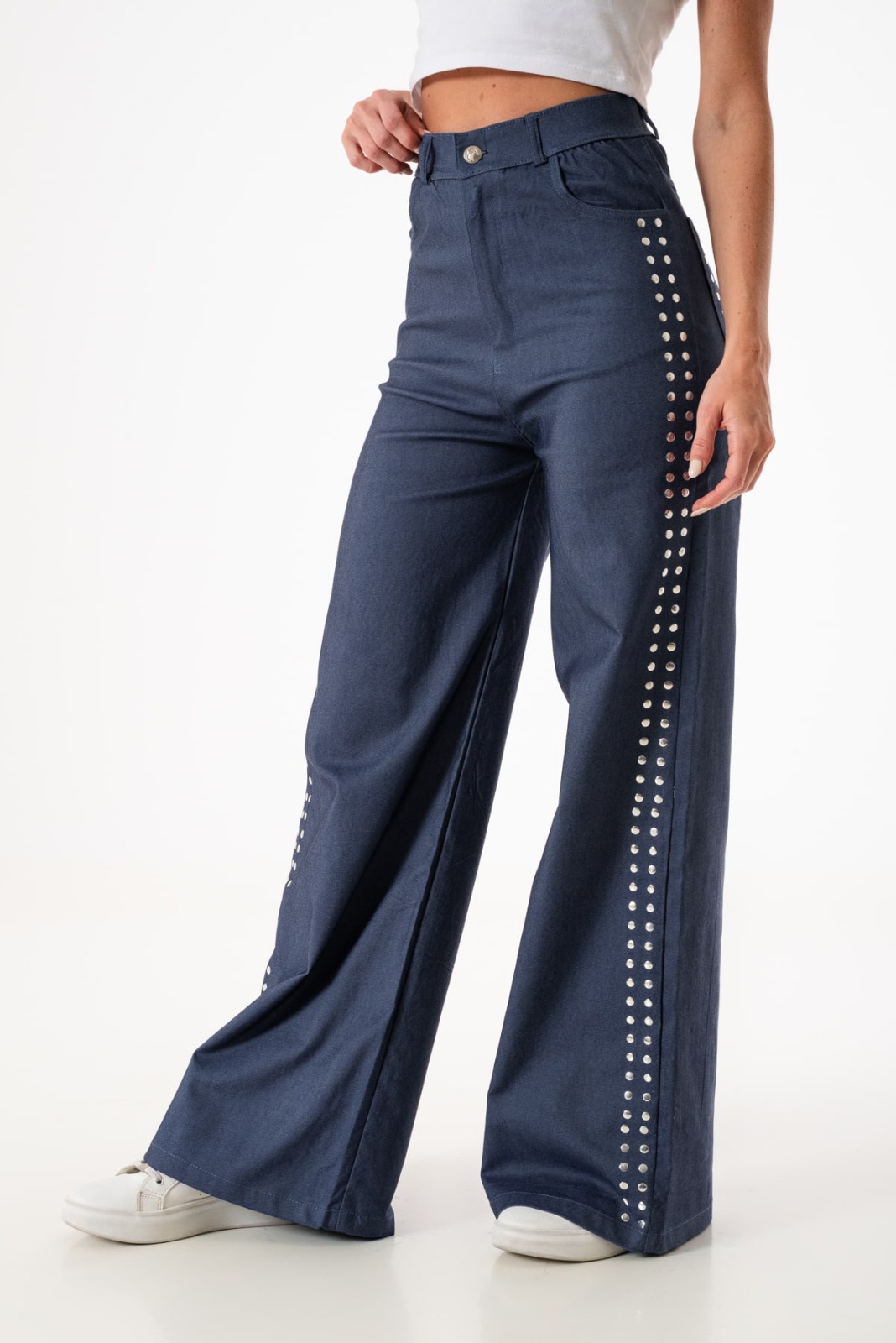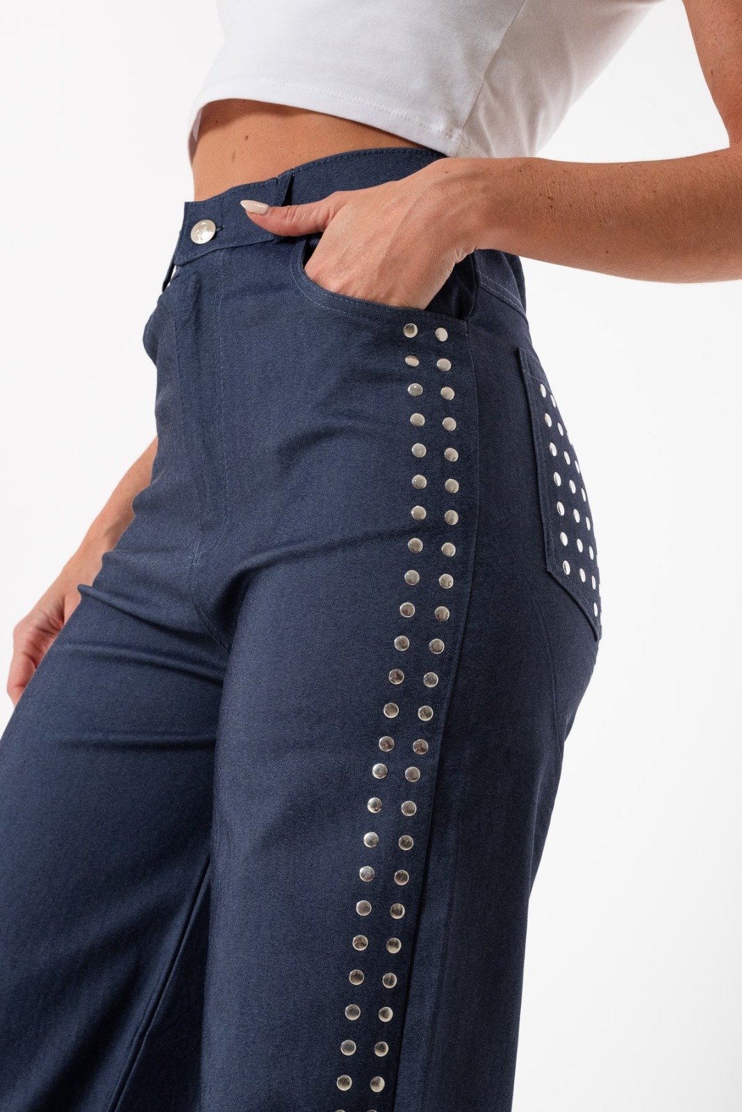 Pantalon estilo wid leg confeccionado en tela de bengalina con detalle de tachas, bolsillos, pasacinto, cierre y boton
