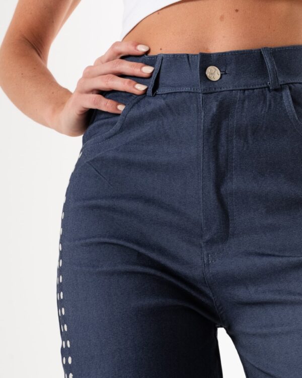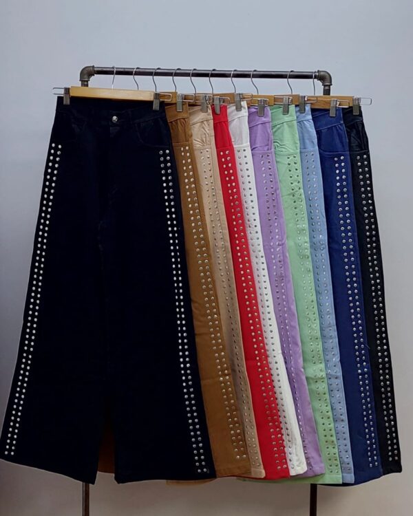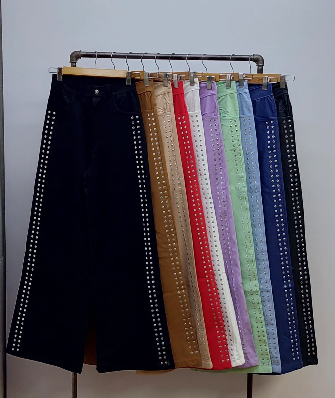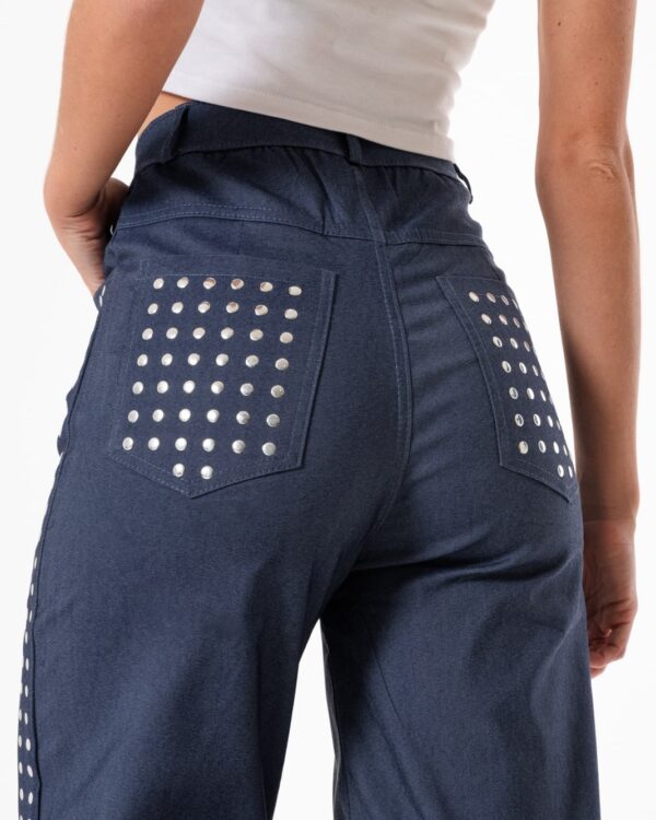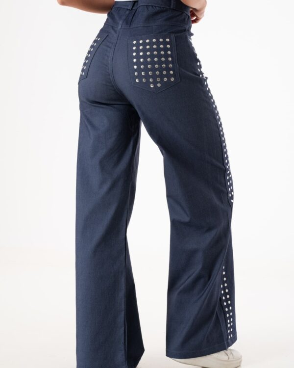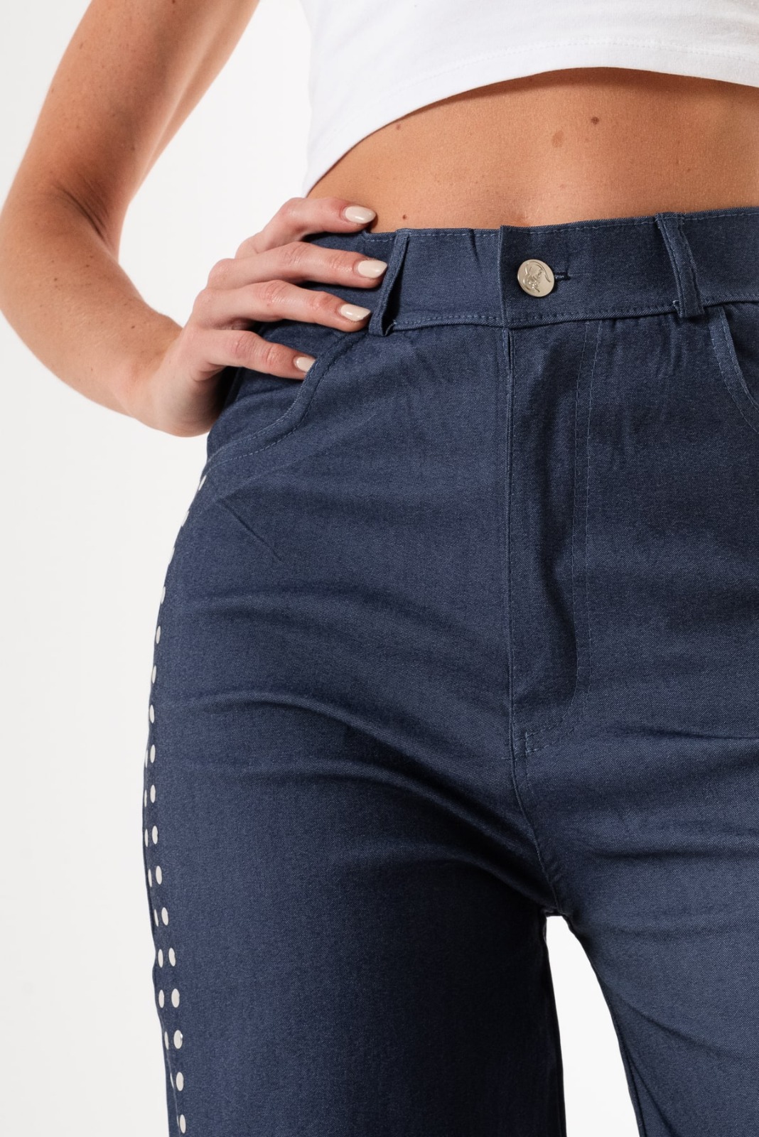 Pantalon estilo wid leg confeccionado en tela de bengalina con detalle de tachas, bolsillos, pasacinto, cierre y boton